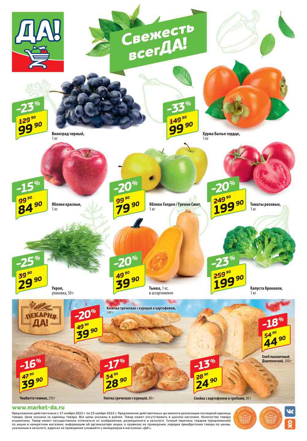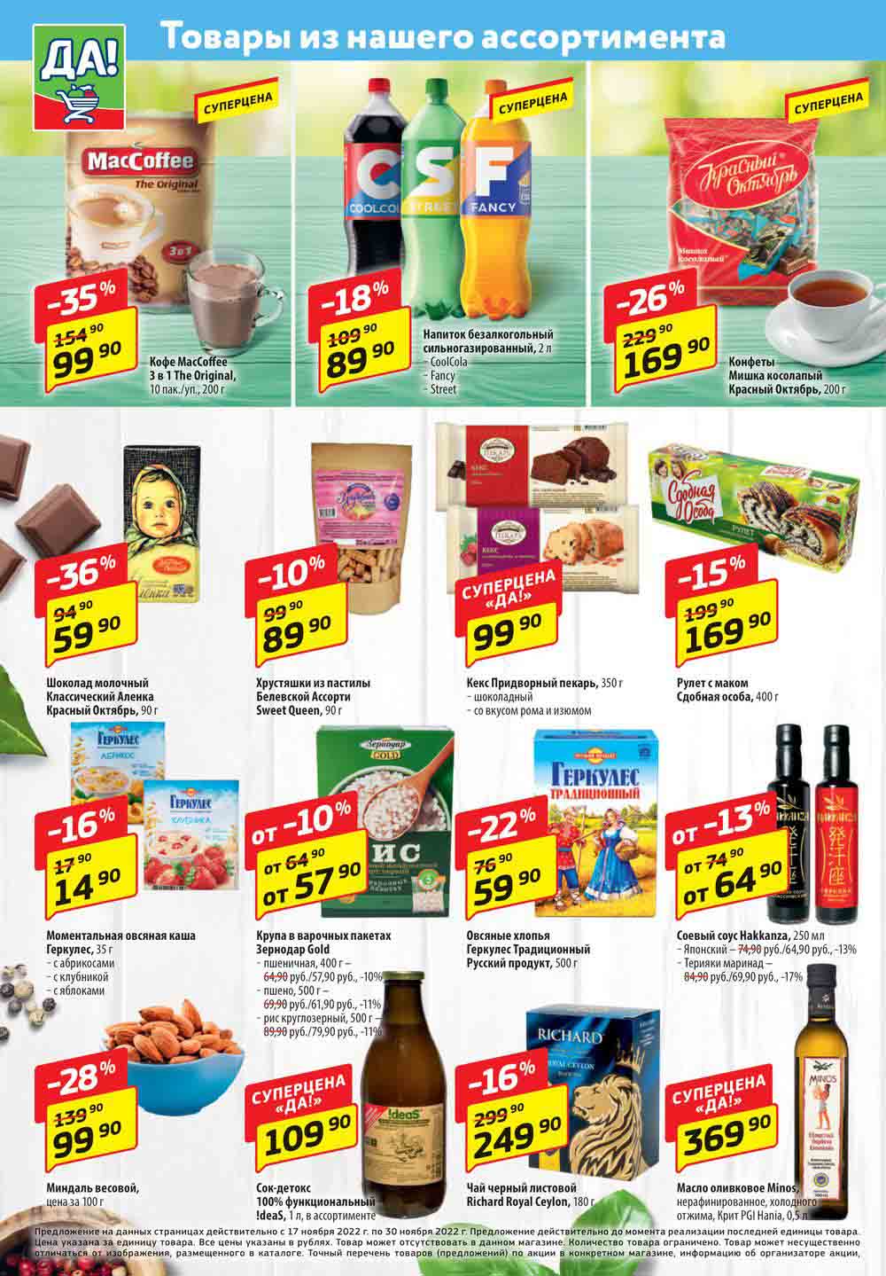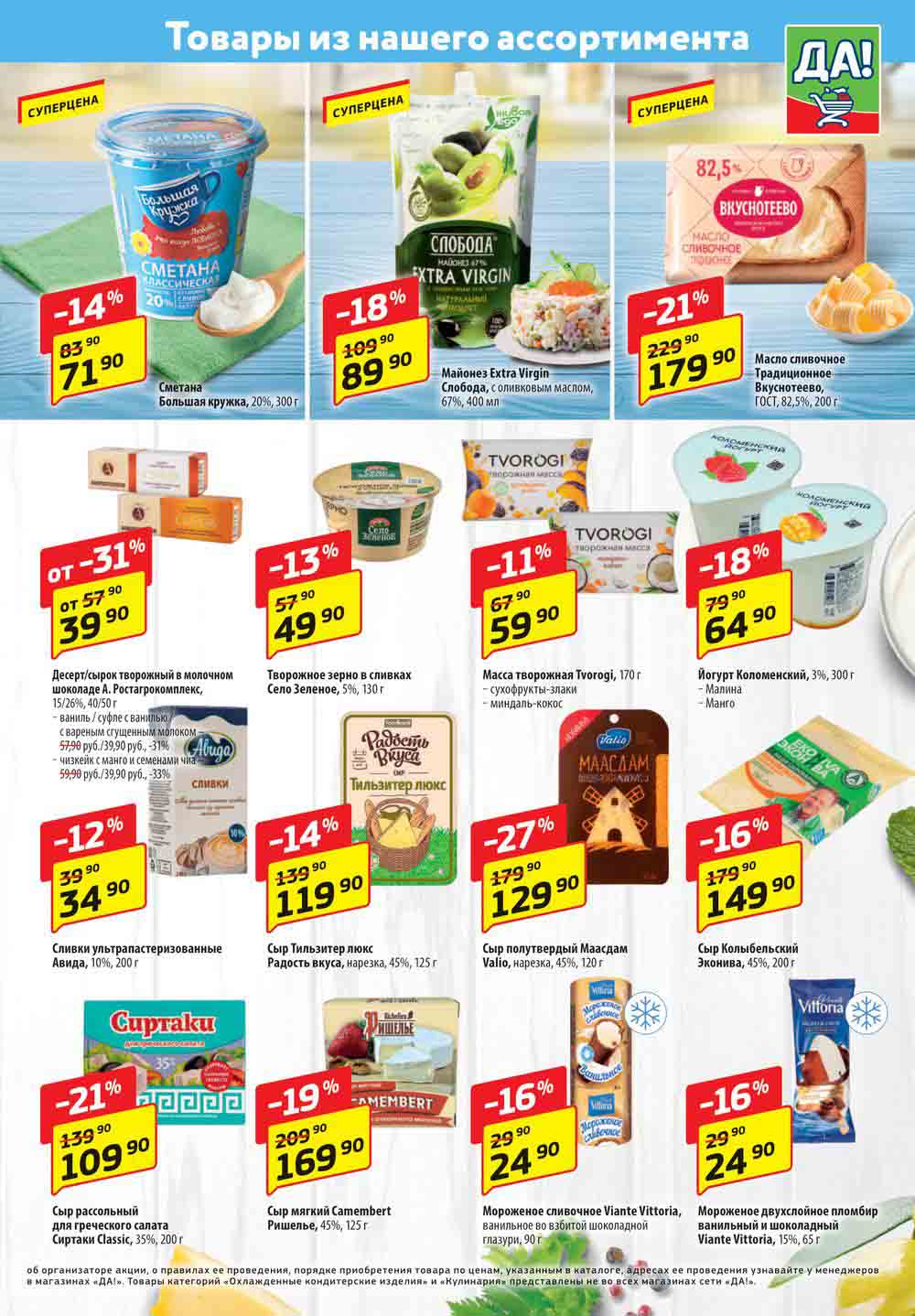 Магазин регулярно предлагает вам свои еженедельные акции и разнообразный каталог ДА! со скидкой. Уникальные возможности ожидают вас при посещении супермаркета каждую неделю. Цены по акции “Да” супермаркет, действуют в городах: Москва, Балашиха, Химки, Подольск, Королев, Мытищи, Люберцы, Электросталь, Коломна, Одинцово, Железнодорожный, Серпухов, Орехово-Зуево, Красногорск, Щелково, Сергиев Посад, Пушкино, Жуковский, Ногинск, Раменское, Клин, Воскресенск, Домодедово и многих других населенных пунктах Московского региона.