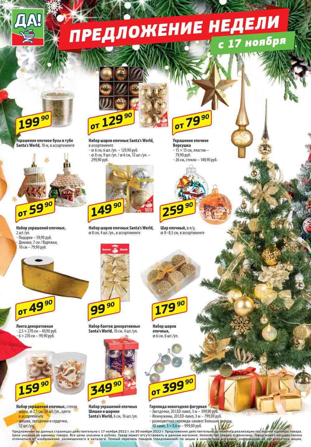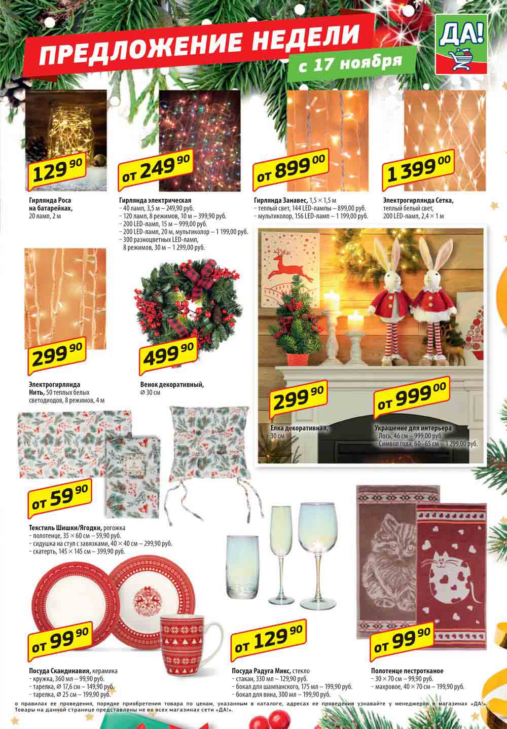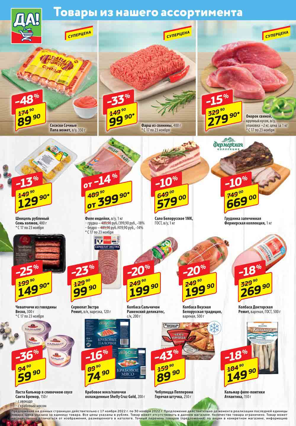 Магазин регулярно предлагает вам свои еженедельные акции и разнообразный каталог ДА! со скидкой. Уникальные возможности ожидают вас при посещении супермаркета каждую неделю. Цены по акции “Да” супермаркет, действуют в городах: Москва, Балашиха, Химки, Подольск, Королев, Мытищи, Люберцы, Электросталь, Коломна, Одинцово, Железнодорожный, Серпухов, Орехово-Зуево, Красногорск, Щелково, Сергиев Посад, Пушкино, Жуковский, Ногинск, Раменское, Клин, Воскресенск, Домодедово и многих других населенных пунктах Московского региона.