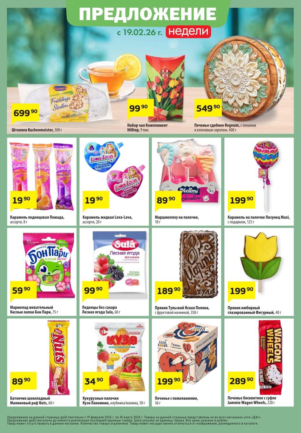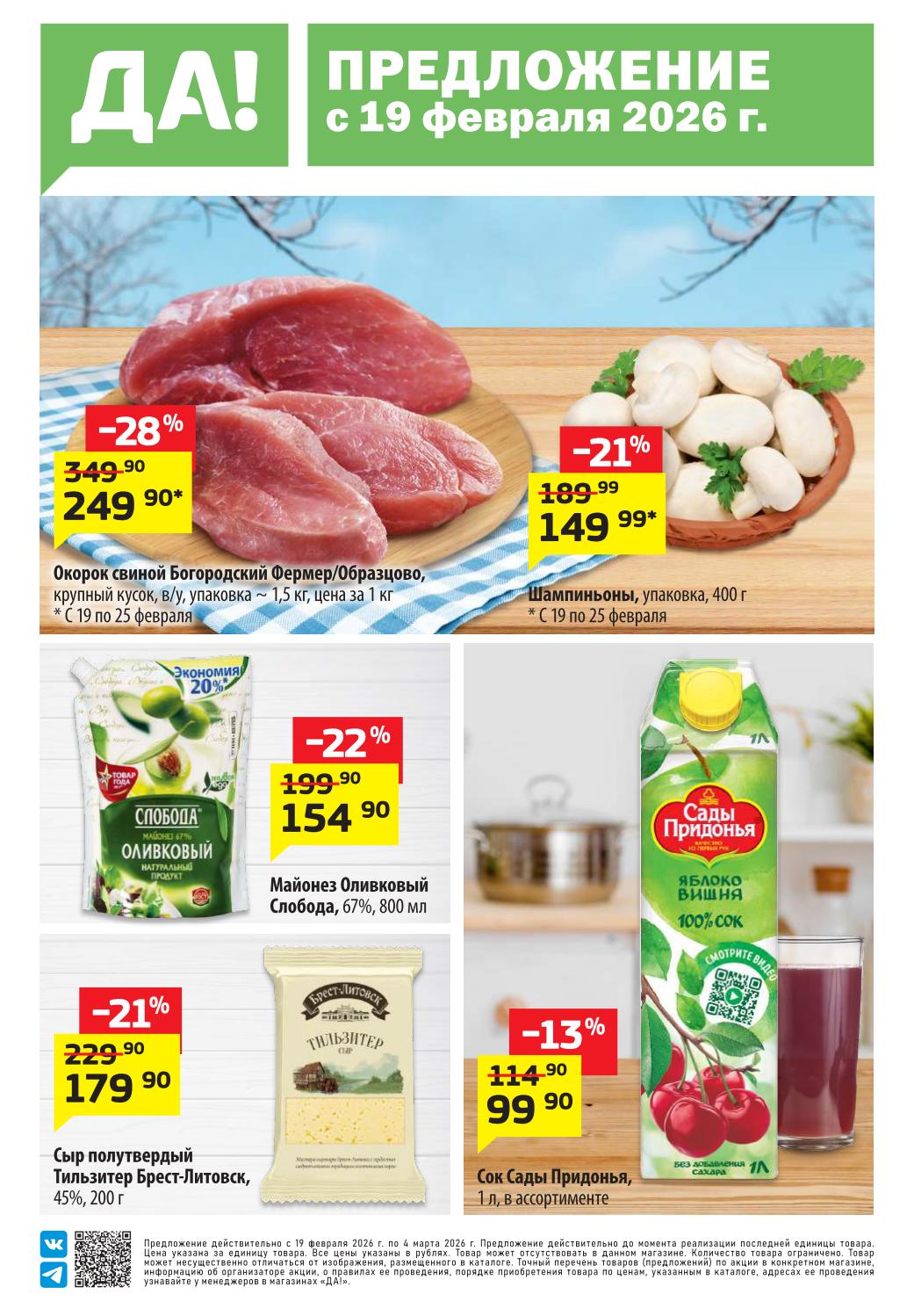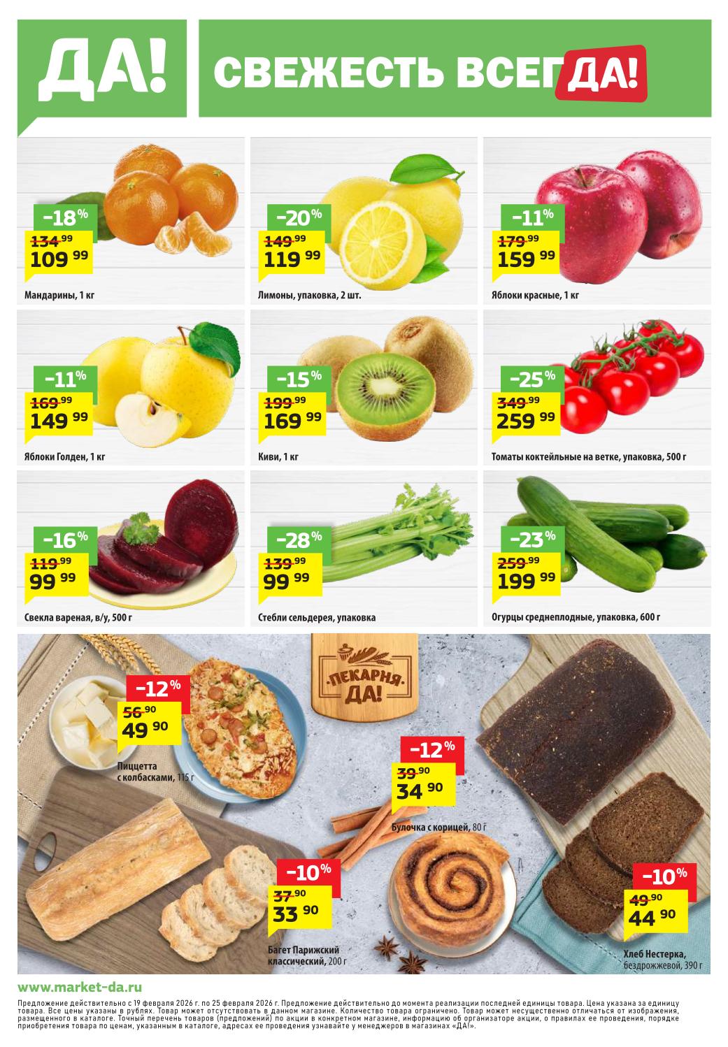 Магазин регулярно предлагает вам свои еженедельные акции и разнообразный каталог ДА! со скидкой. Уникальные возможности ожидают вас при посещении супермаркета каждую неделю. Цены по акции “Да” супермаркет, действуют в городах: Москва, Балашиха, Химки, Подольск, Королев, Мытищи, Люберцы, Электросталь, Коломна, Одинцово, Железнодорожный, Серпухов, Орехово-Зуево, Красногорск, Щелково, Сергиев Посад, Пушкино, Жуковский, Ногинск, Раменское, Клин, Воскресенск, Домодедово и многих других населенных пунктах Московского региона.