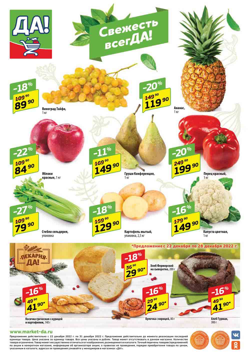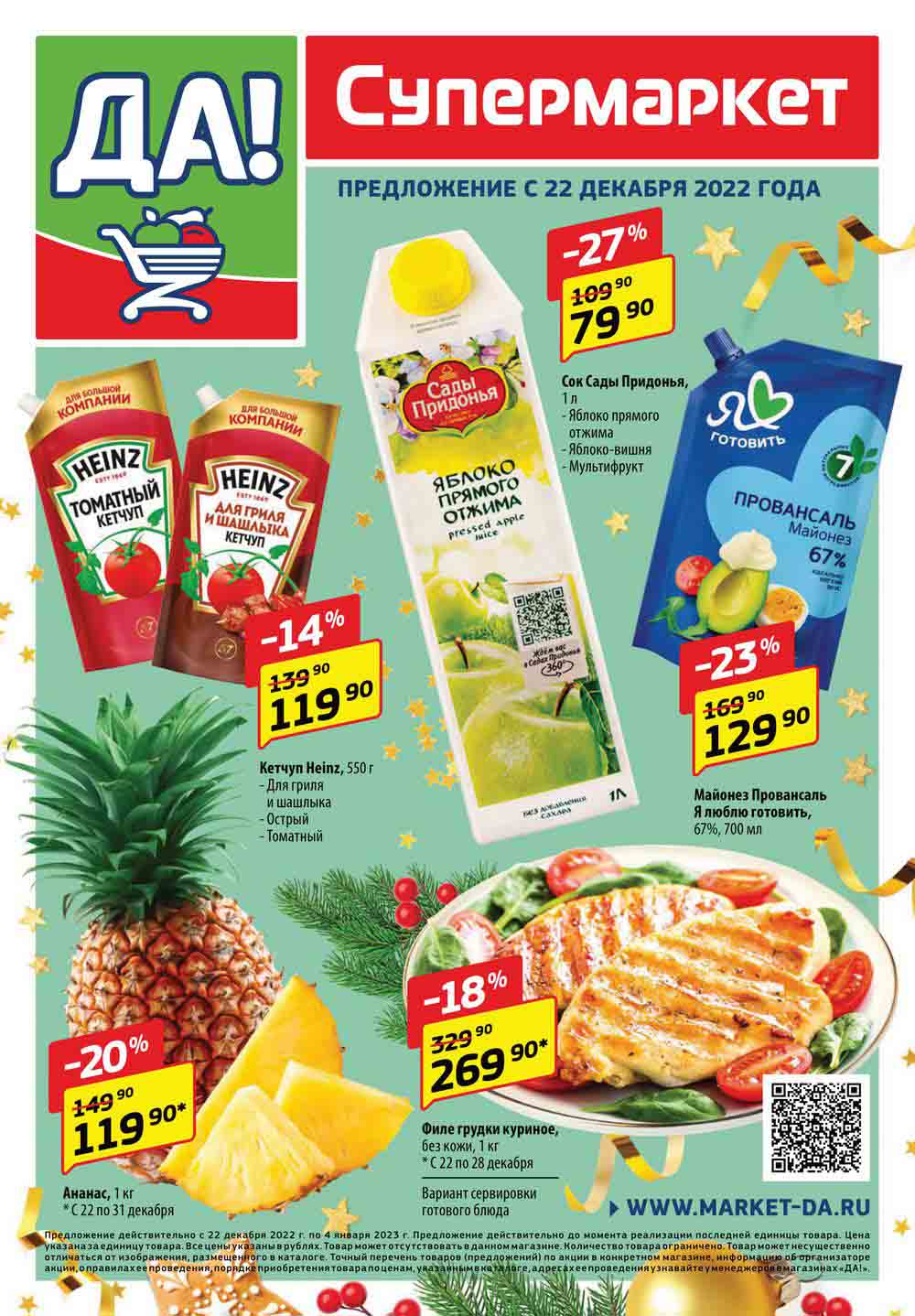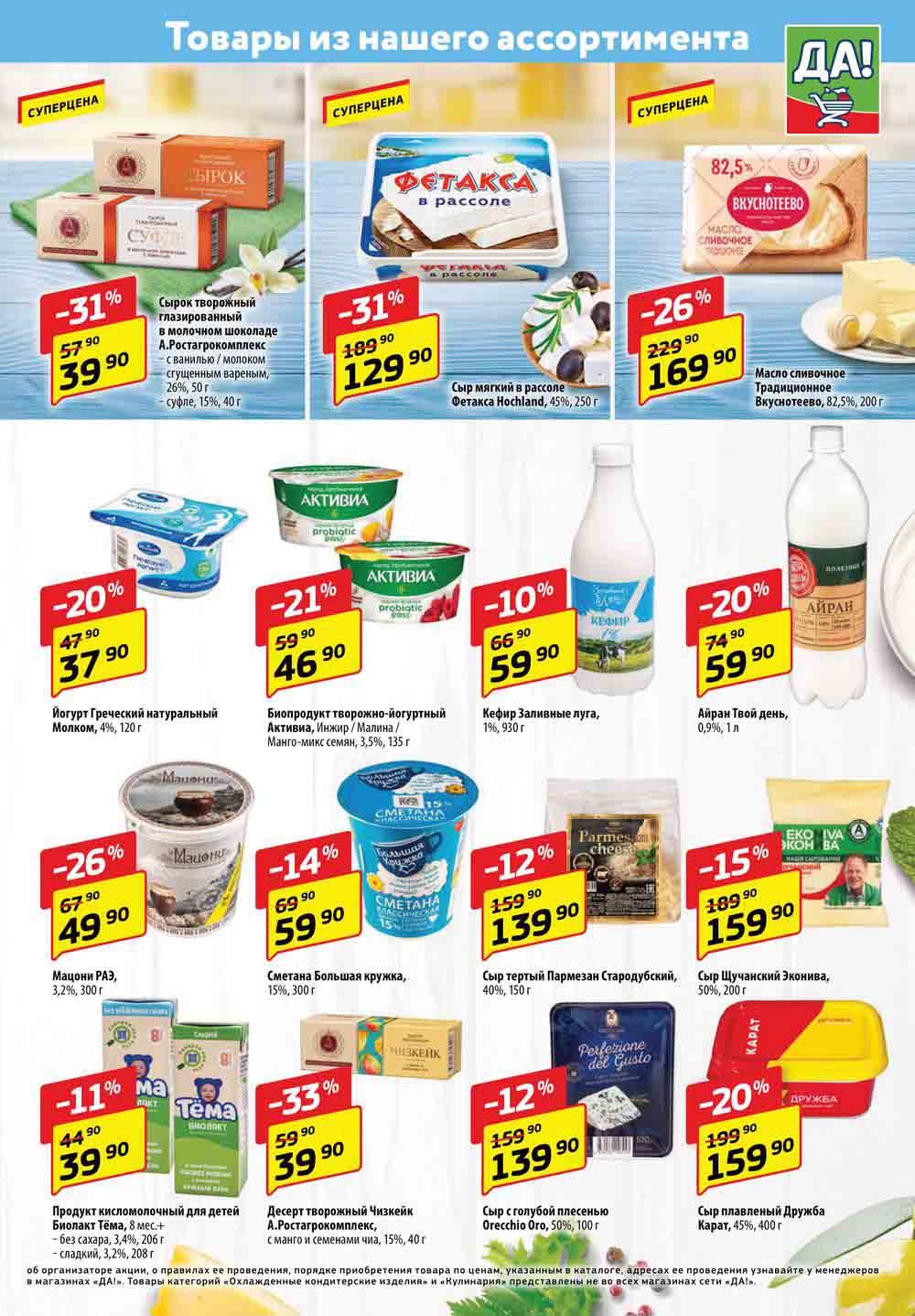 Магазин регулярно предлагает вам свои еженедельные акции и разнообразный каталог ДА! со скидкой. Уникальные возможности ожидают вас при посещении супермаркета каждую неделю. Цены по акции “Да” супермаркет, действуют в городах: Москва, Балашиха, Химки, Подольск, Королев, Мытищи, Люберцы, Электросталь, Коломна, Одинцово, Железнодорожный, Серпухов, Орехово-Зуево, Красногорск, Щелково, Сергиев Посад, Пушкино, Жуковский, Ногинск, Раменское, Клин, Воскресенск, Домодедово и многих других населенных пунктах Московского региона.