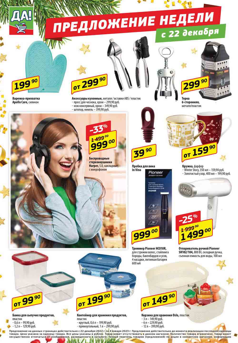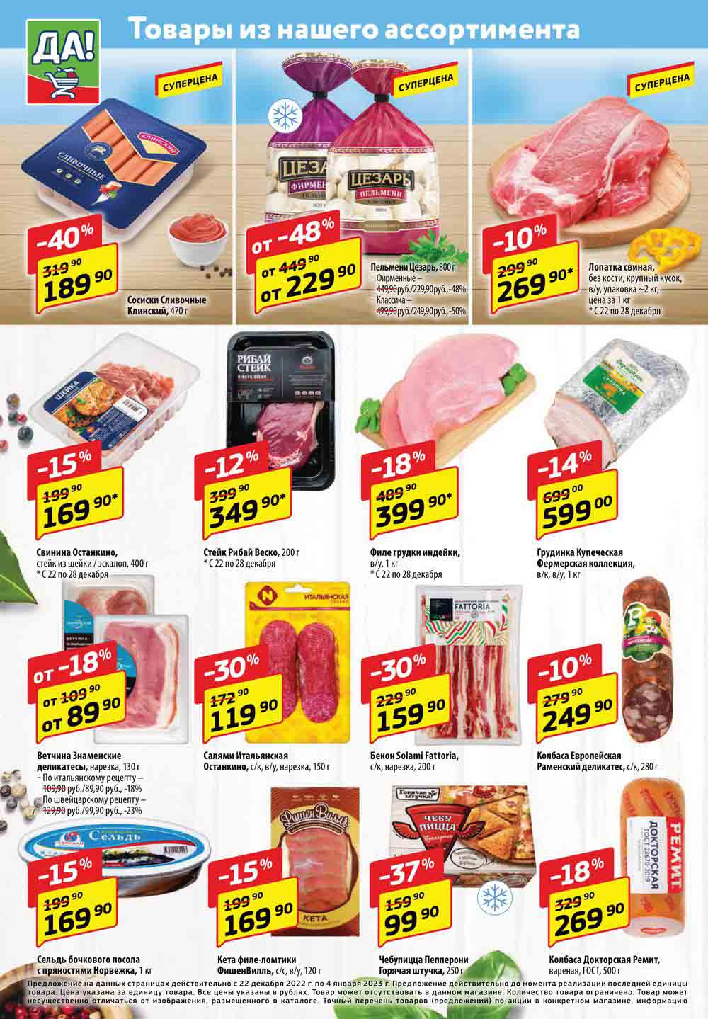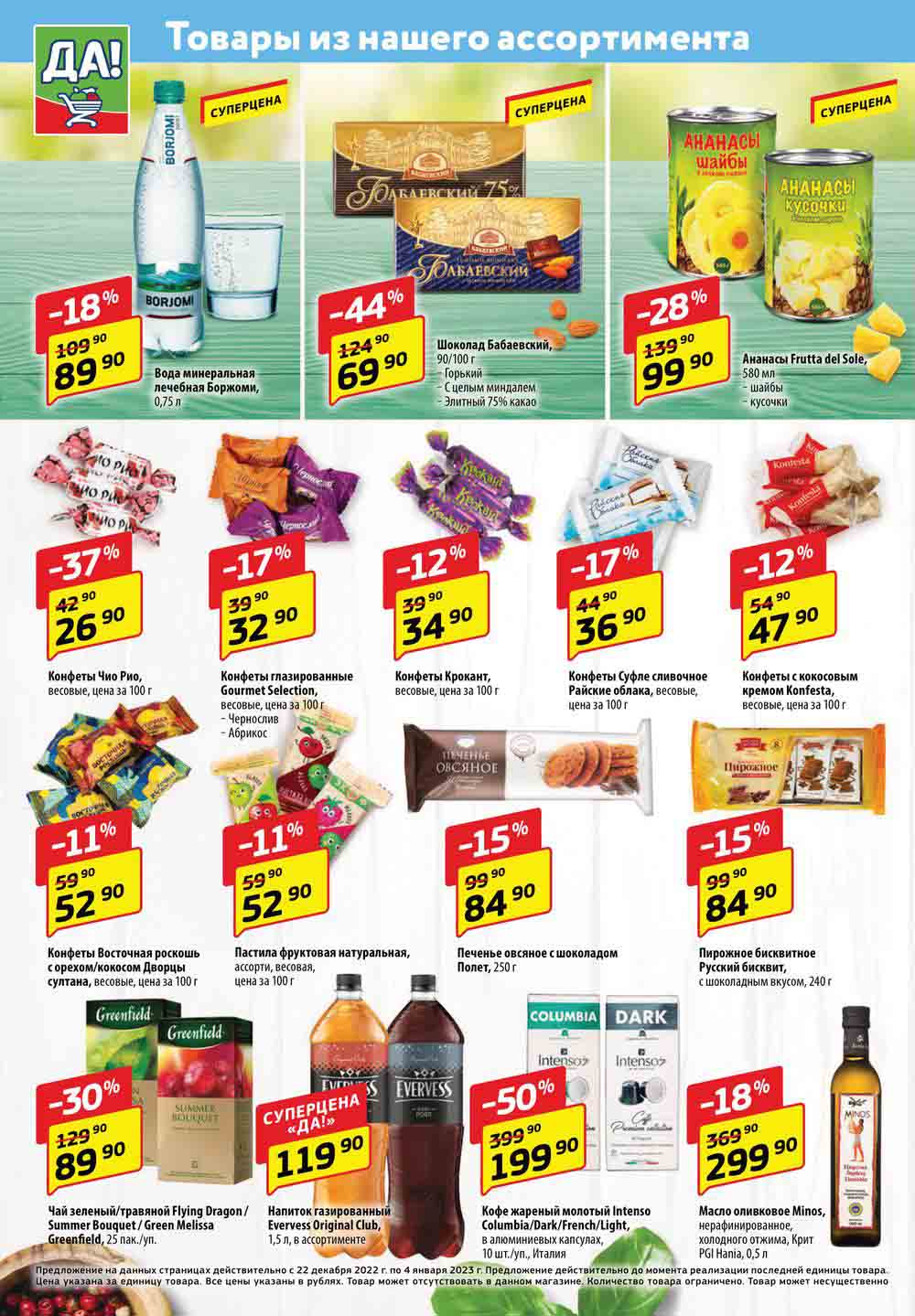 Магазин регулярно предлагает вам свои еженедельные акции и разнообразный каталог ДА! со скидкой. Уникальные возможности ожидают вас при посещении супермаркета каждую неделю. Цены по акции “Да” супермаркет, действуют в городах: Москва, Балашиха, Химки, Подольск, Королев, Мытищи, Люберцы, Электросталь, Коломна, Одинцово, Железнодорожный, Серпухов, Орехово-Зуево, Красногорск, Щелково, Сергиев Посад, Пушкино, Жуковский, Ногинск, Раменское, Клин, Воскресенск, Домодедово и многих других населенных пунктах Московского региона.