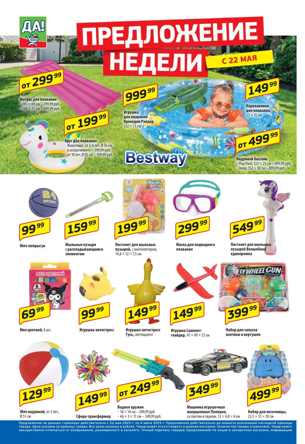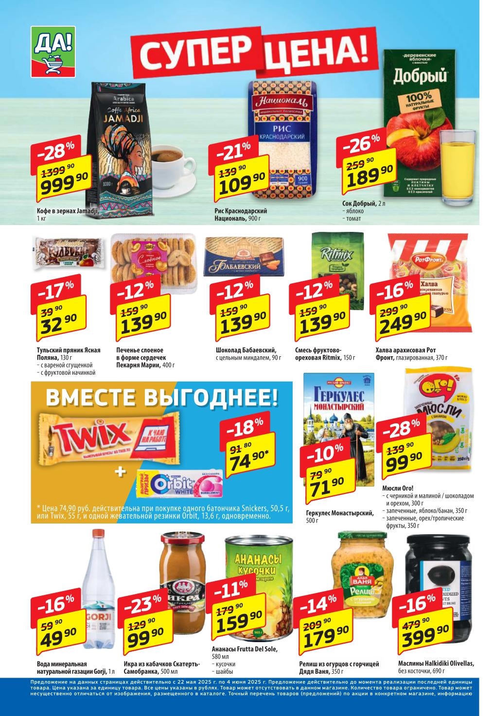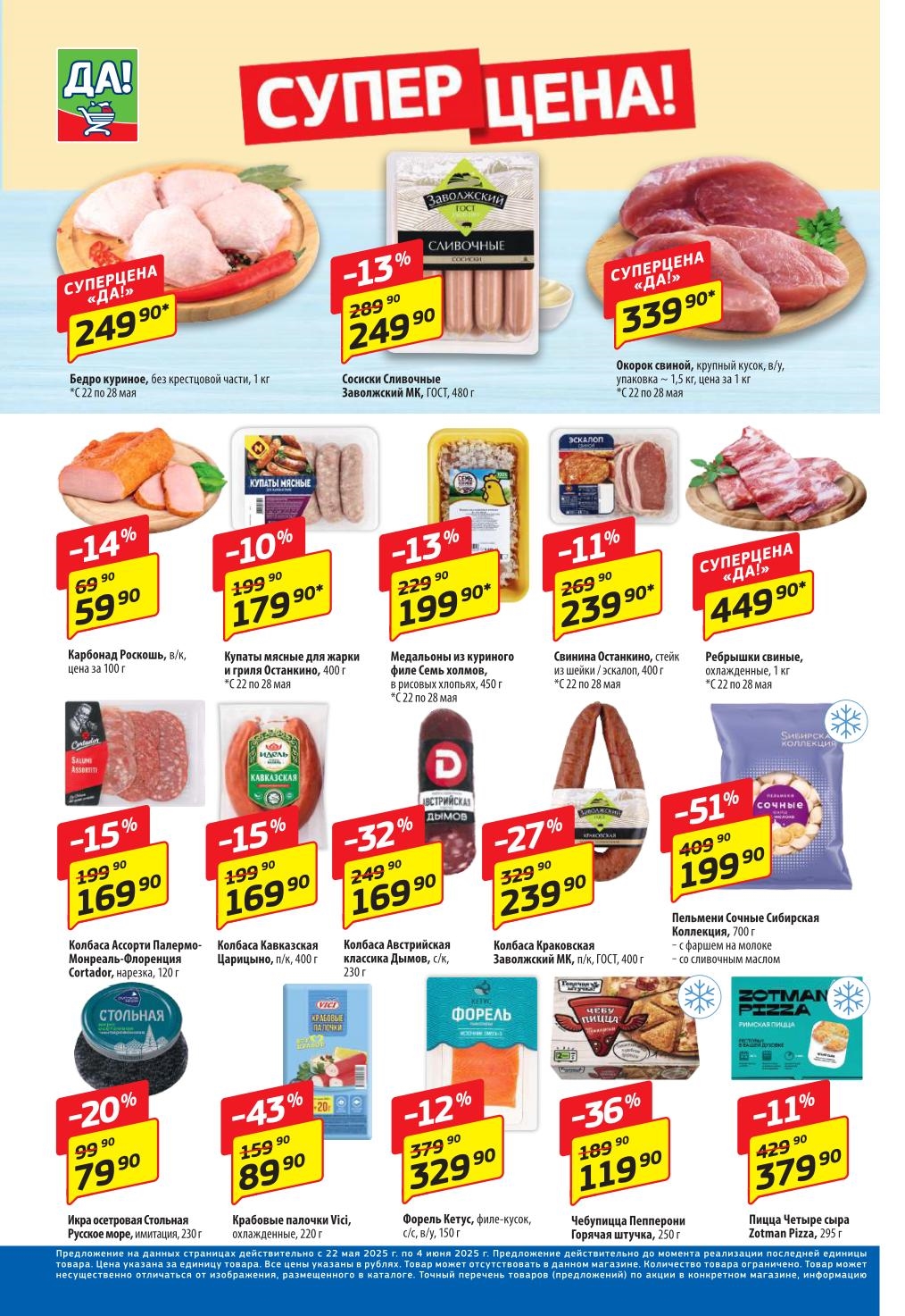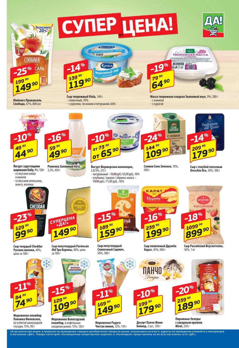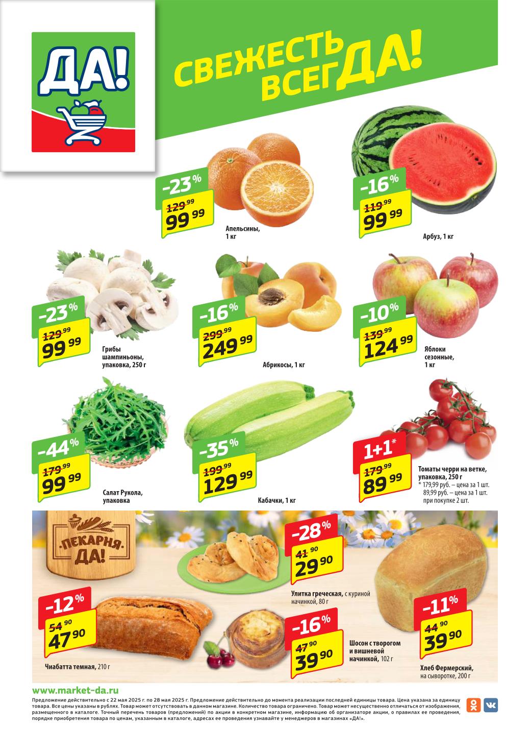 Магазин регулярно предлагает вам свои еженедельные акции и разнообразный каталог ДА! со скидкой. Уникальные возможности ожидают вас при посещении супермаркета каждую неделю. Цены по акции “Да” супермаркет, действуют в городах: Москва, Балашиха, Химки, Подольск, Королев, Мытищи, Люберцы, Электросталь, Коломна, Одинцово, Железнодорожный, Серпухов, Орехово-Зуево, Красногорск, Щелково, Сергиев Посад, Пушкино, Жуковский, Ногинск, Раменское, Клин, Воскресенск, Домодедово и многих других населенных пунктах Московского региона.