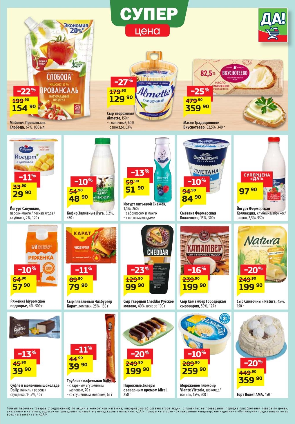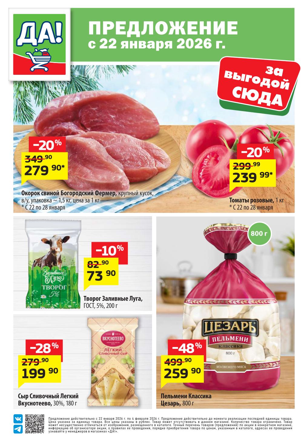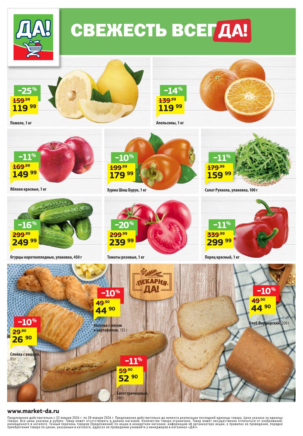 Магазин регулярно предлагает вам свои еженедельные акции и разнообразный каталог ДА! со скидкой. Уникальные возможности ожидают вас при посещении супермаркета каждую неделю. Цены по акции “Да” супермаркет, действуют в городах: Москва, Балашиха, Химки, Подольск, Королев, Мытищи, Люберцы, Электросталь, Коломна, Одинцово, Железнодорожный, Серпухов, Орехово-Зуево, Красногорск, Щелково, Сергиев Посад, Пушкино, Жуковский, Ногинск, Раменское, Клин, Воскресенск, Домодедово и многих других населенных пунктах Московского региона.
