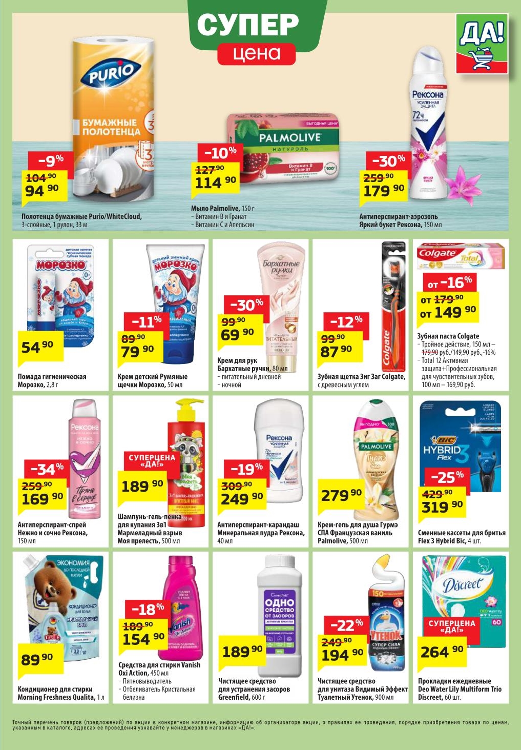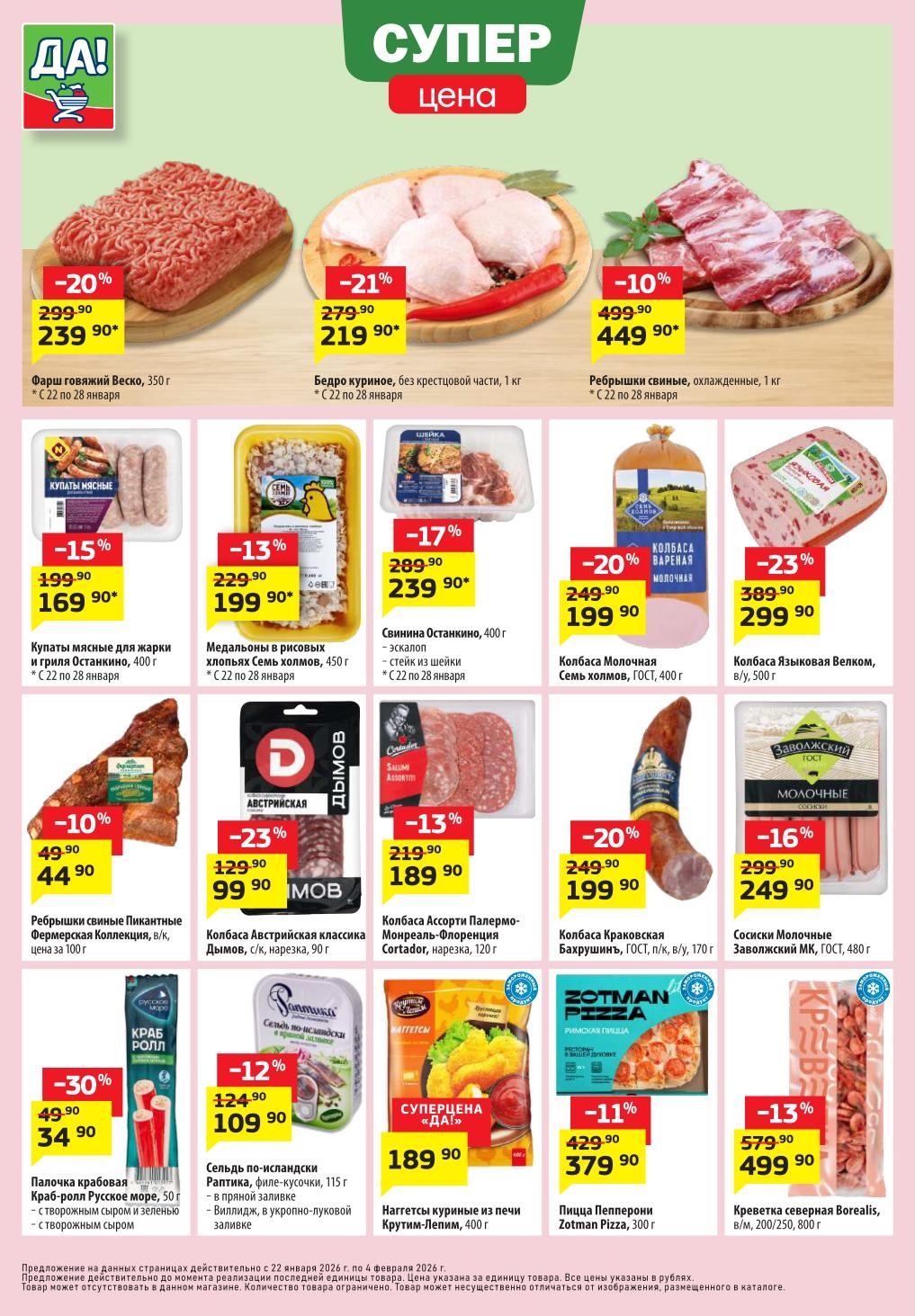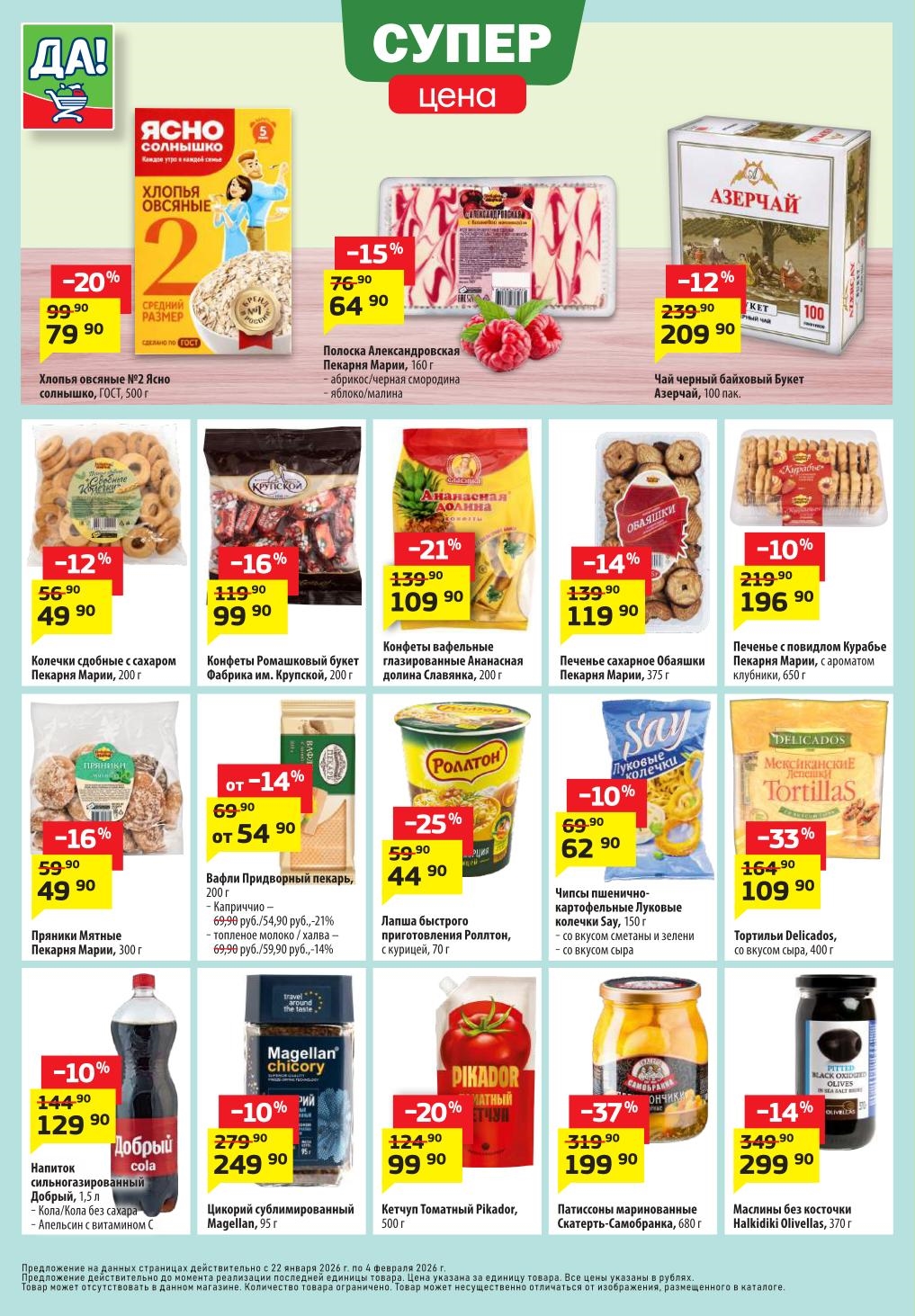 Магазин регулярно предлагает вам свои еженедельные акции и разнообразный каталог ДА! со скидкой. Уникальные возможности ожидают вас при посещении супермаркета каждую неделю. Цены по акции “Да” супермаркет, действуют в городах: Москва, Балашиха, Химки, Подольск, Королев, Мытищи, Люберцы, Электросталь, Коломна, Одинцово, Железнодорожный, Серпухов, Орехово-Зуево, Красногорск, Щелково, Сергиев Посад, Пушкино, Жуковский, Ногинск, Раменское, Клин, Воскресенск, Домодедово и многих других населенных пунктах Московского региона.