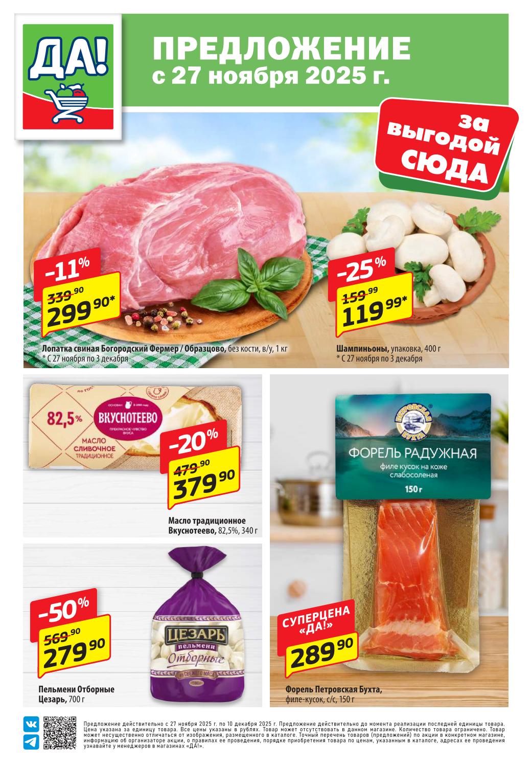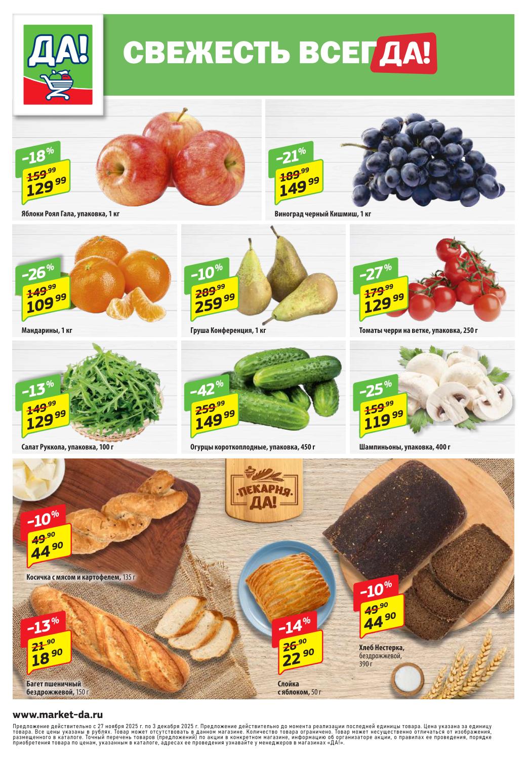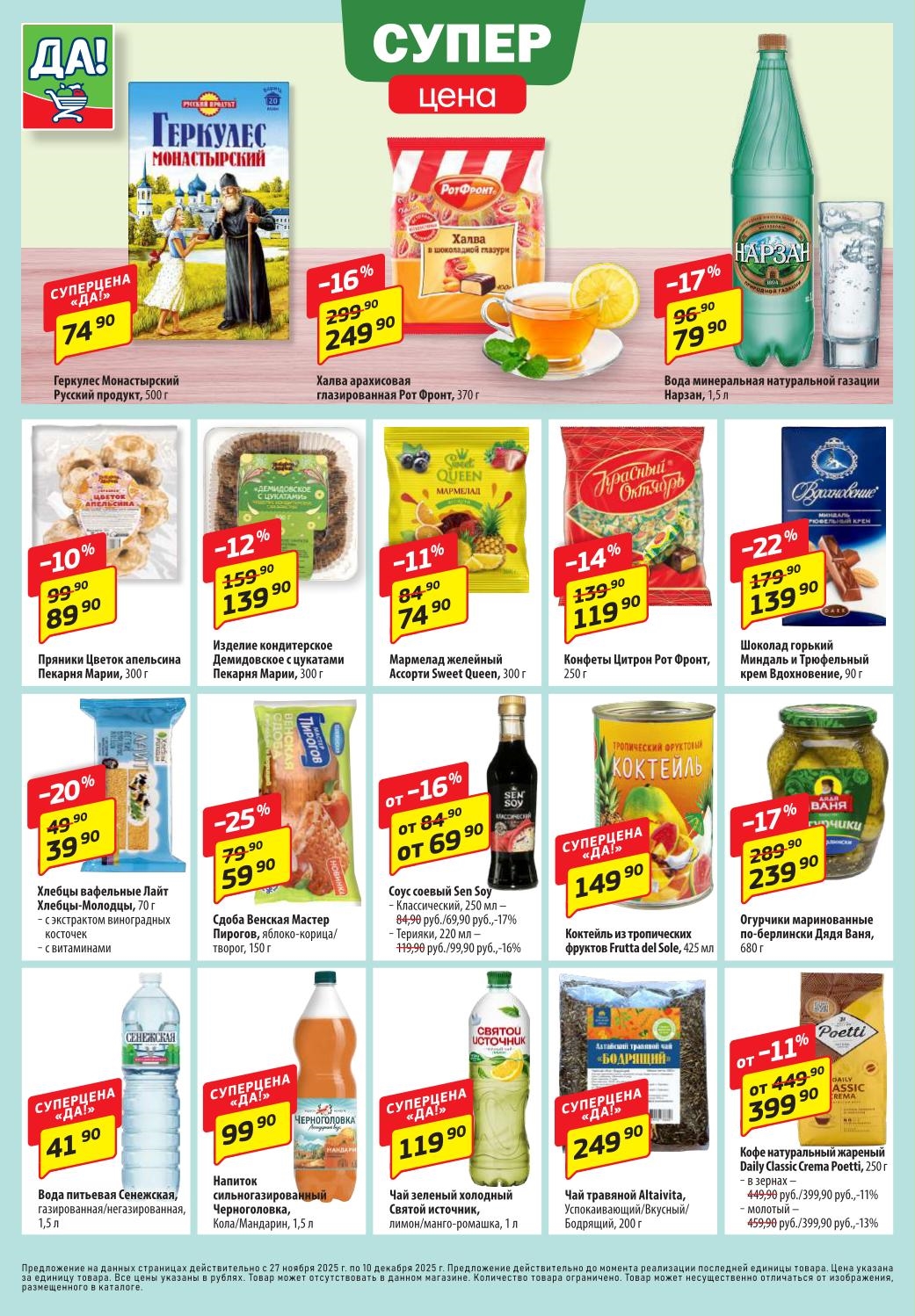 Магазин регулярно предлагает вам свои еженедельные акции и разнообразный каталог ДА! со скидкой. Уникальные возможности ожидают вас при посещении супермаркета каждую неделю. Цены по акции “Да” супермаркет, действуют в городах: Москва, Балашиха, Химки, Подольск, Королев, Мытищи, Люберцы, Электросталь, Коломна, Одинцово, Железнодорожный, Серпухов, Орехово-Зуево, Красногорск, Щелково, Сергиев Посад, Пушкино, Жуковский, Ногинск, Раменское, Клин, Воскресенск, Домодедово и многих других населенных пунктах Московского региона.