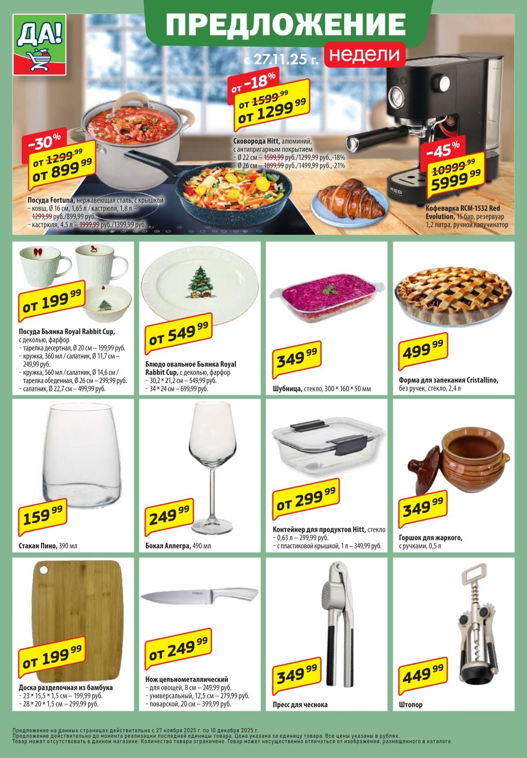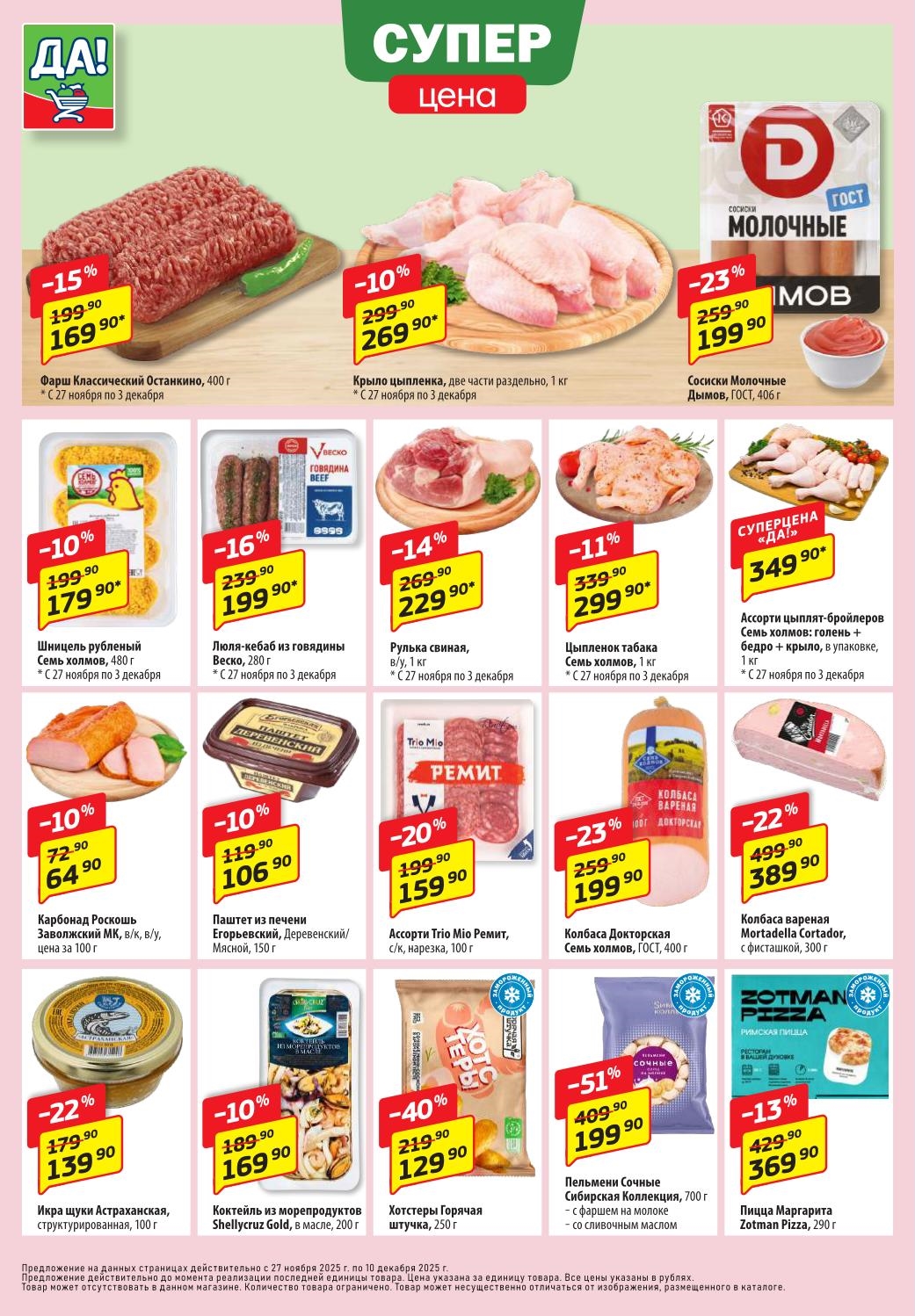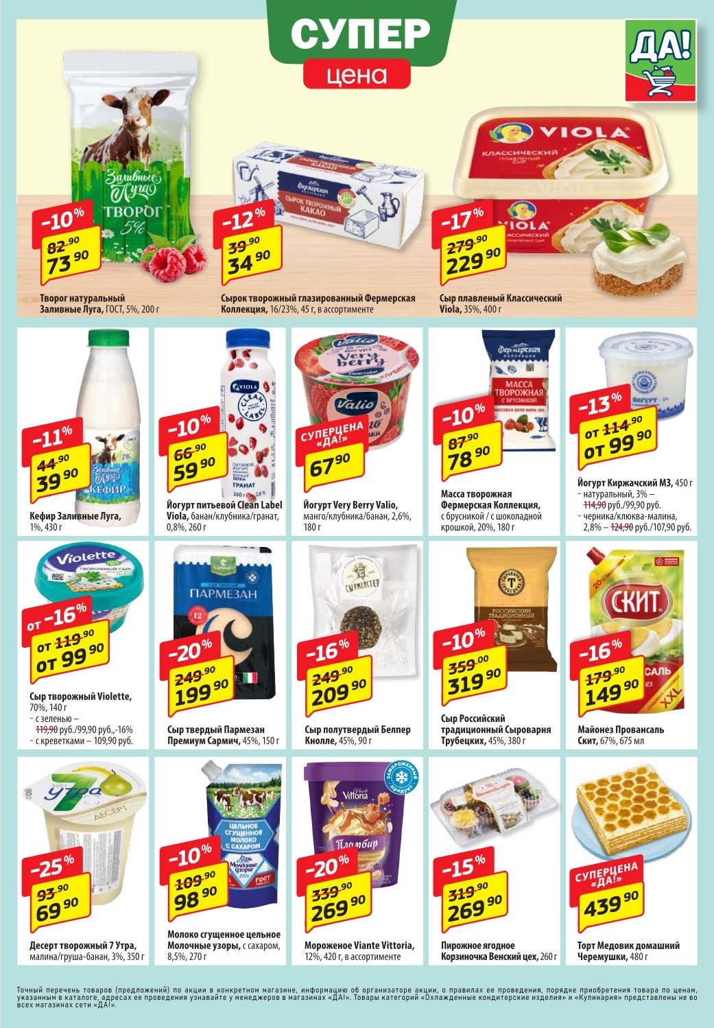 Магазин регулярно предлагает вам свои еженедельные акции и разнообразный каталог ДА! со скидкой. Уникальные возможности ожидают вас при посещении супермаркета каждую неделю. Цены по акции “Да” супермаркет, действуют в городах: Москва, Балашиха, Химки, Подольск, Королев, Мытищи, Люберцы, Электросталь, Коломна, Одинцово, Железнодорожный, Серпухов, Орехово-Зуево, Красногорск, Щелково, Сергиев Посад, Пушкино, Жуковский, Ногинск, Раменское, Клин, Воскресенск, Домодедово и многих других населенных пунктах Московского региона.