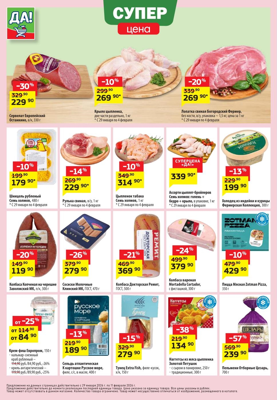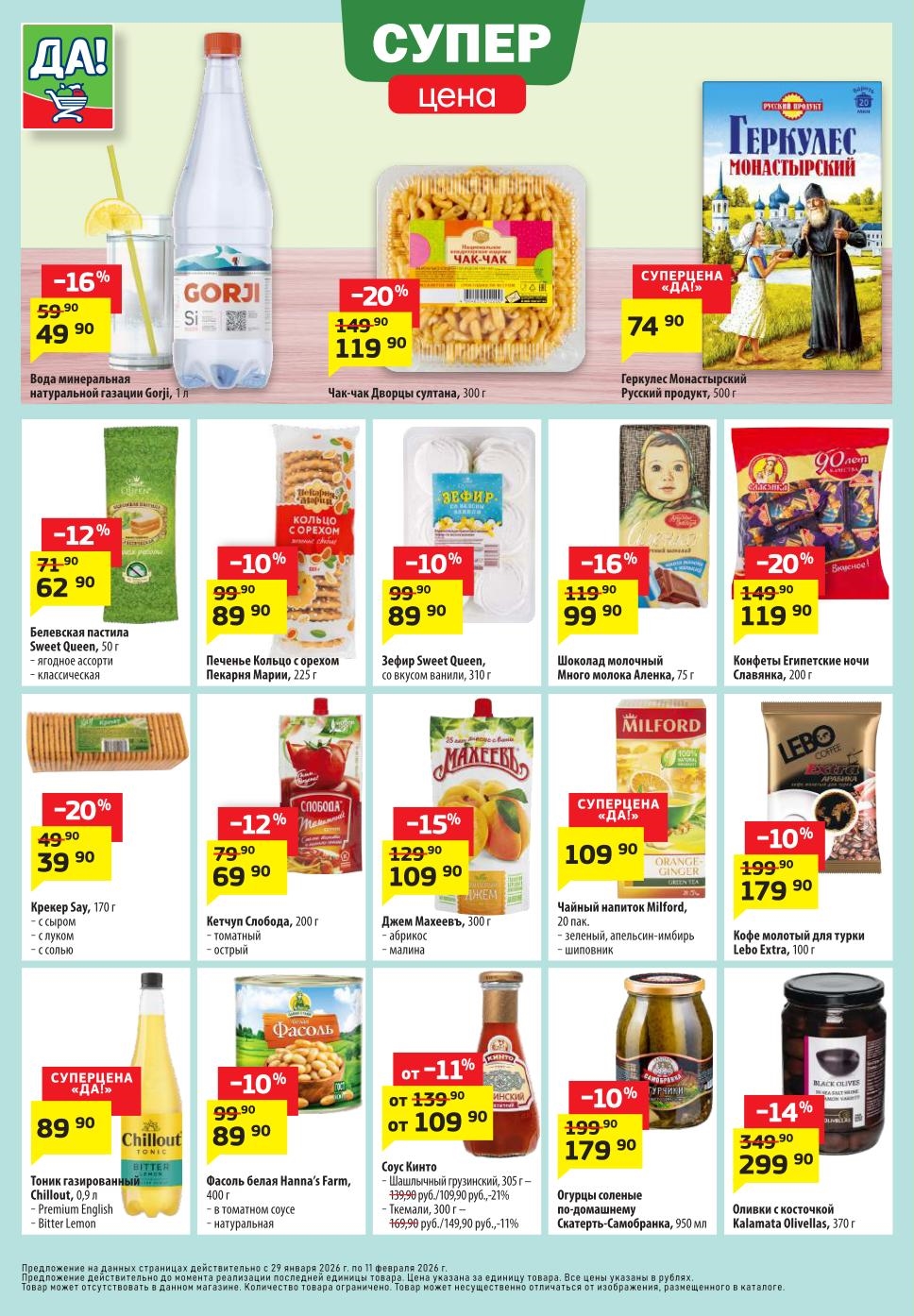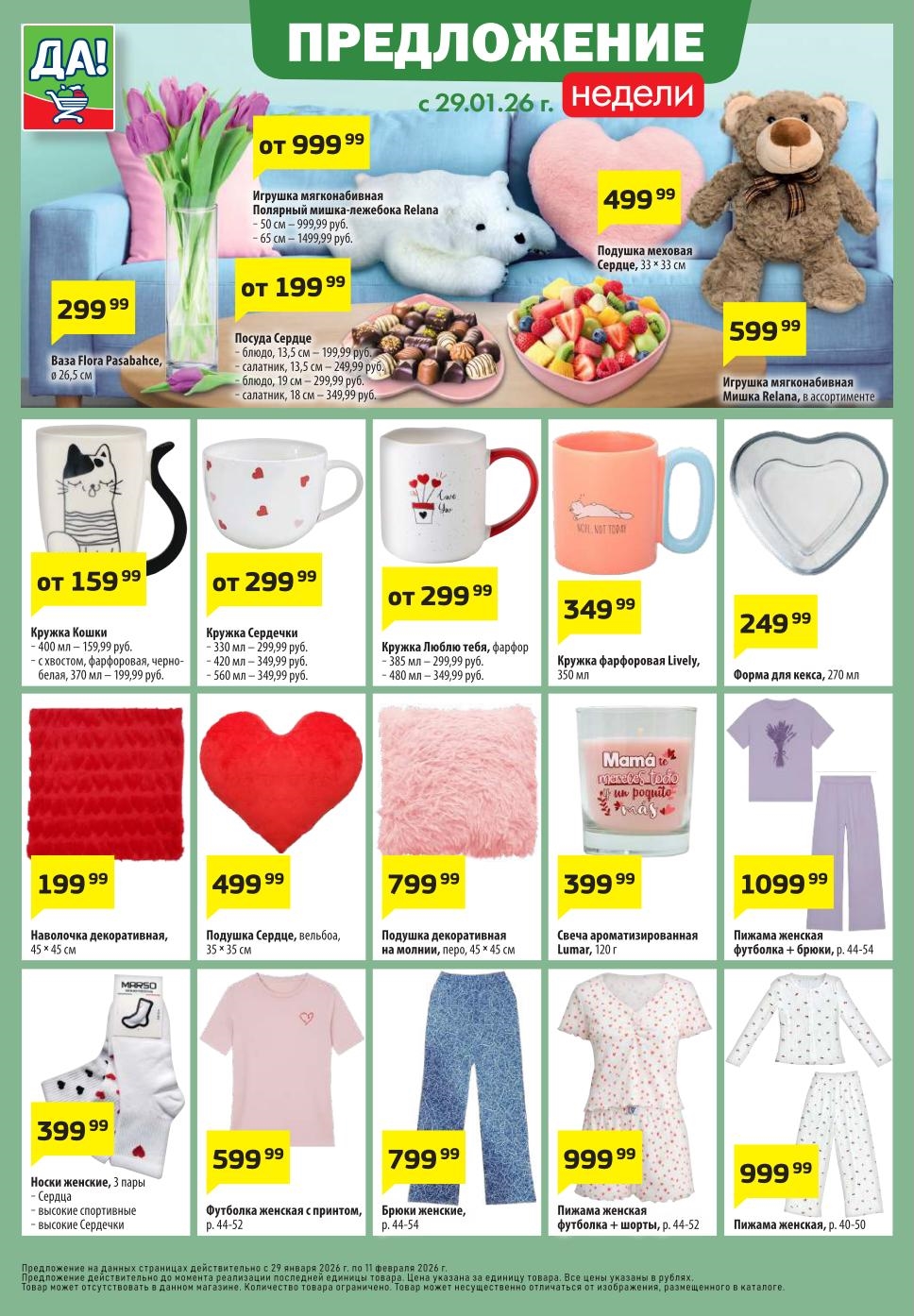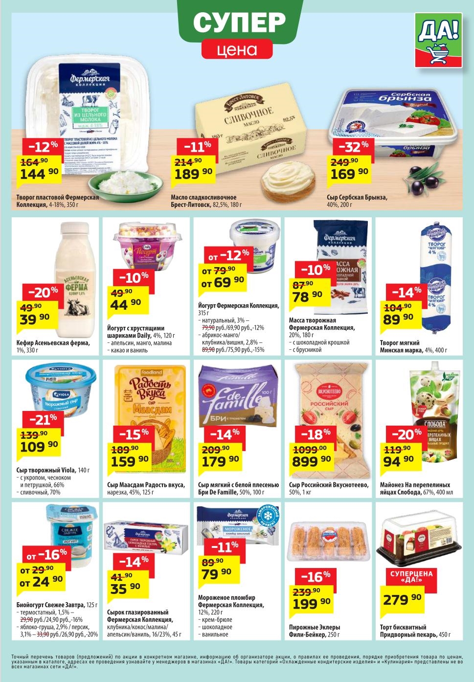 Магазин регулярно предлагает вам свои еженедельные акции и разнообразный каталог ДА! со скидкой. Уникальные возможности ожидают вас при посещении супермаркета каждую неделю. Цены по акции “Да” супермаркет, действуют в городах: Москва, Балашиха, Химки, Подольск, Королев, Мытищи, Люберцы, Электросталь, Коломна, Одинцово, Железнодорожный, Серпухов, Орехово-Зуево, Красногорск, Щелково, Сергиев Посад, Пушкино, Жуковский, Ногинск, Раменское, Клин, Воскресенск, Домодедово и многих других населенных пунктах Московского региона.