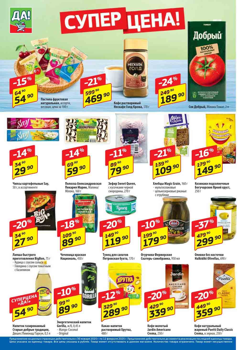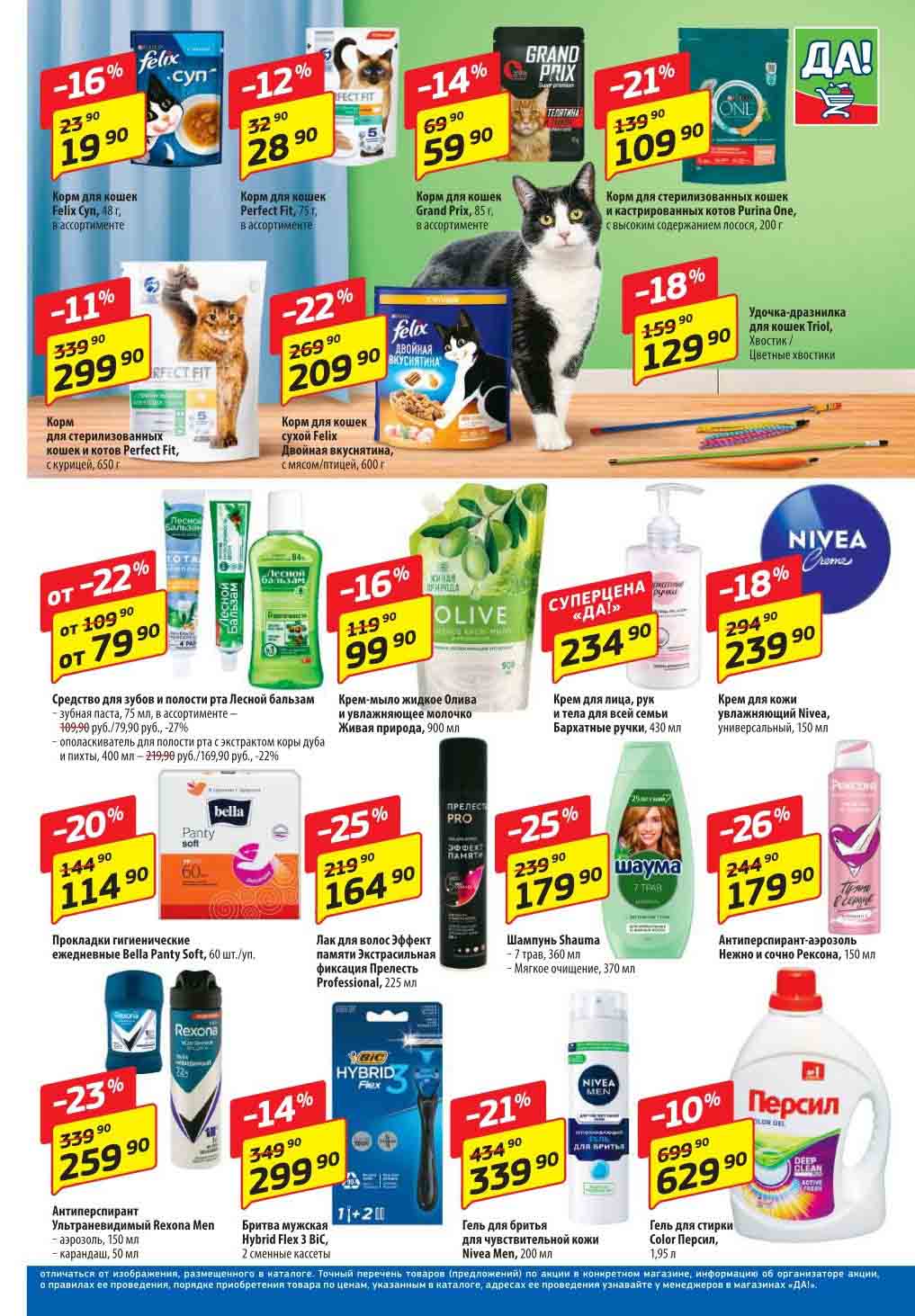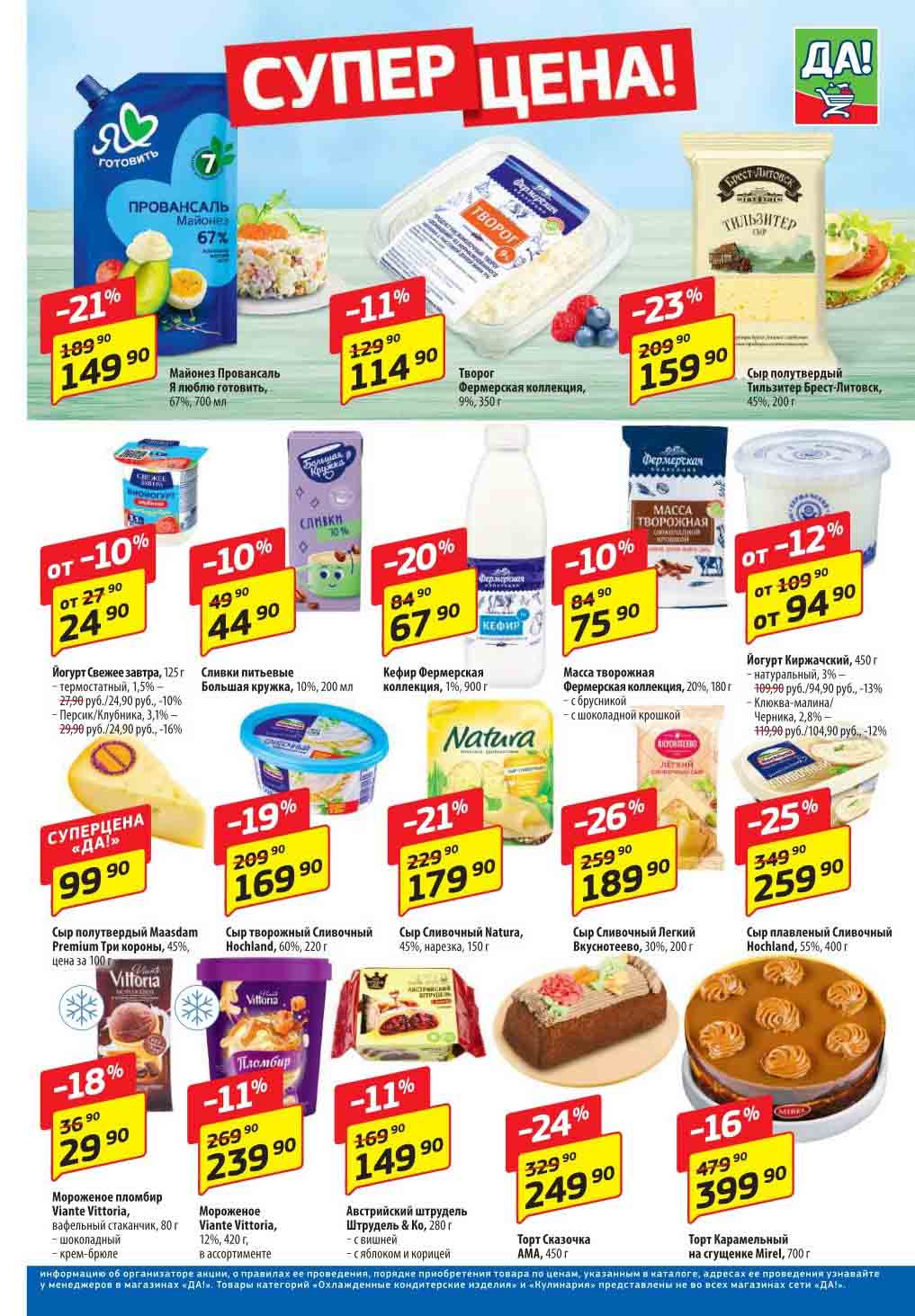 Магазин регулярно предлагает вам свои еженедельные акции и разнообразный каталог ДА! со скидкой. Уникальные возможности ожидают вас при посещении супермаркета каждую неделю. Цены по акции “Да” супермаркет, действуют в городах: Москва, Балашиха, Химки, Подольск, Королев, Мытищи, Люберцы, Электросталь, Коломна, Одинцово, Железнодорожный, Серпухов, Орехово-Зуево, Красногорск, Щелково, Сергиев Посад, Пушкино, Жуковский, Ногинск, Раменское, Клин, Воскресенск, Домодедово и многих других населенных пунктах Московского региона.