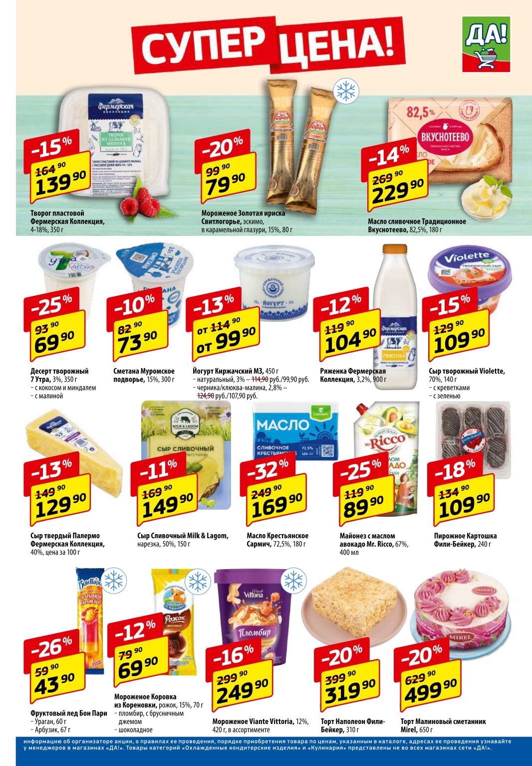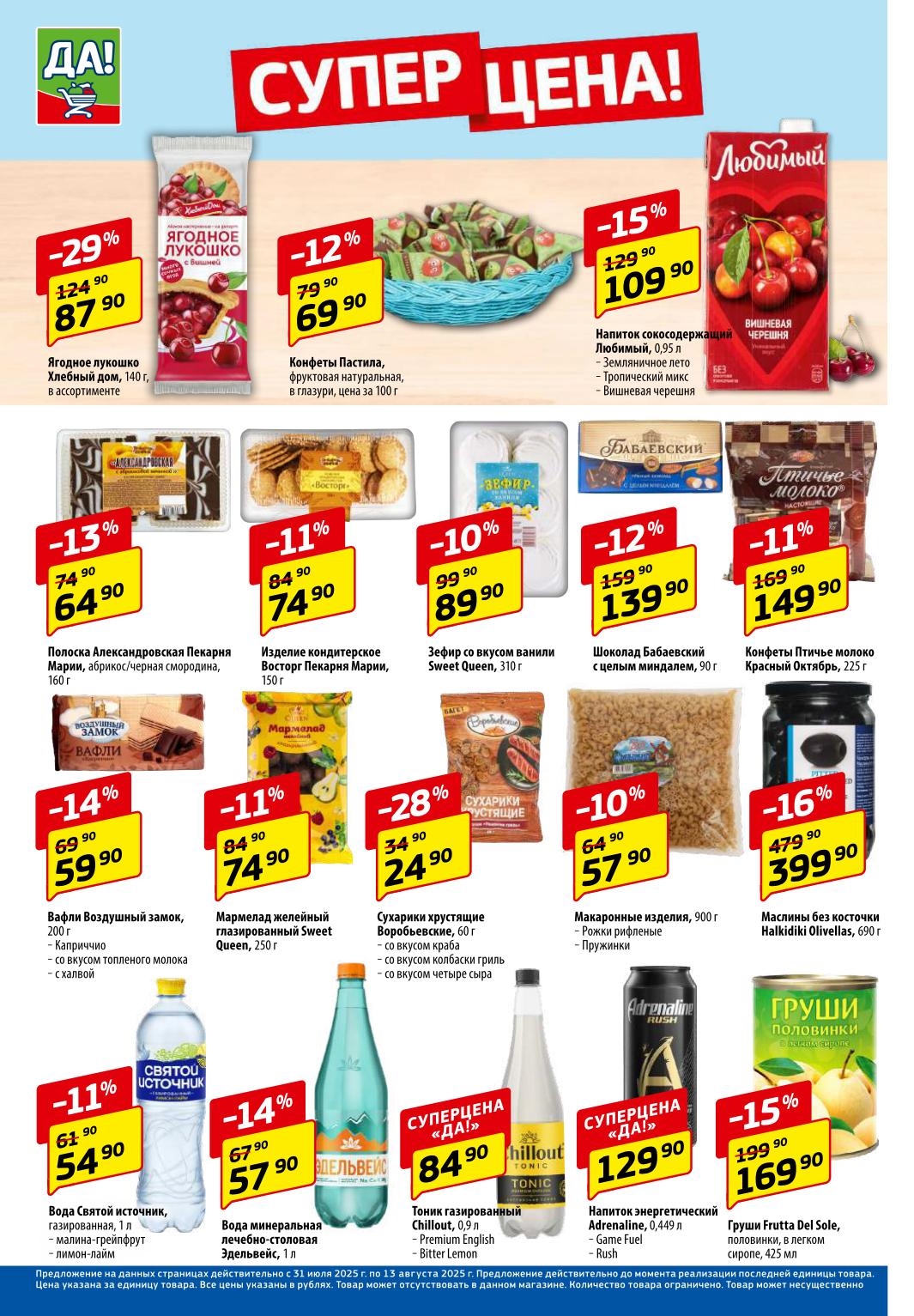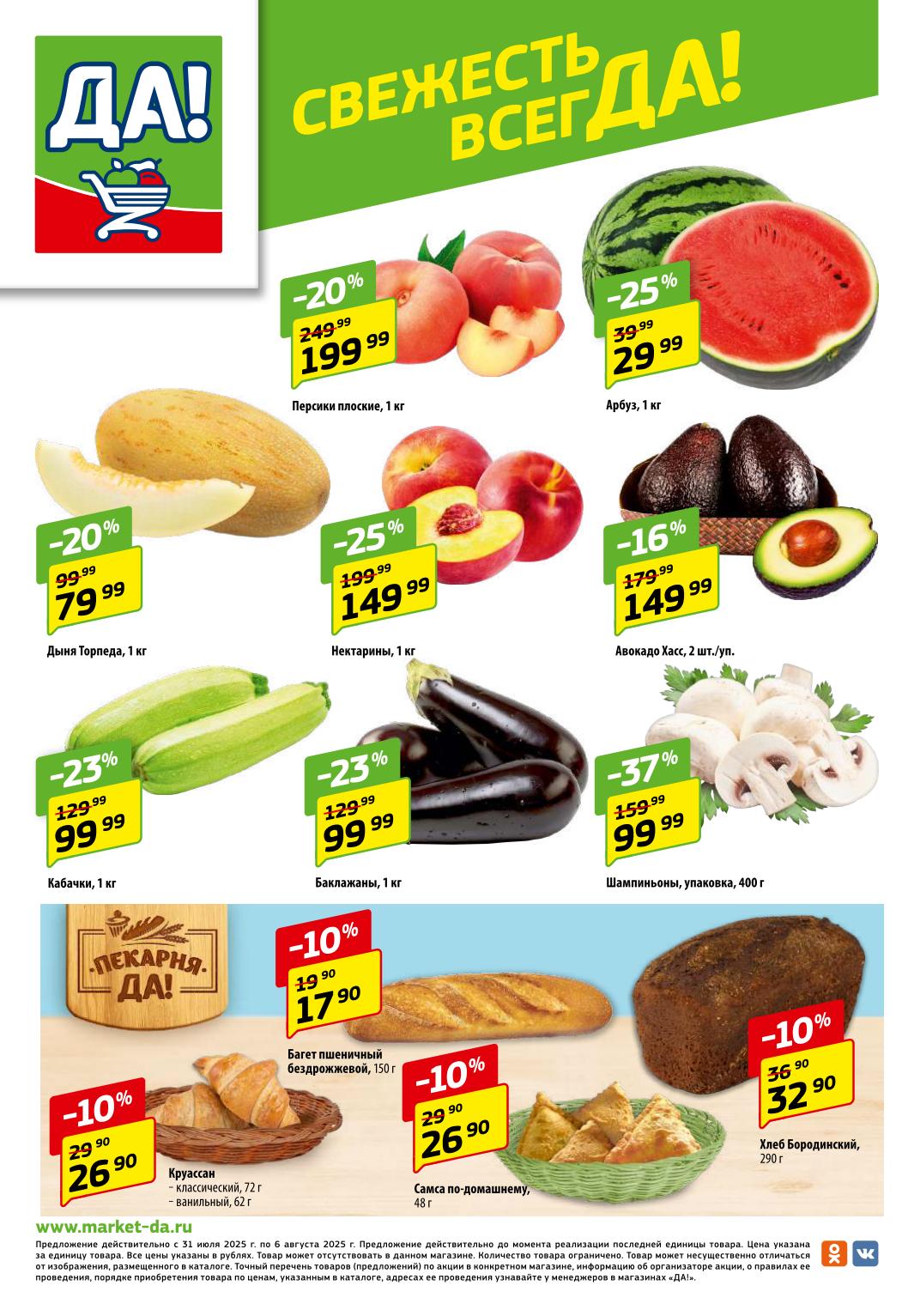 Магазин регулярно предлагает вам свои еженедельные акции и разнообразный каталог ДА! со скидкой. Уникальные возможности ожидают вас при посещении супермаркета каждую неделю. Цены по акции “Да” супермаркет, действуют в городах: Москва, Балашиха, Химки, Подольск, Королев, Мытищи, Люберцы, Электросталь, Коломна, Одинцово, Железнодорожный, Серпухов, Орехово-Зуево, Красногорск, Щелково, Сергиев Посад, Пушкино, Жуковский, Ногинск, Раменское, Клин, Воскресенск, Домодедово и многих других населенных пунктах Московского региона.