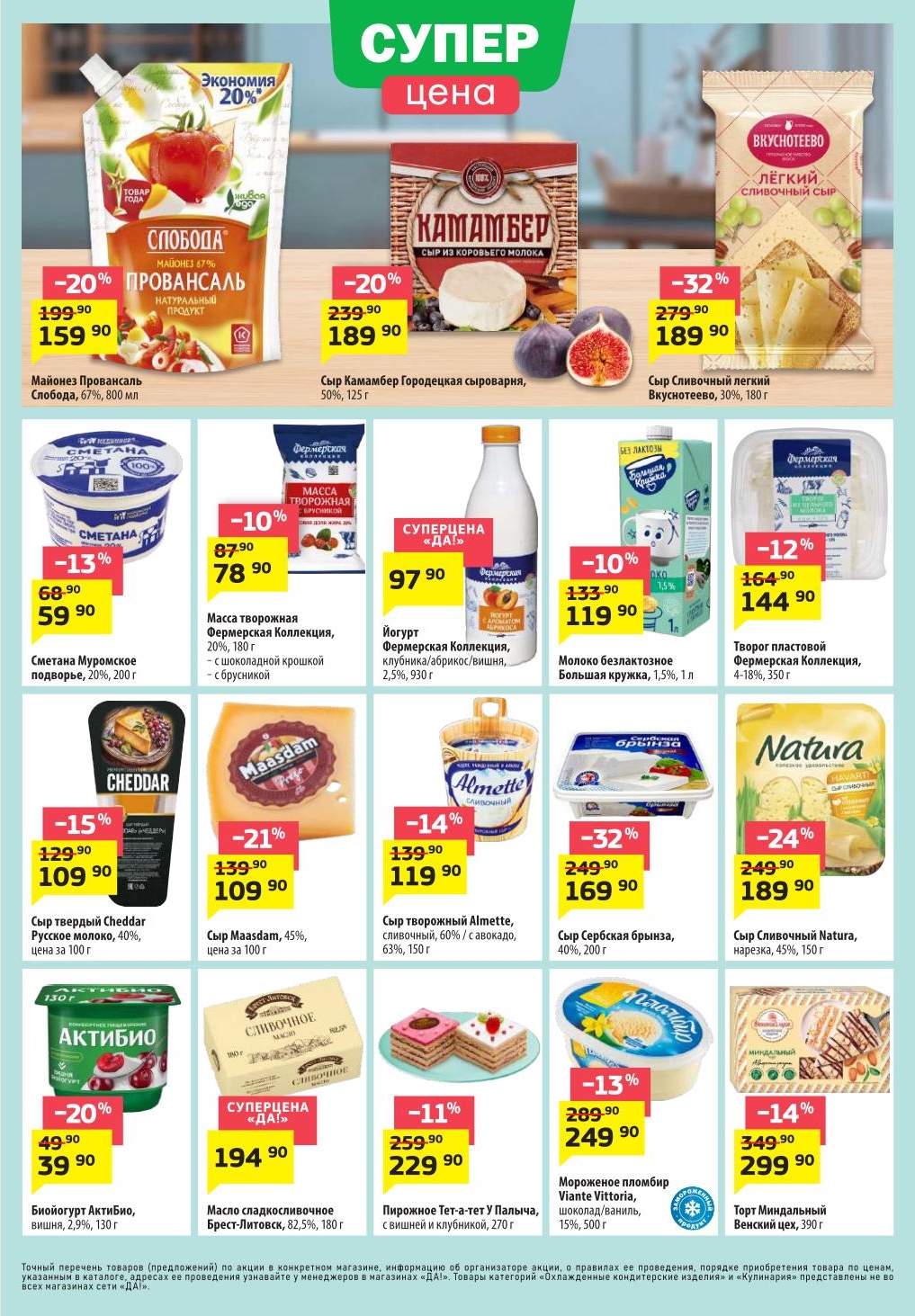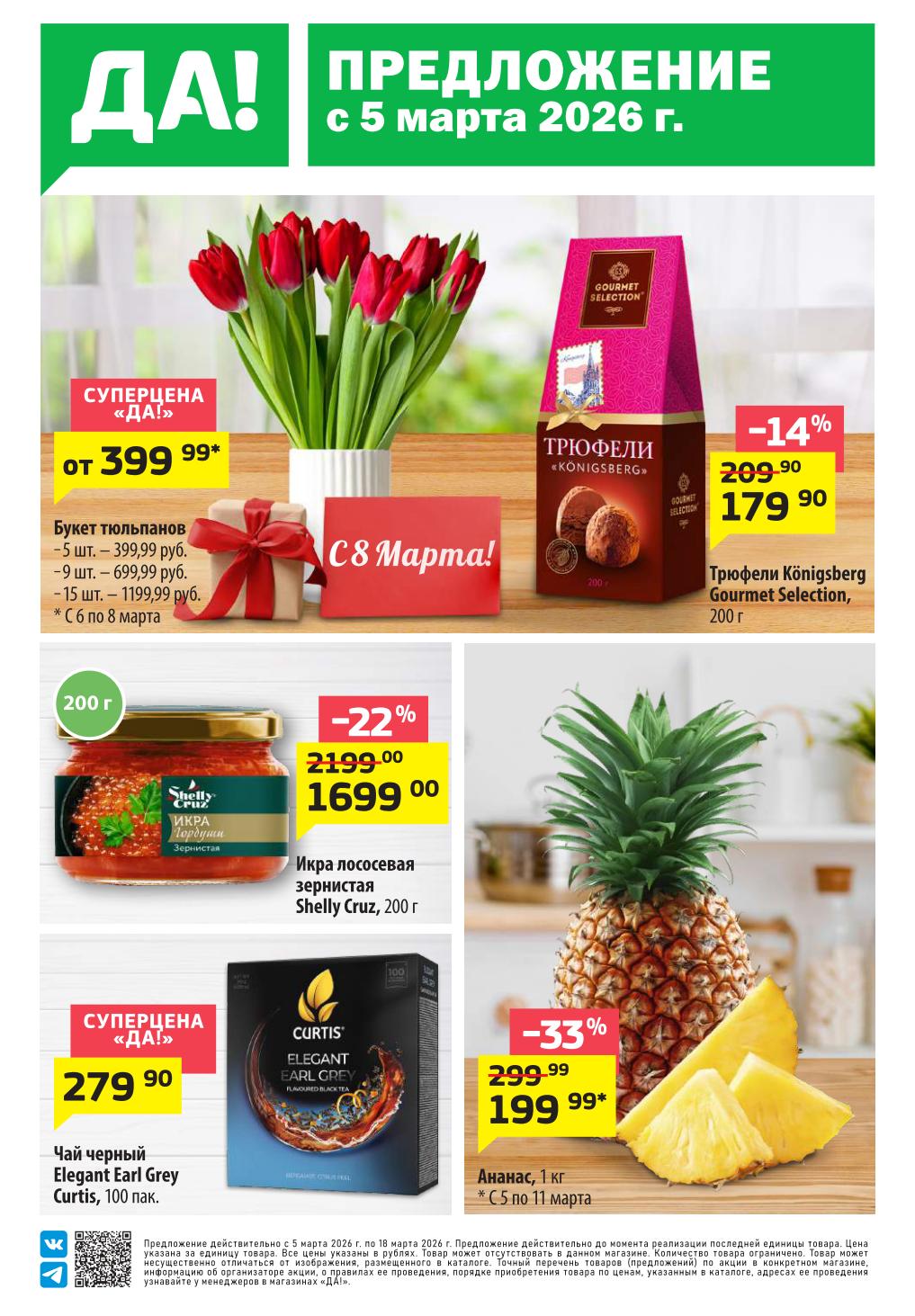 Магазин регулярно предлагает вам свои еженедельные акции и разнообразный каталог ДА! со скидкой. Уникальные возможности ожидают вас при посещении супермаркета каждую неделю. Цены по акции “Да” супермаркет, действуют в городах: Москва, Балашиха, Химки, Подольск, Королев, Мытищи, Люберцы, Электросталь, Коломна, Одинцово, Железнодорожный, Серпухов, Орехово-Зуево, Красногорск, Щелково, Сергиев Посад, Пушкино, Жуковский, Ногинск, Раменское, Клин, Воскресенск, Домодедово и многих других населенных пунктах Московского региона.