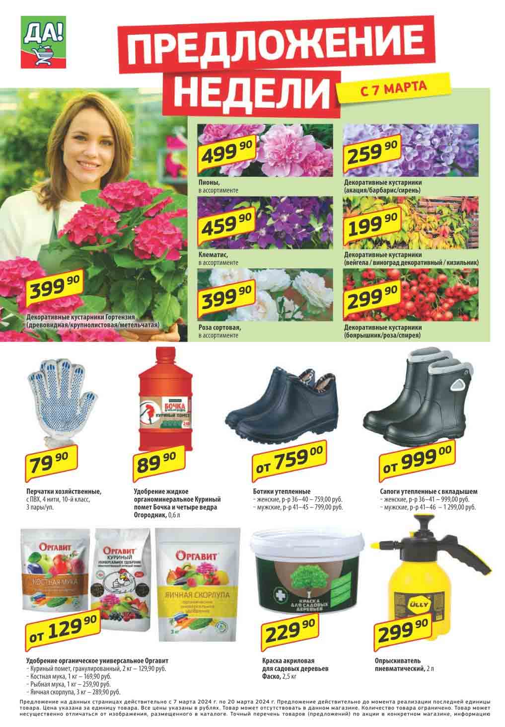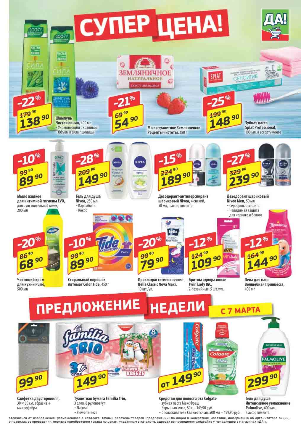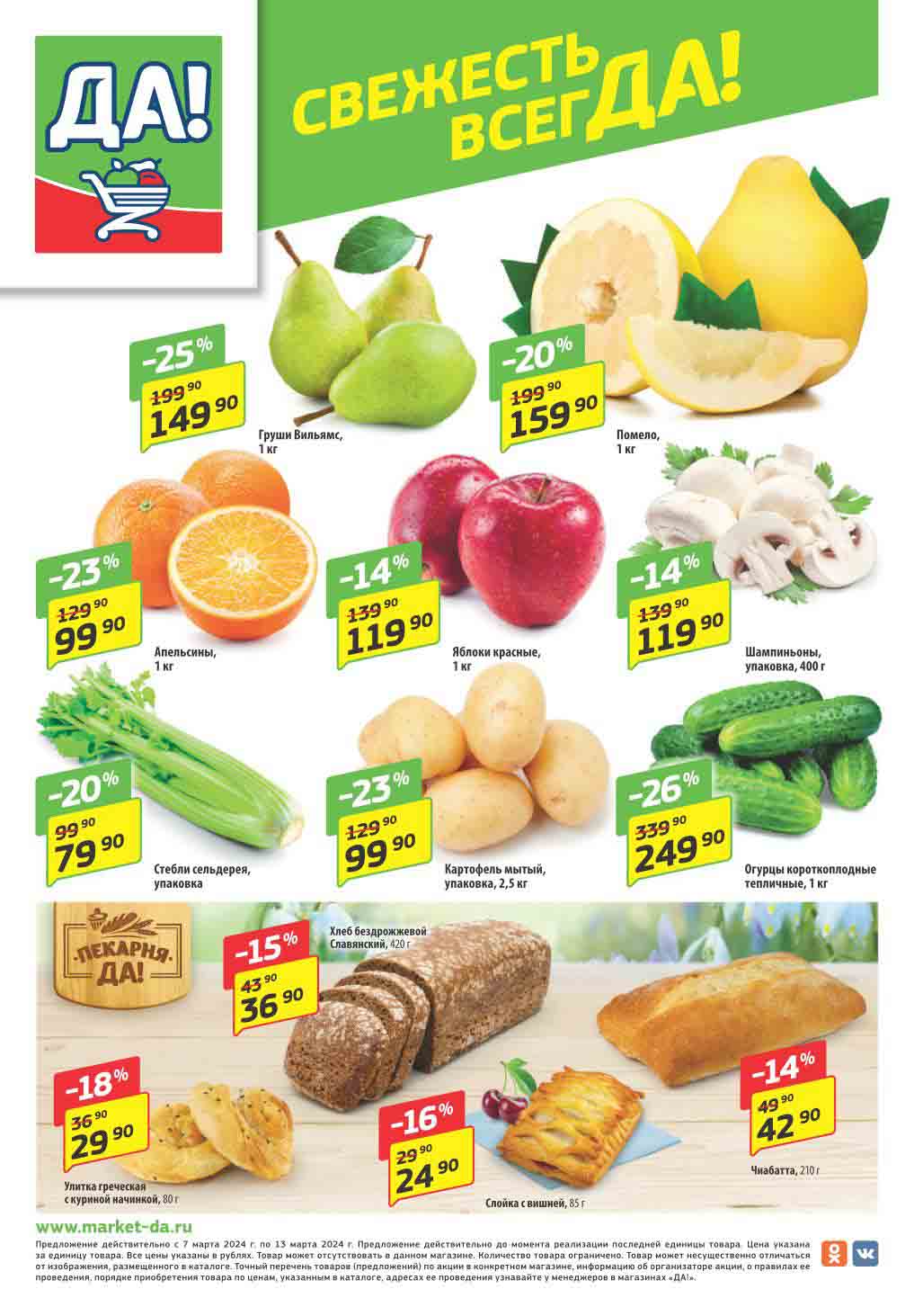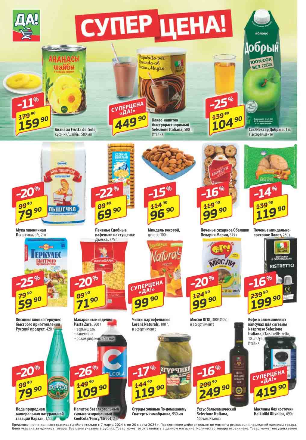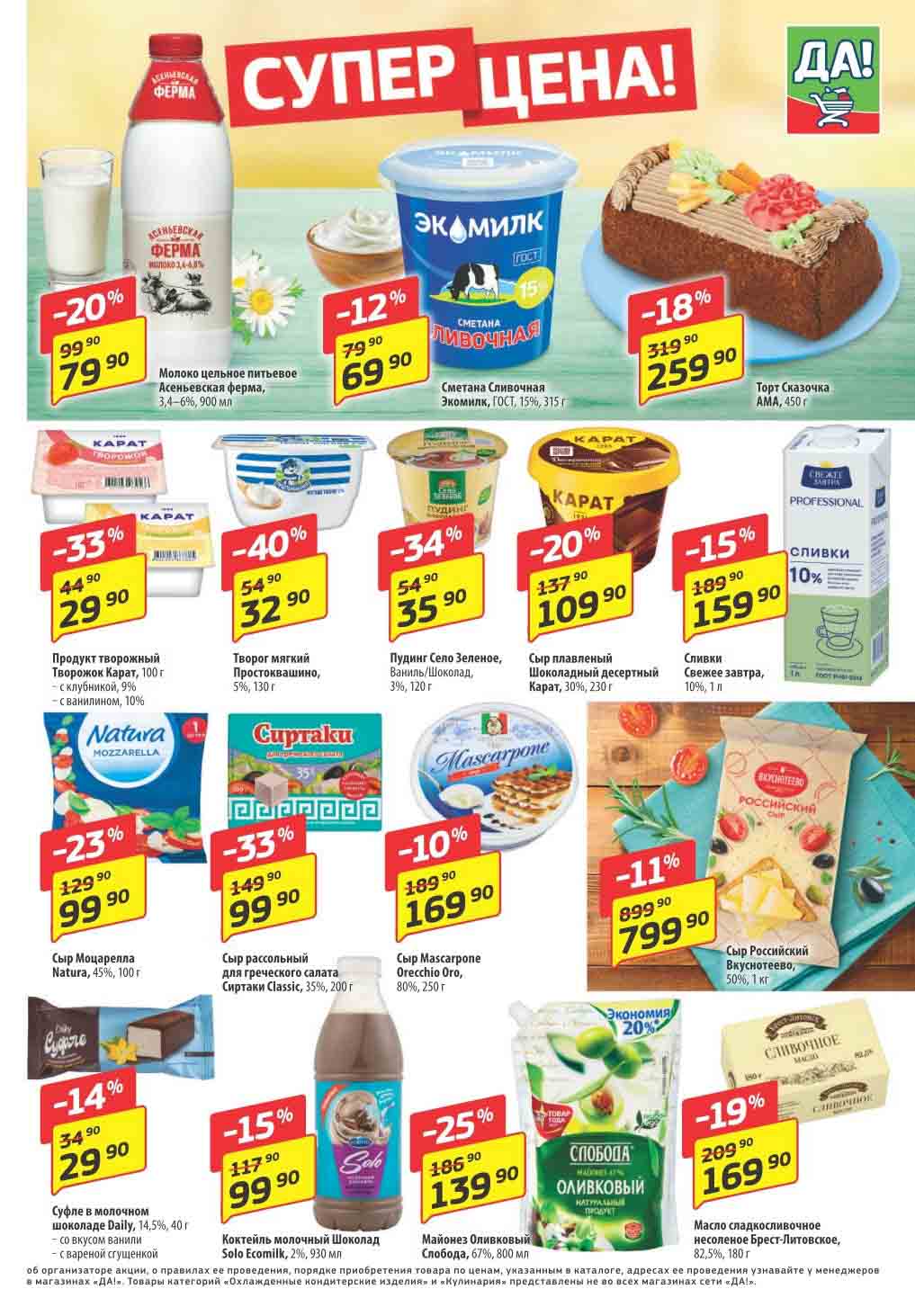 В акционном буклете предложены выгодные цены на различные продукты, такие как макароны Макфа по 49.90, сосиски Дымов за 179.90 руб., творог Простоквашино за 32.90 руб. и многое другое.
