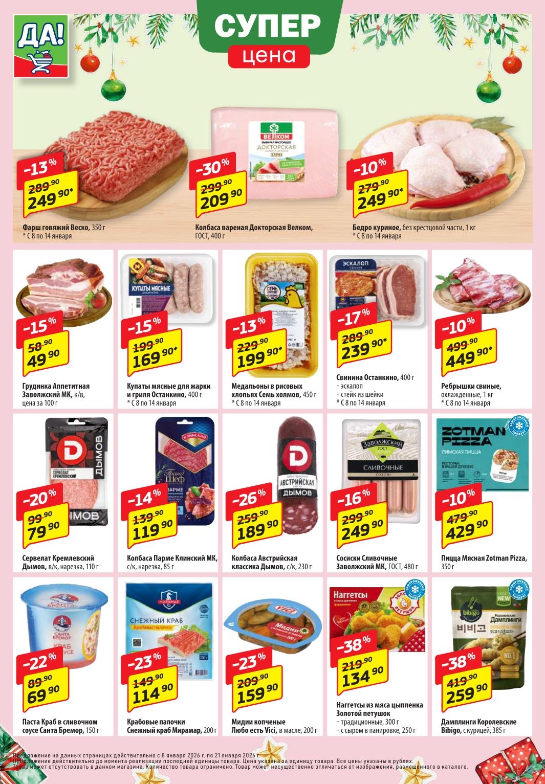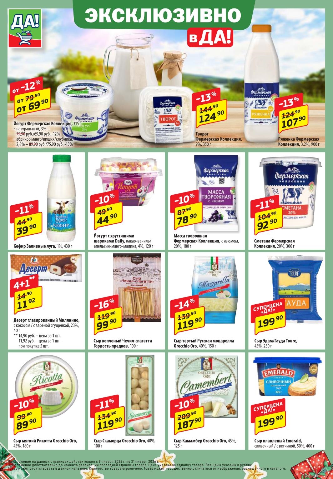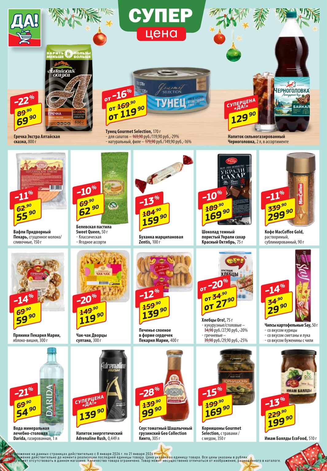 Магазин регулярно предлагает вам свои еженедельные акции и разнообразный каталог ДА! со скидкой. Уникальные возможности ожидают вас при посещении супермаркета каждую неделю. Цены по акции “Да” супермаркет, действуют в городах: Москва, Балашиха, Химки, Подольск, Королев, Мытищи, Люберцы, Электросталь, Коломна, Одинцово, Железнодорожный, Серпухов, Орехово-Зуево, Красногорск, Щелково, Сергиев Посад, Пушкино, Жуковский, Ногинск, Раменское, Клин, Воскресенск, Домодедово и многих других населенных пунктах Московского региона.