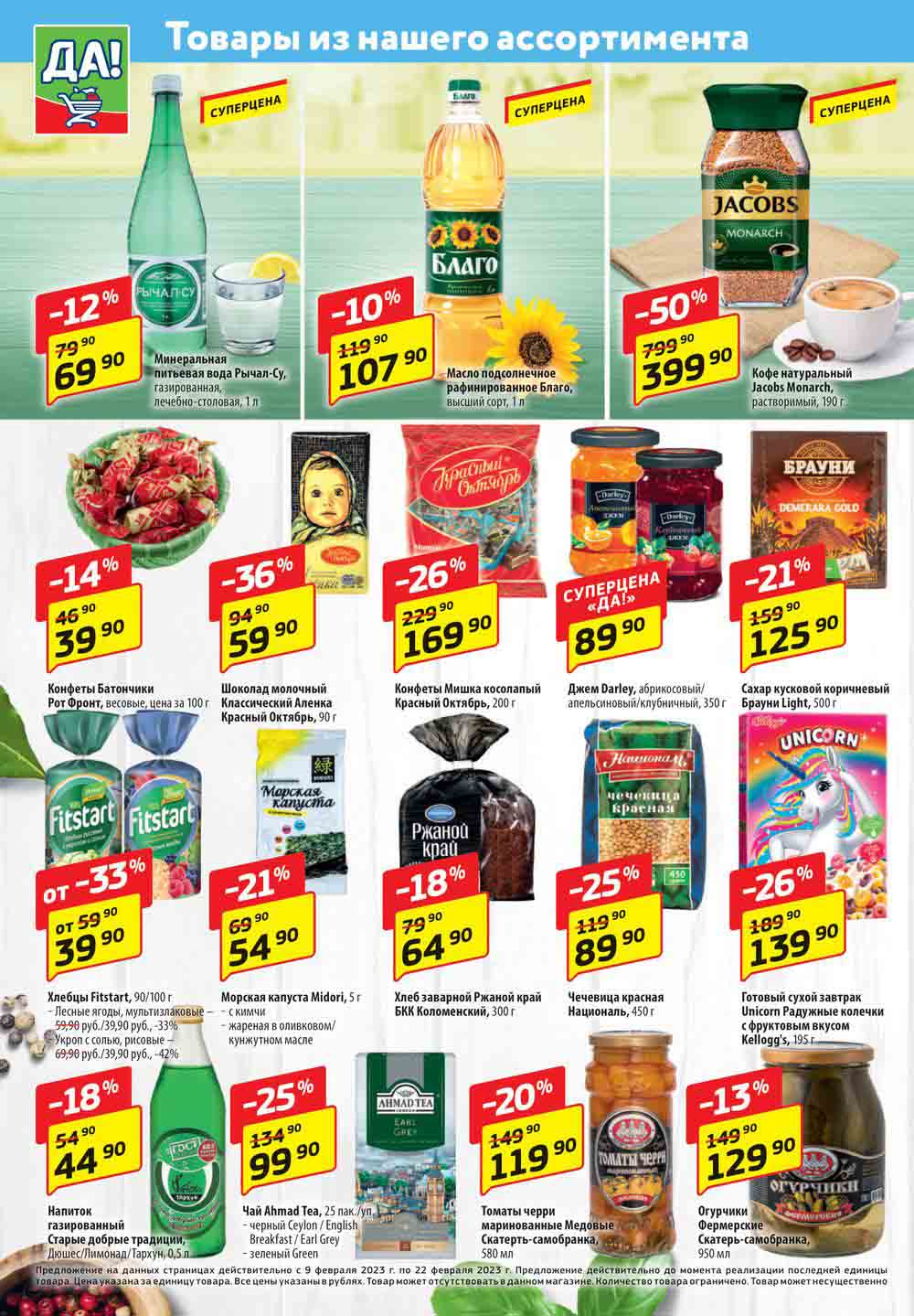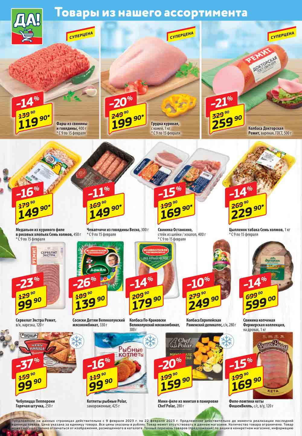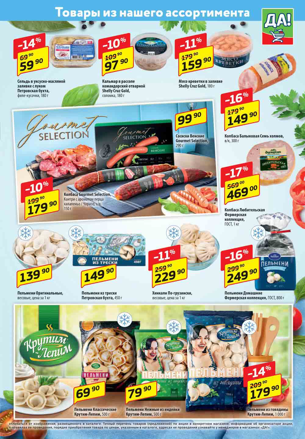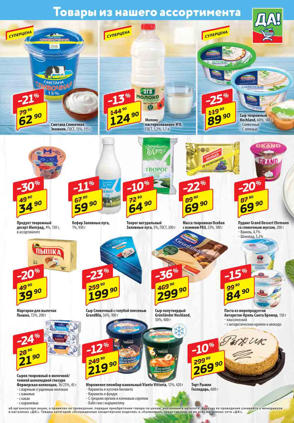Магазин регулярно предлагает вам свои еженедельные акции и разнообразный каталог ДА! со скидкой. Уникальные возможности ожидают вас при посещении супермаркета каждую неделю. Цены по акции “Да” супермаркет, действуют в городах: Москва, Балашиха, Химки, Подольск, Королев, Мытищи, Люберцы, Электросталь, Коломна, Одинцово, Железнодорожный, Серпухов, Орехово-Зуево, Красногорск, Щелково, Сергиев Посад, Пушкино, Жуковский, Ногинск, Раменское, Клин, Воскресенск, Домодедово и многих других населенных пунктах Московского региона.