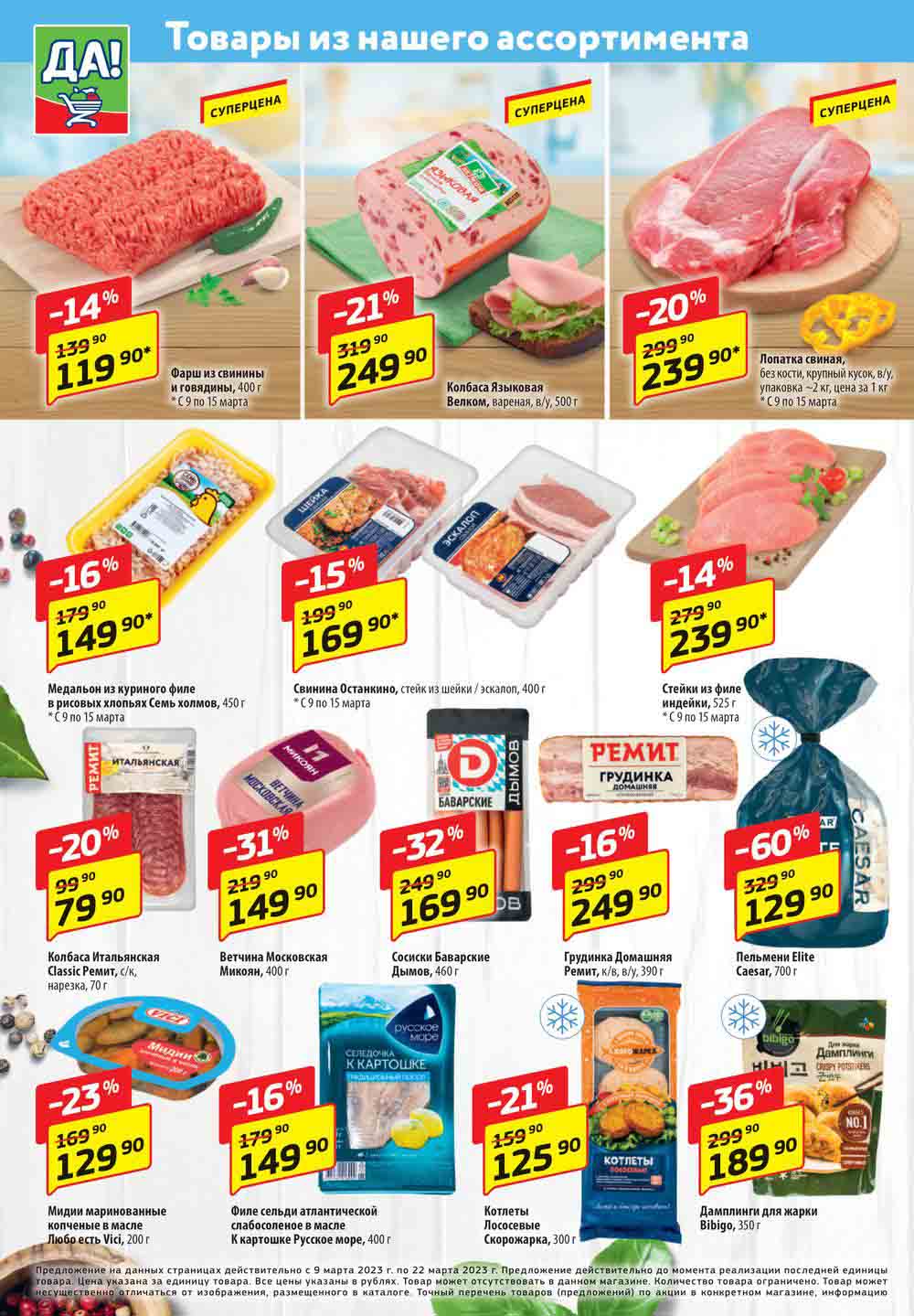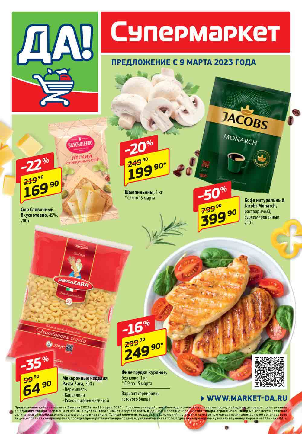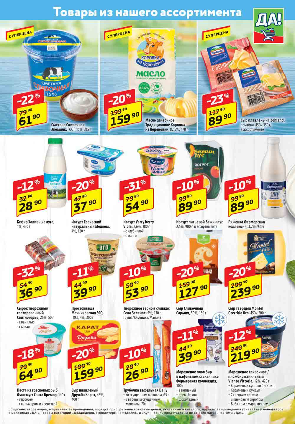 Магазин регулярно предлагает вам свои еженедельные акции и разнообразный каталог ДА! со скидкой. Уникальные возможности ожидают вас при посещении супермаркета каждую неделю. Цены по акции “Да” супермаркет, действуют в городах: Москва, Балашиха, Химки, Подольск, Королев, Мытищи, Люберцы, Электросталь, Коломна, Одинцово, Железнодорожный, Серпухов, Орехово-Зуево, Красногорск, Щелково, Сергиев Посад, Пушкино, Жуковский, Ногинск, Раменское, Клин, Воскресенск, Домодедово и многих других населенных пунктах Московского региона.