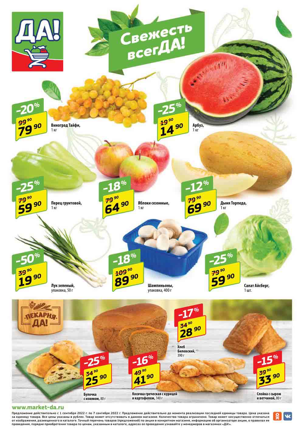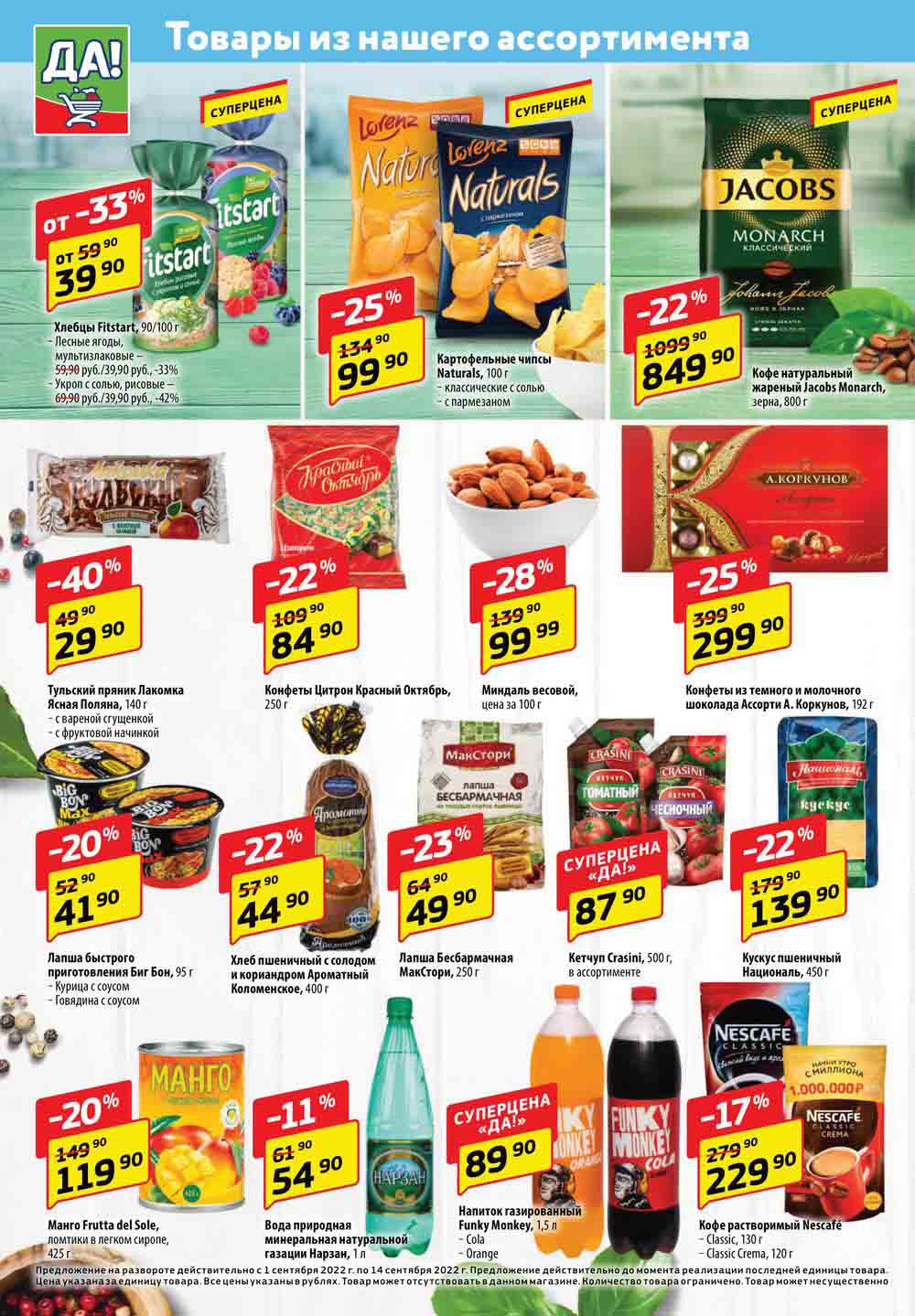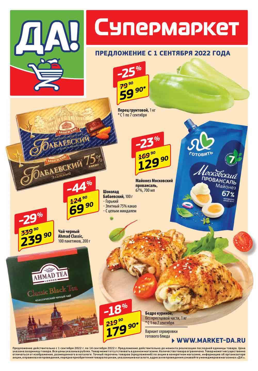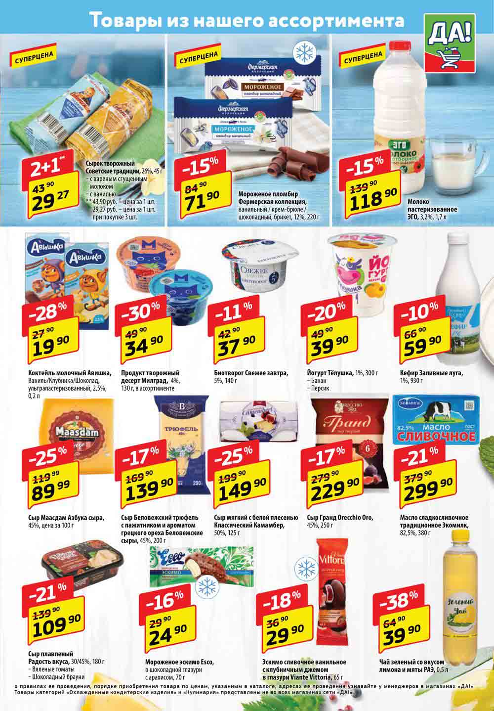 Магазин регулярно предлагает вам свои еженедельные акции и разнообразный каталог ДА! со скидкой. Уникальные возможности ожидают вас при посещении супермаркета каждую неделю. Цены по акции “Да” супермаркет, действуют в городах: Москва, Балашиха, Химки, Подольск, Королев, Мытищи, Люберцы, Электросталь, Коломна, Одинцово, Железнодорожный, Серпухов, Орехово-Зуево, Красногорск, Щелково, Сергиев Посад, Пушкино, Жуковский, Ногинск, Раменское, Клин, Воскресенск, Домодедово и многих других населенных пунктах Московского региона.