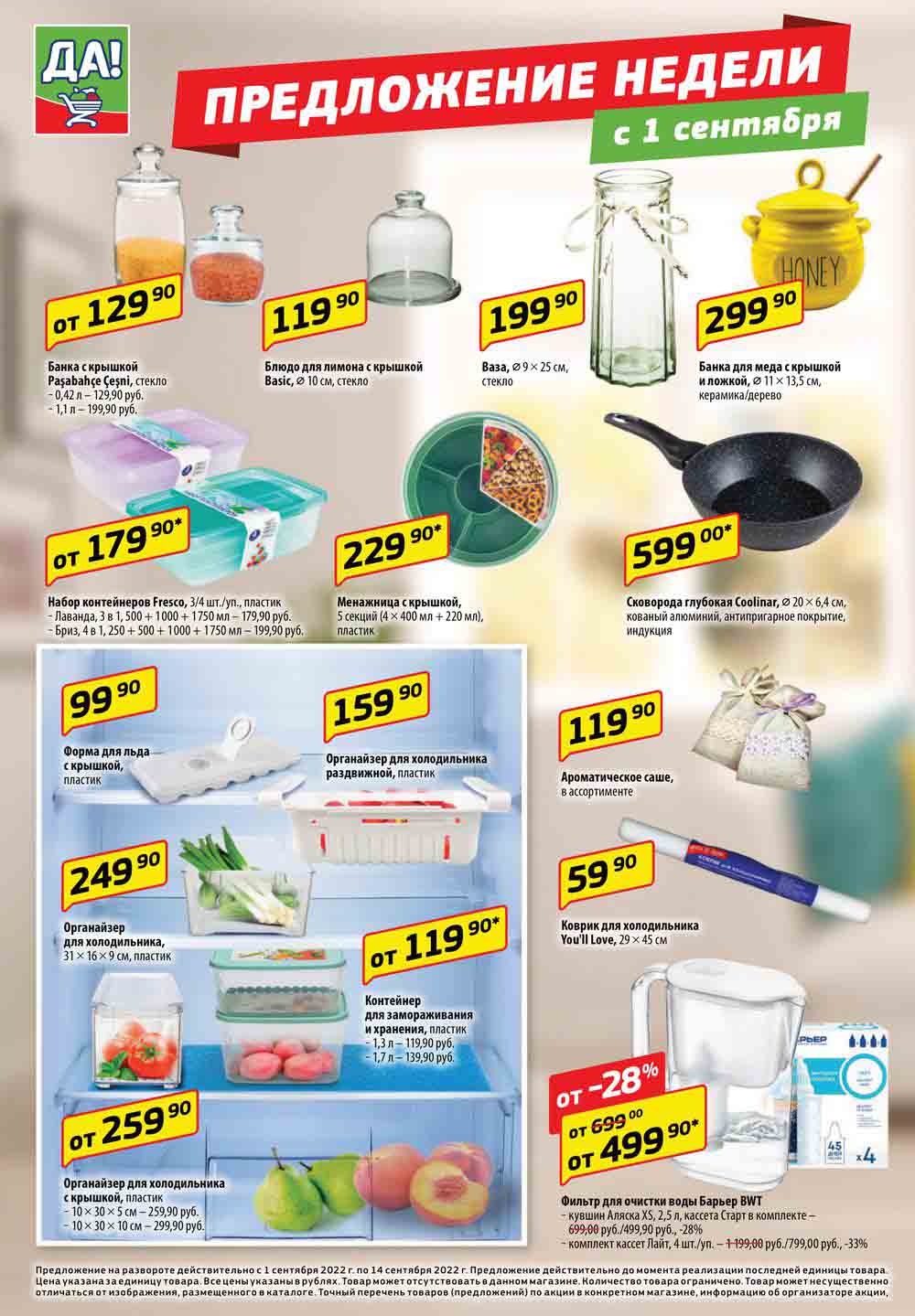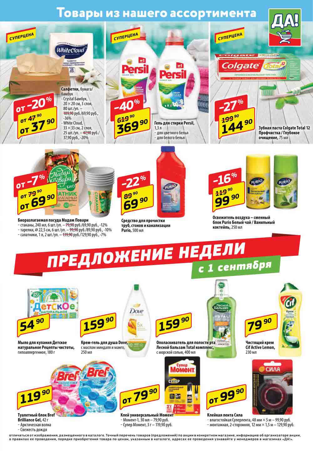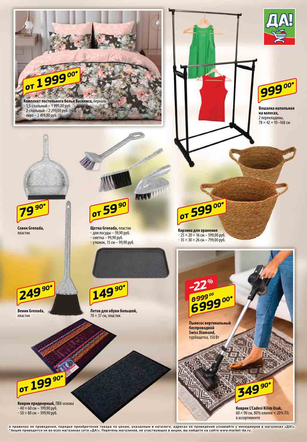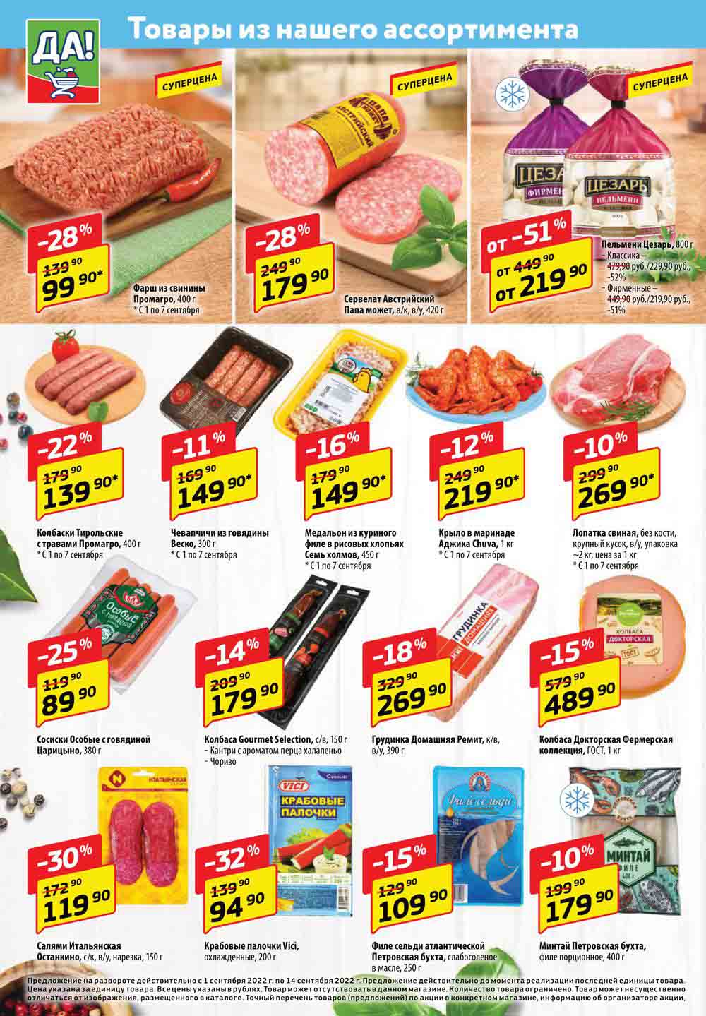 Магазин регулярно предлагает вам свои еженедельные акции и разнообразный каталог ДА! со скидкой. Уникальные возможности ожидают вас при посещении супермаркета каждую неделю. Цены по акции “Да” супермаркет, действуют в городах: Москва, Балашиха, Химки, Подольск, Королев, Мытищи, Люберцы, Электросталь, Коломна, Одинцово, Железнодорожный, Серпухов, Орехово-Зуево, Красногорск, Щелково, Сергиев Посад, Пушкино, Жуковский, Ногинск, Раменское, Клин, Воскресенск, Домодедово и многих других населенных пунктах Московского региона.