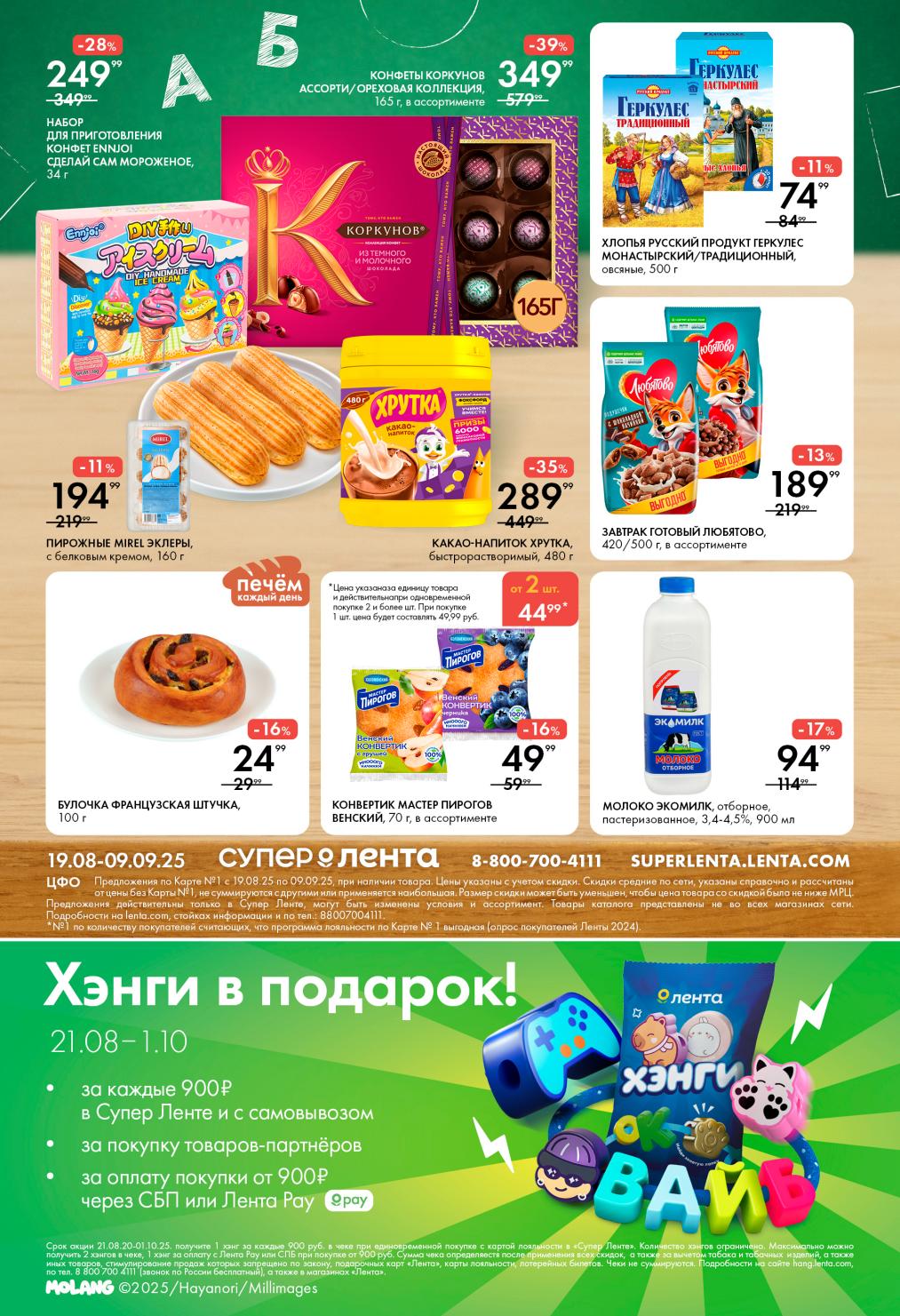 На страницах каталога ЛЕНТА вы найдете все свои любимые товары, которые сейчас предлагаются по акции. Скидки действуют в указанные сроки при покупках с Картой №1, при наличии товара Количество товара ограничено. Внешний вид товаров может отличаться от представленных. В Ленте пенсионерам скидка 10%* каждый день 9:00–13:00 (*Скидка не распространяется подарочные карты, лотерейные билеты, товары марки «365 Дней».) Выгода предоставляется на кассе при предъявлении необходимых документов и карты лояльности. Цены по акции Лента действуют в городах: Москва, Балашиха, Химки, Подольск, Королев, Мытищи, Люберцы, Электросталь, Коломна, Одинцово, Железнодорожный, Серпухов, Орехово-Зуево, Красногорск, Щелково, Сергиев Посад, Пушкино, Жуковский, Ногинск, Раменское и многих других населенных пунктах Московского региона.