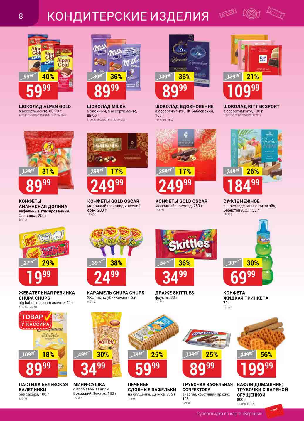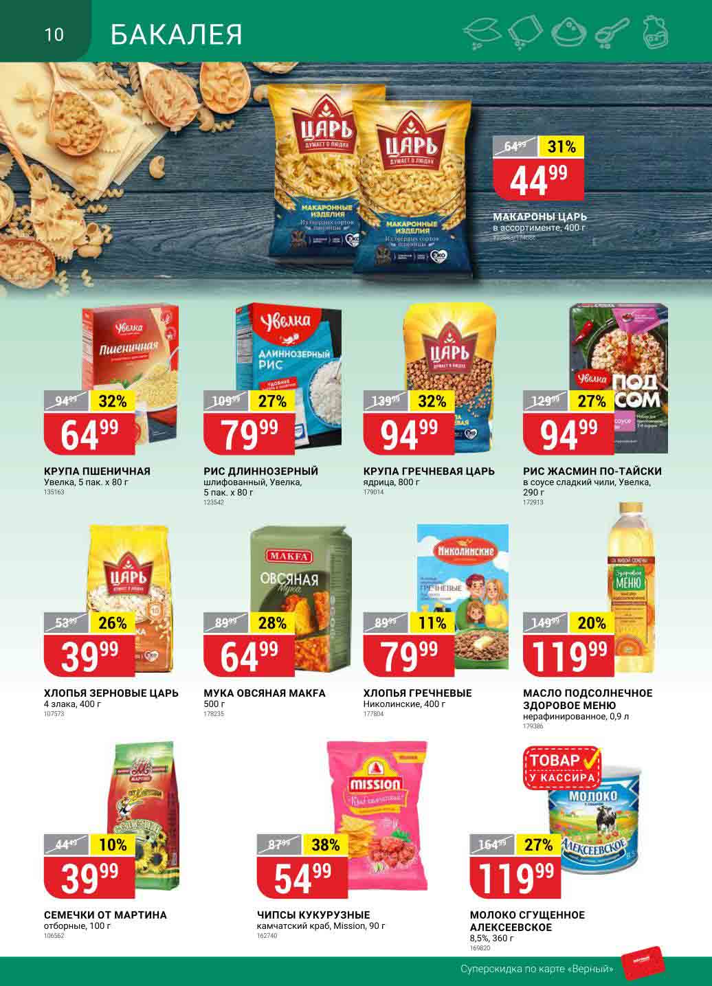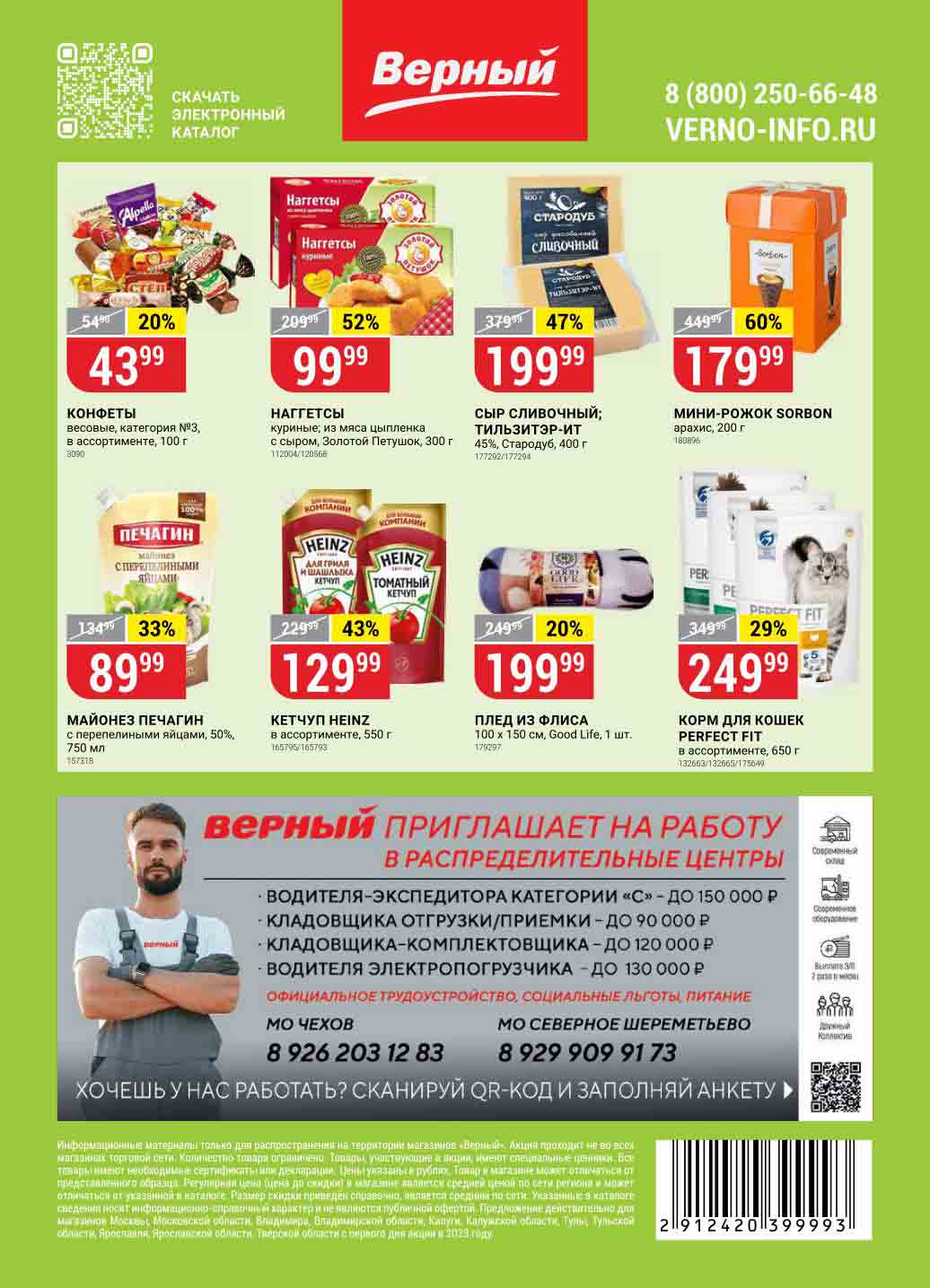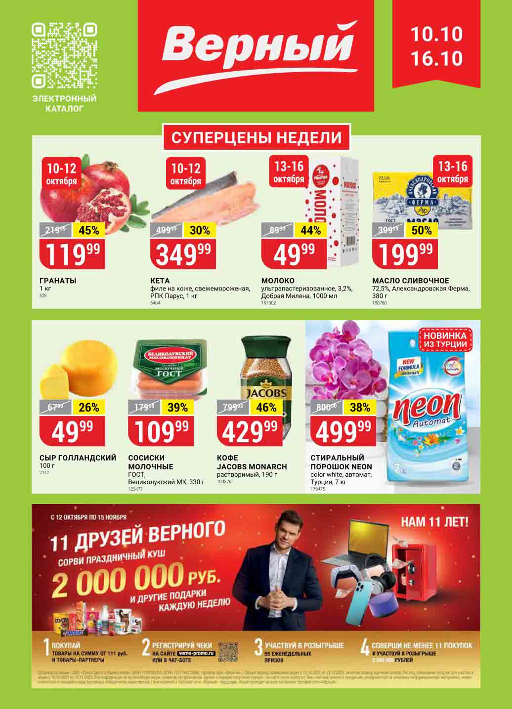 На страницах каталога Верный вы найдете все свои любимые товары, которые сейчас предлагаются в супермаркете. Еженедельное снижение цен на определенные виды, как продовольственных, так и хозтоваров. Цены по акции Верный действуют в городах: Москва, Балашиха, Химки, Подольск, Королев, Мытищи, Люберцы, Электросталь, Коломна, Одинцово, Железнодорожный, Серпухов, Орехово-Зуево, Красногорск, Щелково, Сергиев Посад, Пушкино, Жуковский, Ногинск, Раменское, Клин, Воскресенск, Домодедово и многих других населенных пунктах Московского региона.