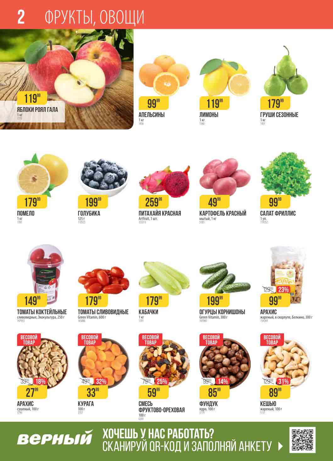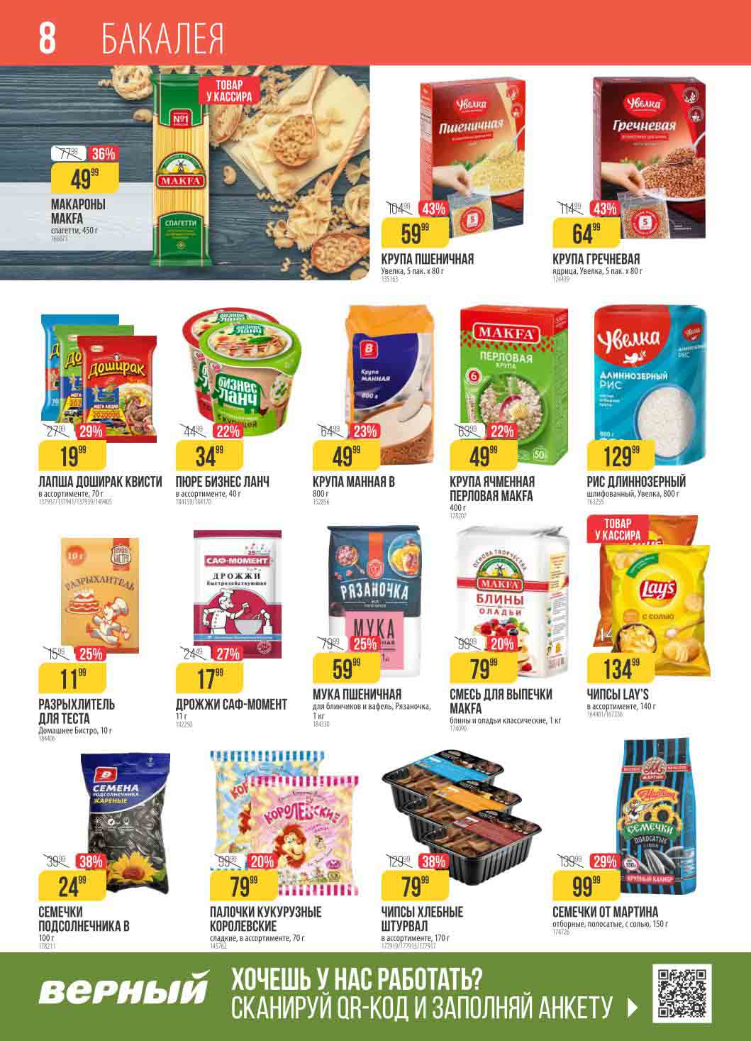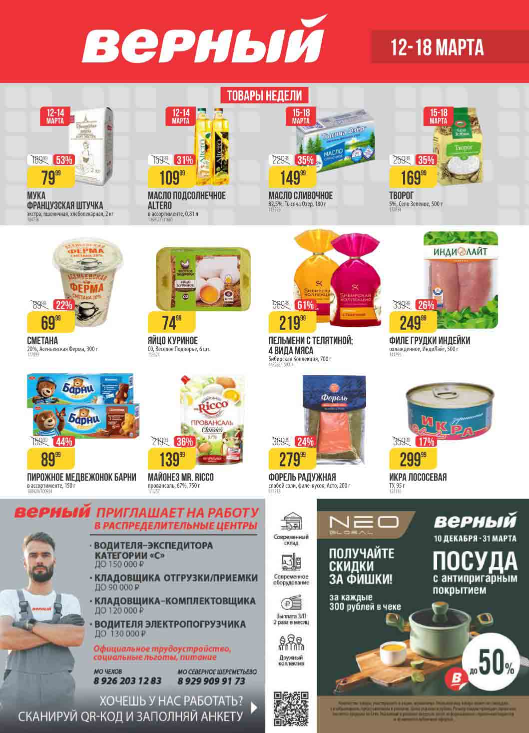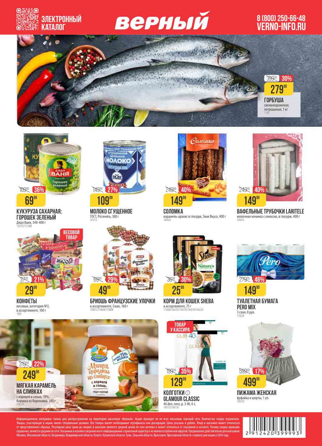 На страницах каталога Верный вы найдете все свои любимые товары, которые сейчас предлагаются в супермаркете. Еженедельное снижение цен на определенные виды, как продовольственных, так и хозтоваров. Цены по акции Верный действуют в городах: Москва, Балашиха, Химки, Подольск, Королев, Мытищи, Люберцы, Электросталь, Коломна, Одинцово, Железнодорожный, Серпухов, Орехово-Зуево, Красногорск, Щелково, Сергиев Посад, Пушкино, Жуковский, Ногинск, Раменское, Клин, Воскресенск, Домодедово и многих других населенных пунктах Московского региона.