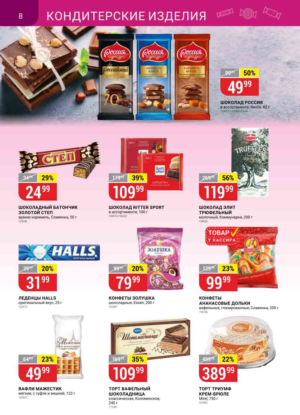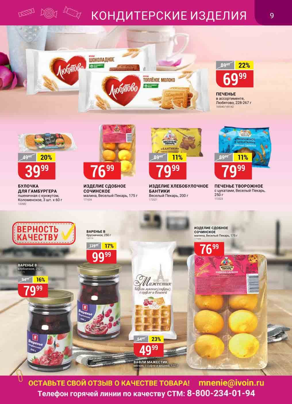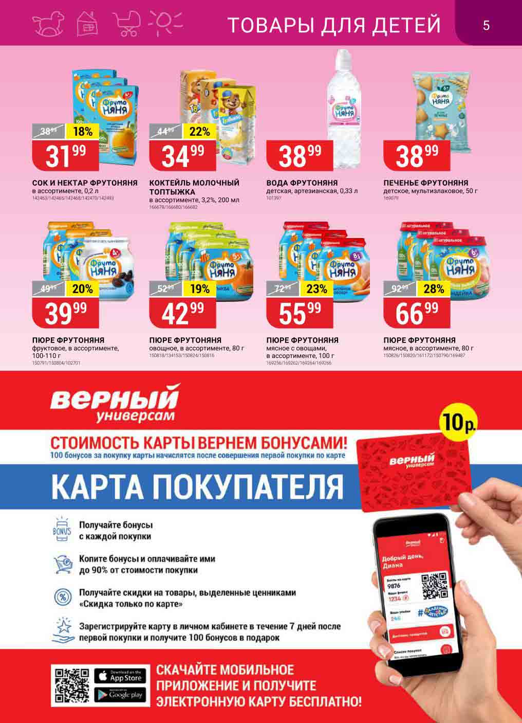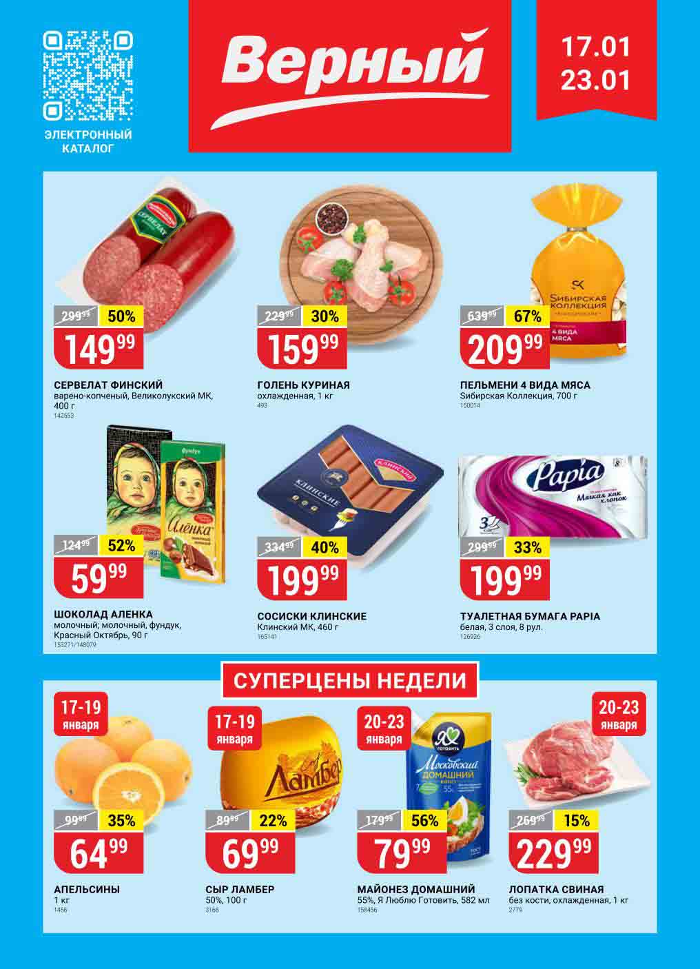 На страницах каталога Верный вы найдете все свои любимые товары, которые сейчас предлагаются в супермаркете. Еженедельное снижение цен на определенные виды, как продовольственных, так и хозтоваров. Цены по акции Верный действуют в городах: Москва, Балашиха, Химки, Подольск, Королев, Мытищи, Люберцы, Электросталь, Коломна, Одинцово, Железнодорожный, Серпухов, Орехово-Зуево, Красногорск, Щелково, Сергиев Посад, Пушкино, Жуковский, Ногинск, Раменское, Клин, Воскресенск, Домодедово и многих других населенных пунктах Московского региона.