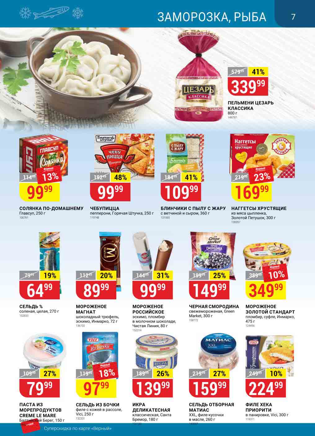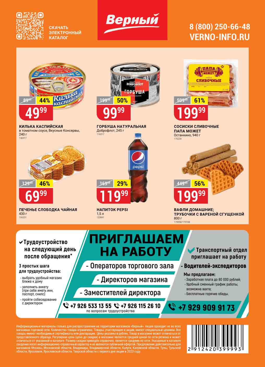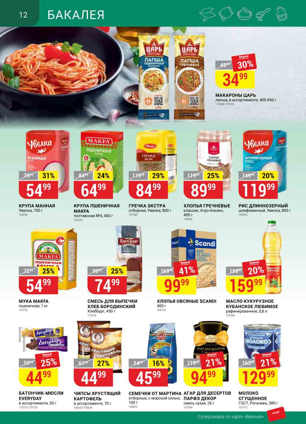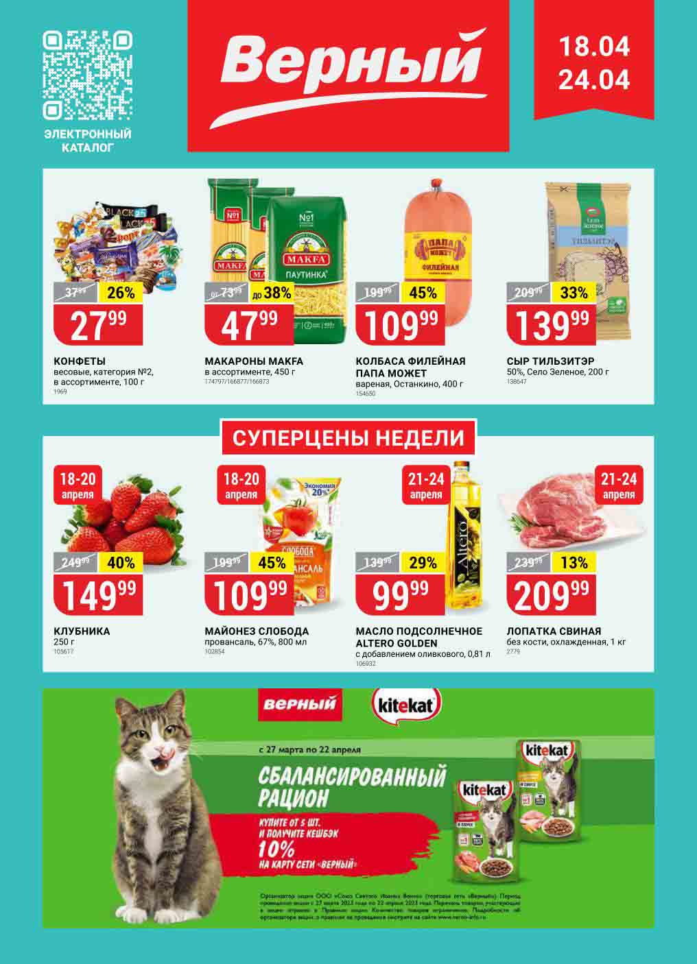 На страницах каталога Верный вы найдете все свои любимые товары, которые сейчас предлагаются в супермаркете. Еженедельное снижение цен на определенные виды, как продовольственных, так и хозтоваров. Цены по акции Верный действуют в городах: Москва, Балашиха, Химки, Подольск, Королев, Мытищи, Люберцы, Электросталь, Коломна, Одинцово, Железнодорожный, Серпухов, Орехово-Зуево, Красногорск, Щелково, Сергиев Посад, Пушкино, Жуковский, Ногинск, Раменское, Клин, Воскресенск, Домодедово и многих других населенных пунктах Московского региона.