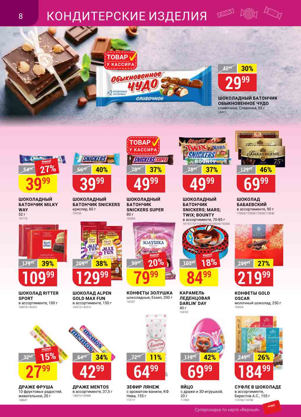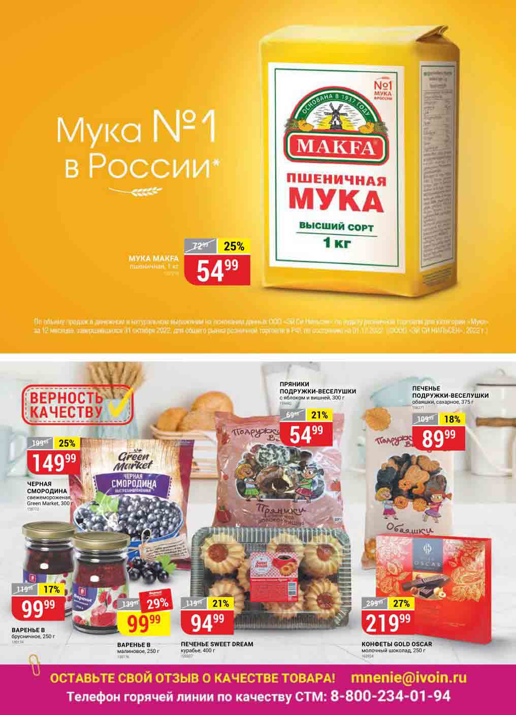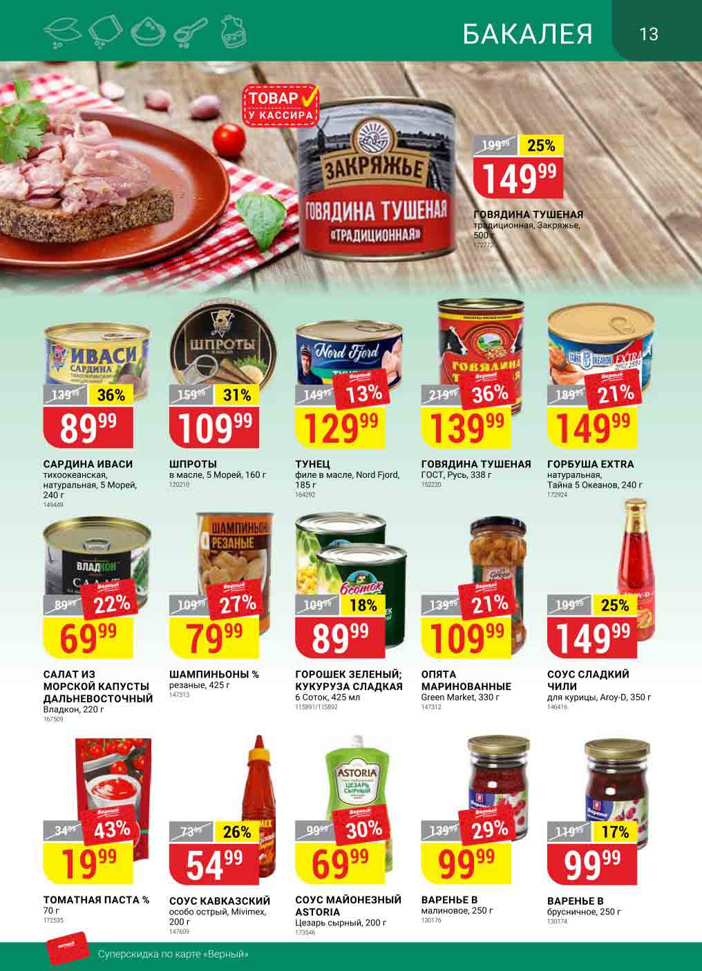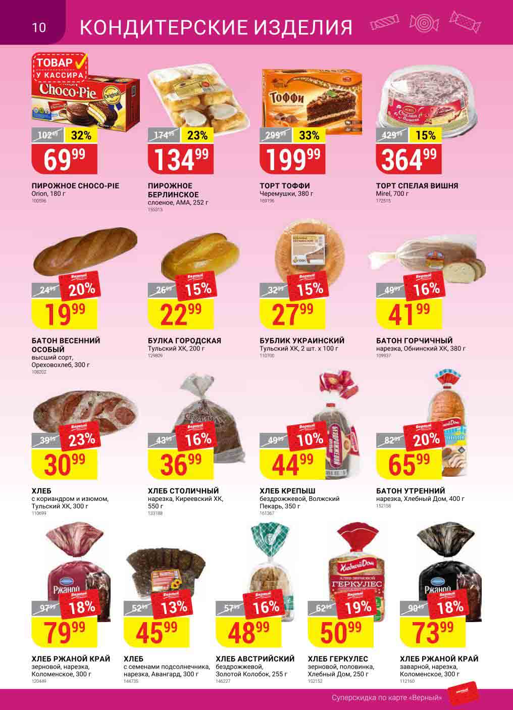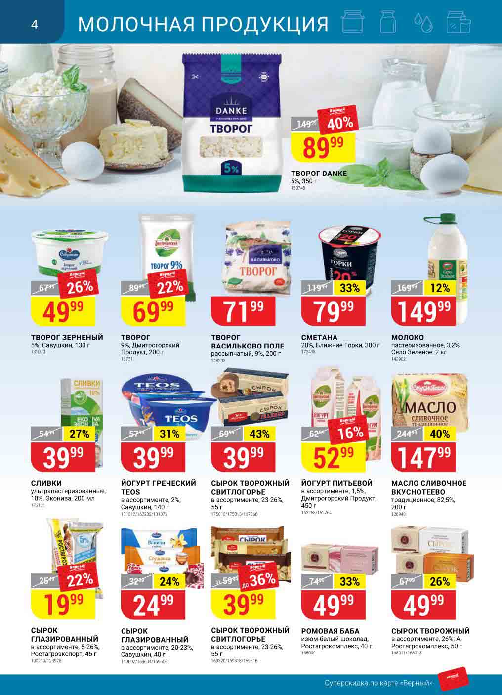 На страницах каталога Верный вы найдете все свои любимые товары, которые сейчас предлагаются в супермаркете. Еженедельное снижение цен на определенные виды, как продовольственных, так и хозтоваров. Цены по акции Верный действуют в городах: Москва, Балашиха, Химки, Подольск, Королев, Мытищи, Люберцы, Электросталь, Коломна, Одинцово, Железнодорожный, Серпухов, Орехово-Зуево, Красногорск, Щелково, Сергиев Посад, Пушкино, Жуковский, Ногинск, Раменское, Клин, Воскресенск, Домодедово и многих других населенных пунктах Московского региона.
