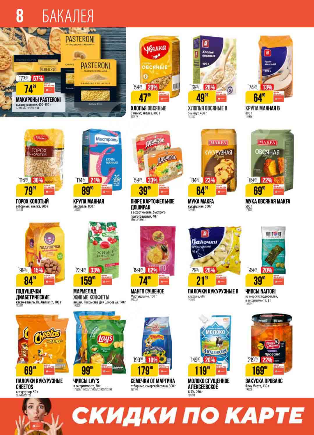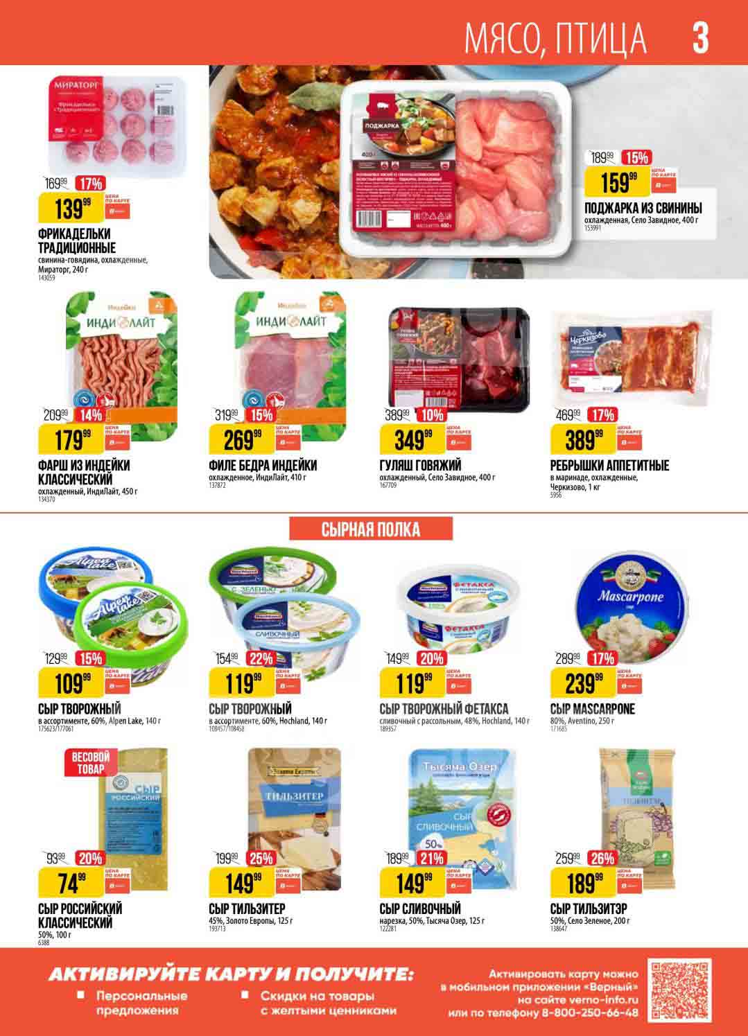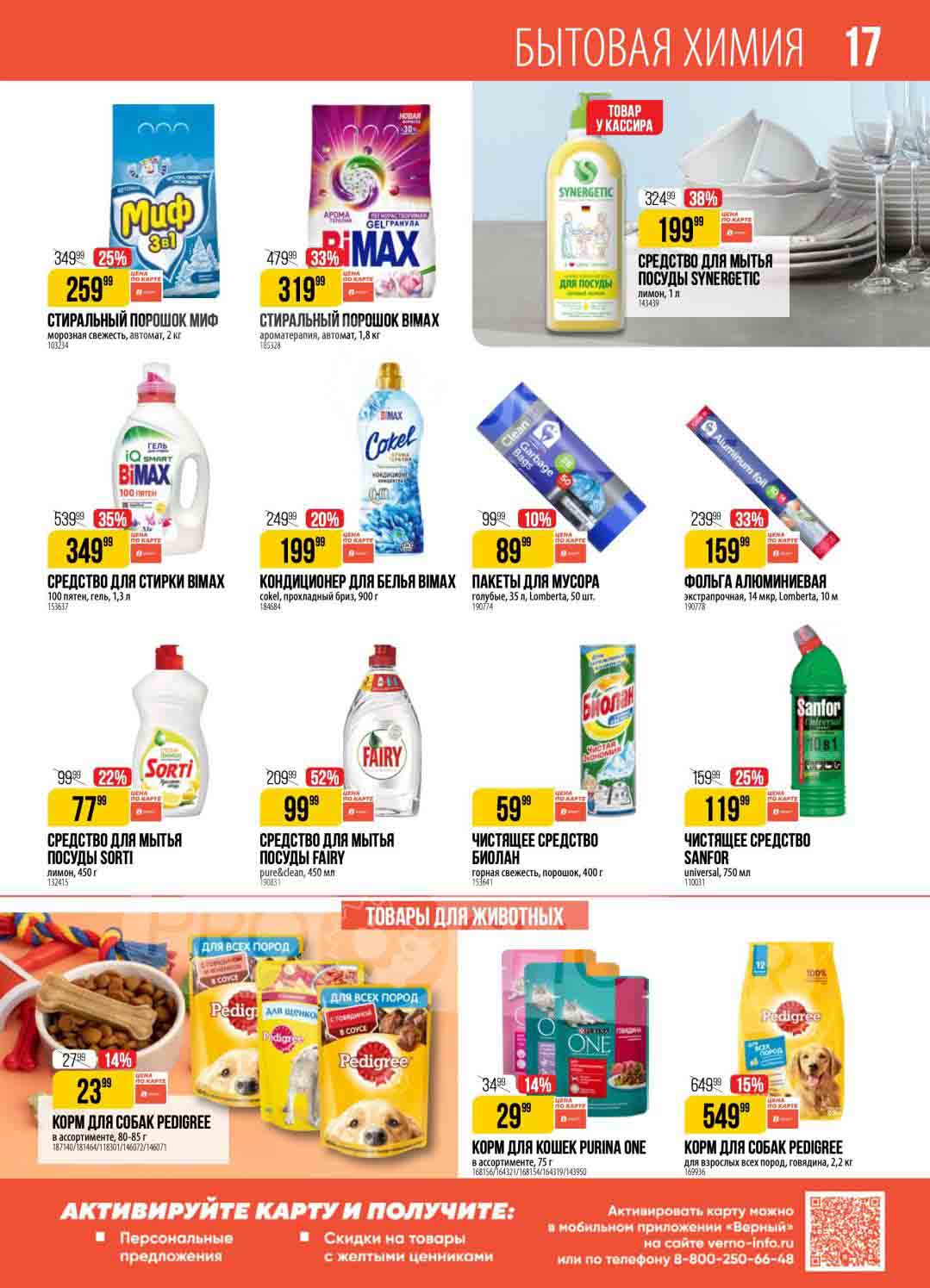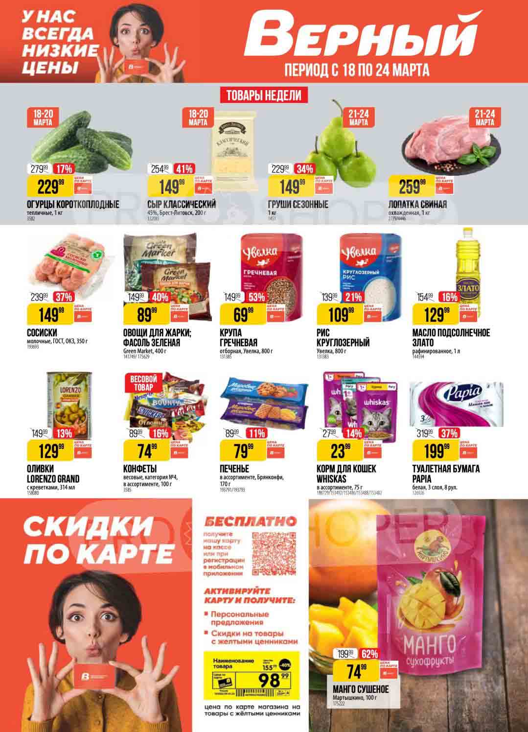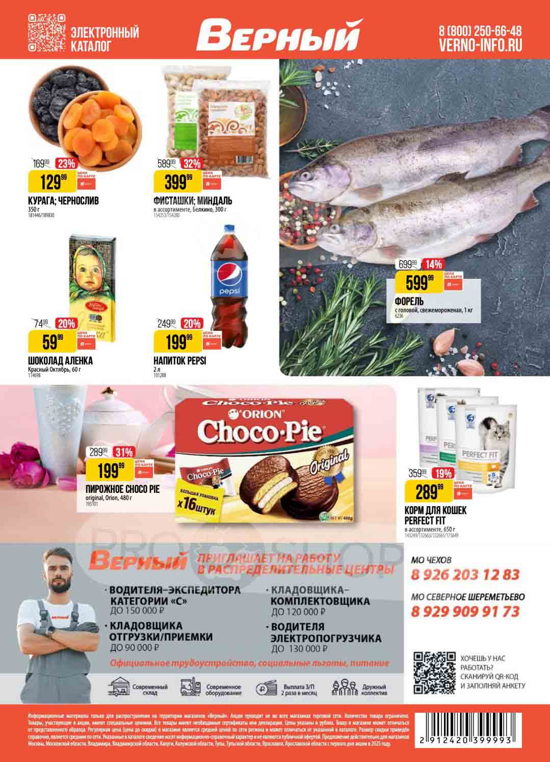 На страницах каталога Верный вы найдете все свои любимые товары, которые сейчас предлагаются в супермаркете. Еженедельное снижение цен на определенные виды, как продовольственных, так и хозтоваров. Цены по акции Верный действуют в городах: Москва, Балашиха, Химки, Подольск, Королев, Мытищи, Люберцы, Электросталь, Коломна, Одинцово, Железнодорожный, Серпухов, Орехово-Зуево, Красногорск, Щелково, Сергиев Посад, Пушкино, Жуковский, Ногинск, Раменское, Клин, Воскресенск, Домодедово и многих других населенных пунктах Московского региона.