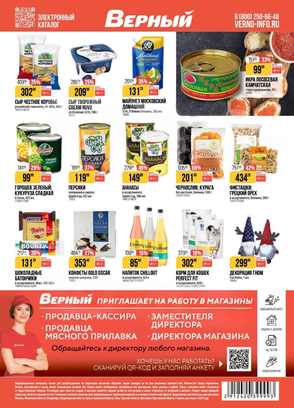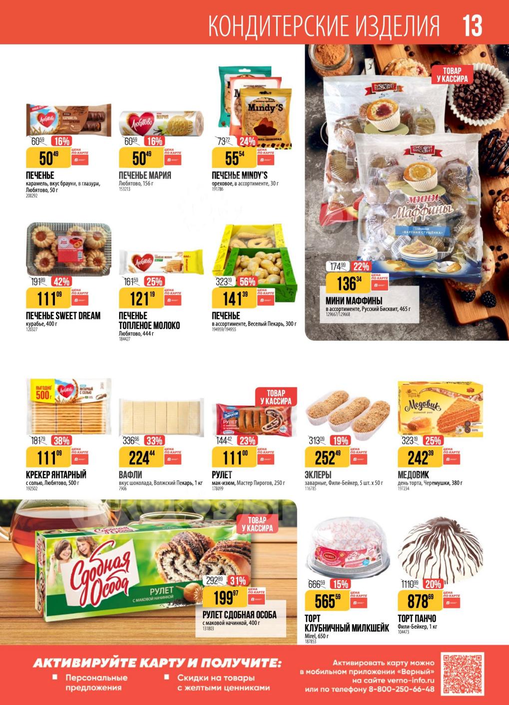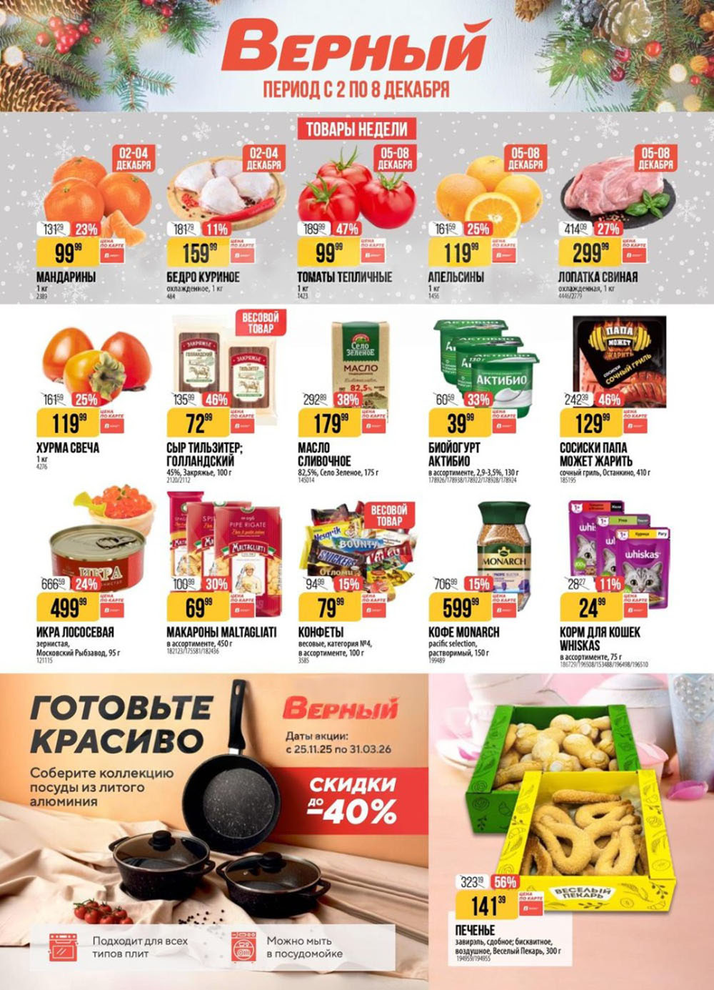 На страницах каталога Верный вы найдете все свои любимые товары, которые сейчас предлагаются в супермаркете. Еженедельное снижение цен на определенные виды, как продовольственных, так и хозтоваров. Цены по акции Верный действуют в городах: Москва, Балашиха, Химки, Подольск, Королев, Мытищи, Люберцы, Электросталь, Коломна, Одинцово, Железнодорожный, Серпухов, Орехово-Зуево, Красногорск, Щелково, Сергиев Посад, Пушкино, Жуковский, Ногинск, Раменское, Клин, Воскресенск, Домодедово и многих других населенных пунктах Московского региона.