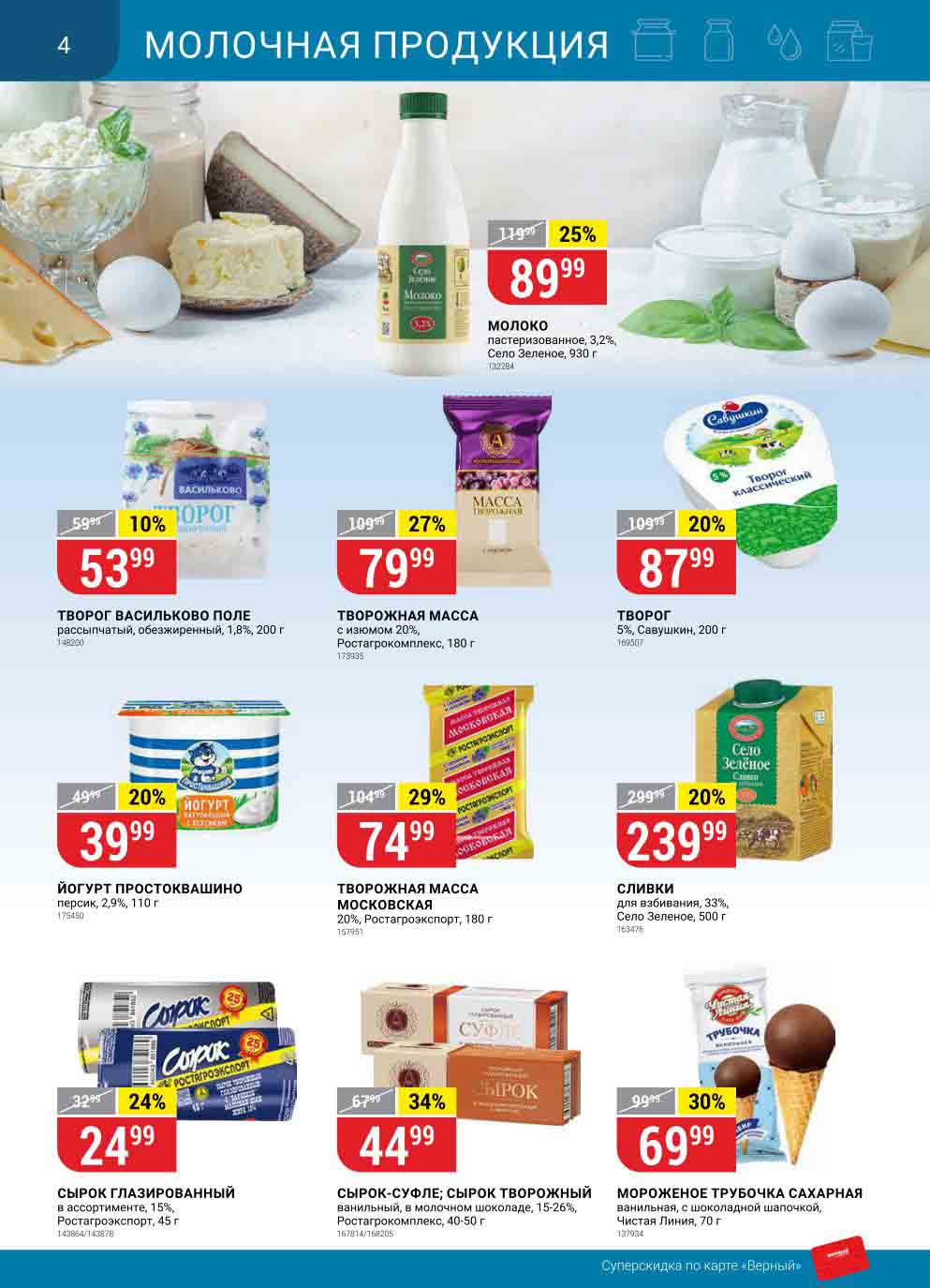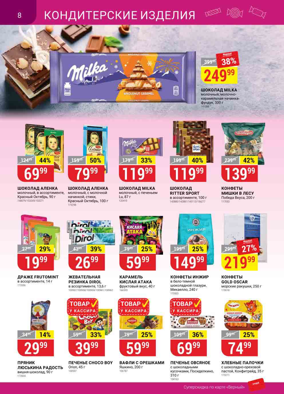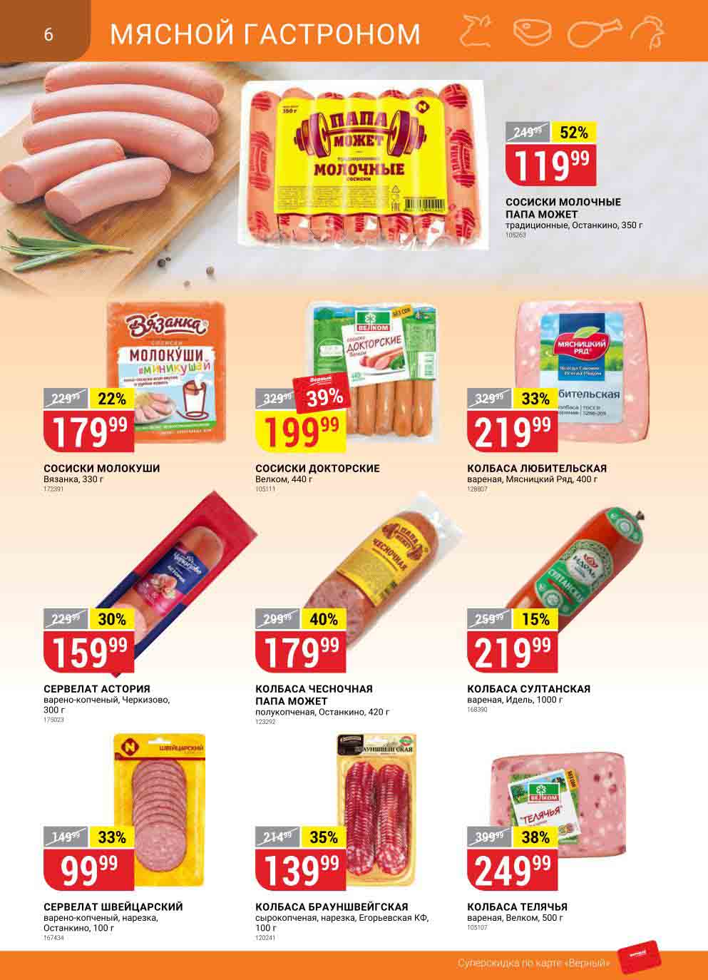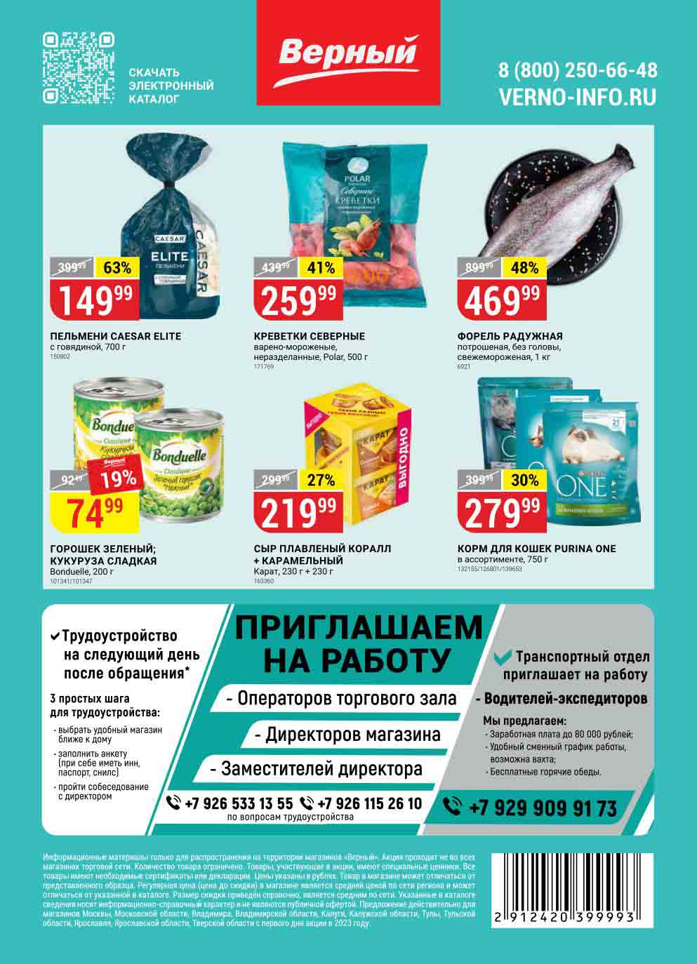 На страницах каталога Верный вы найдете все свои любимые товары, которые сейчас предлагаются в супермаркете. Еженедельное снижение цен на определенные виды, как продовольственных, так и хозтоваров. Цены по акции Верный действуют в городах: Москва, Балашиха, Химки, Подольск, Королев, Мытищи, Люберцы, Электросталь, Коломна, Одинцово, Железнодорожный, Серпухов, Орехово-Зуево, Красногорск, Щелково, Сергиев Посад, Пушкино, Жуковский, Ногинск, Раменское, Клин, Воскресенск, Домодедово и многих других населенных пунктах Московского региона.