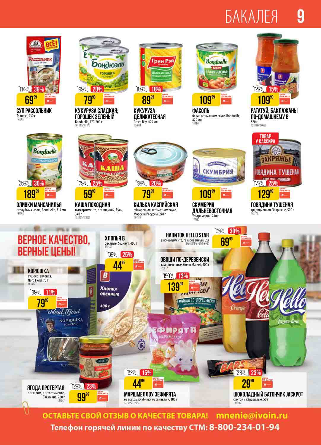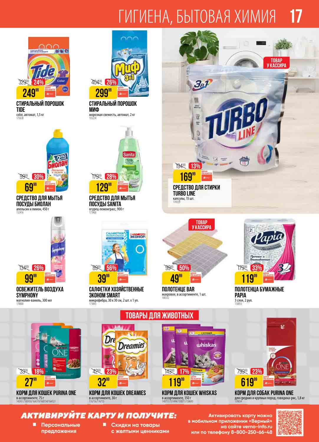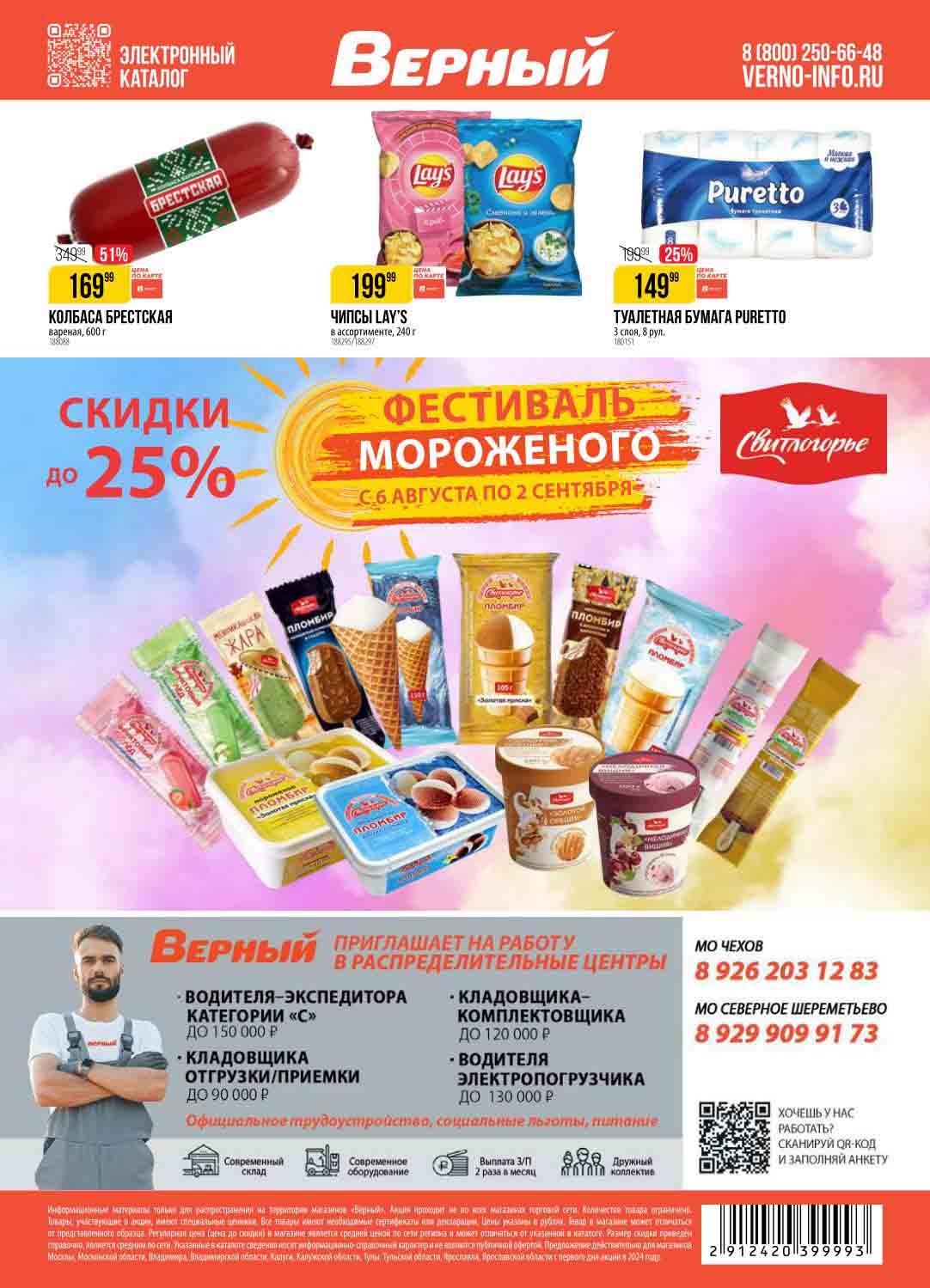 На страницах каталога Верный вы найдете все свои любимые товары, которые сейчас предлагаются в супермаркете. Еженедельное снижение цен на определенные виды, как продовольственных, так и хозтоваров. Цены по акции Верный действуют в городах: Москва, Балашиха, Химки, Подольск, Королев, Мытищи, Люберцы, Электросталь, Коломна, Одинцово, Железнодорожный, Серпухов, Орехово-Зуево, Красногорск, Щелково, Сергиев Посад, Пушкино, Жуковский, Ногинск, Раменское, Клин, Воскресенск, Домодедово и многих других населенных пунктах Московского региона.