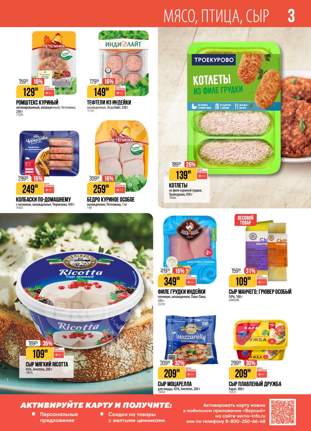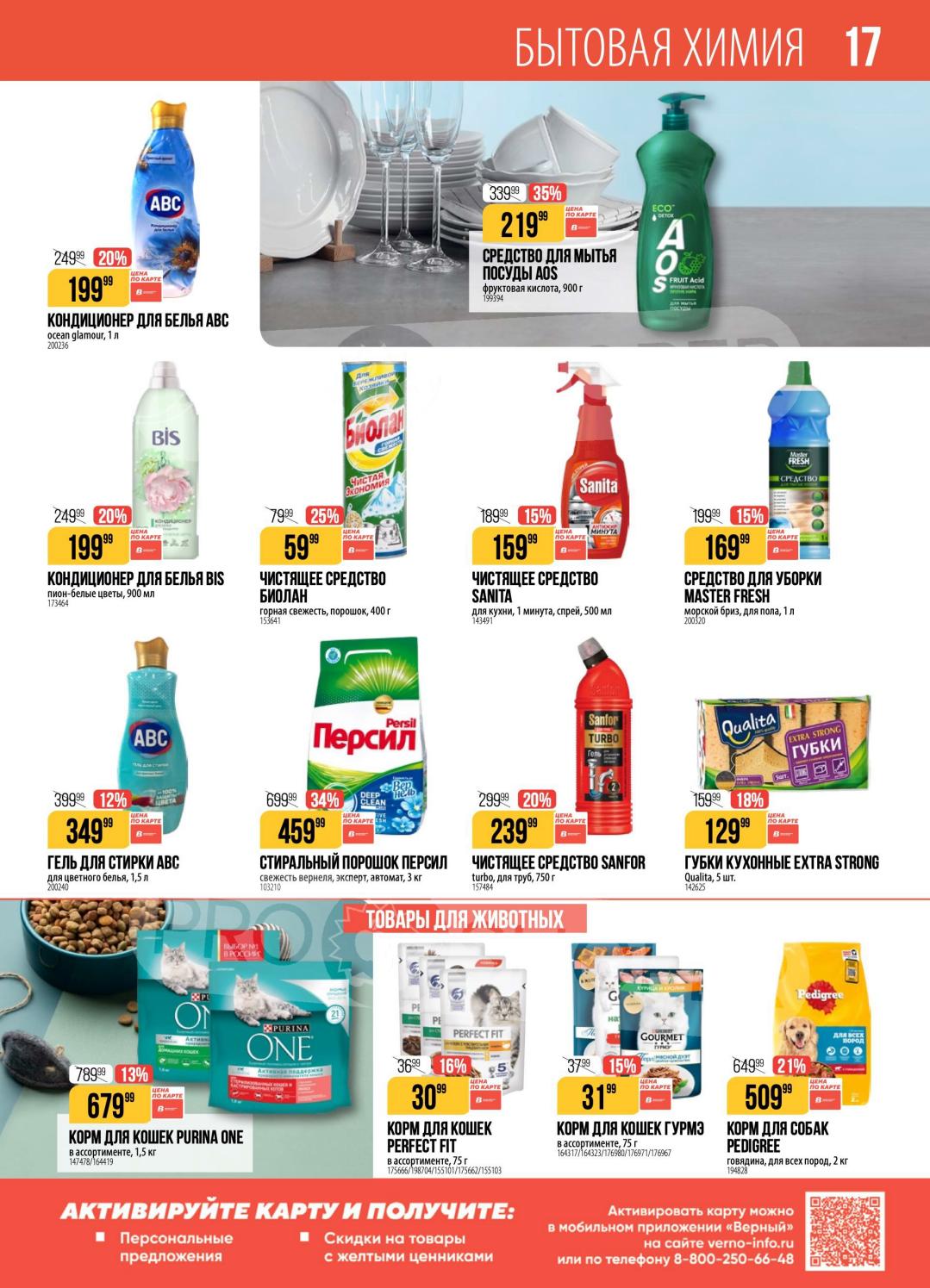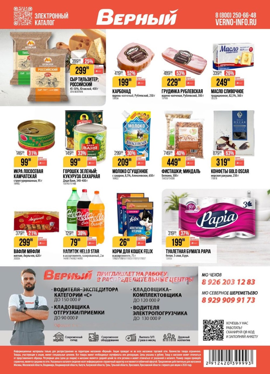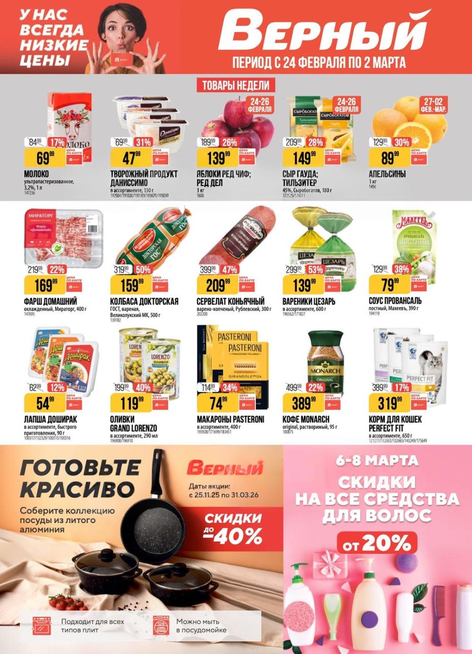 На страницах каталога Верный вы найдете все свои любимые товары, которые сейчас предлагаются в супермаркете. Еженедельное снижение цен на определенные виды, как продовольственных, так и хозтоваров. Цены по акции Верный действуют в городах: Москва, Балашиха, Химки, Подольск, Королев, Мытищи, Люберцы, Электросталь, Коломна, Одинцово, Железнодорожный, Серпухов, Орехово-Зуево, Красногорск, Щелково, Сергиев Посад, Пушкино, Жуковский, Ногинск, Раменское, Клин, Воскресенск, Домодедово и многих других населенных пунктах Московского региона.