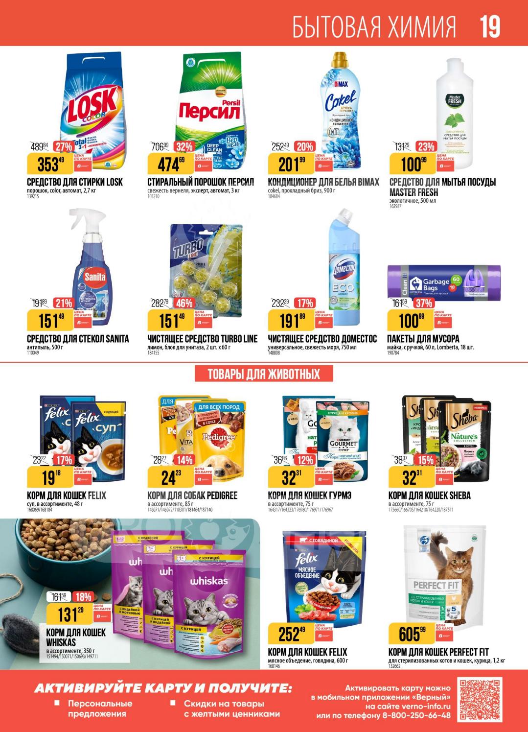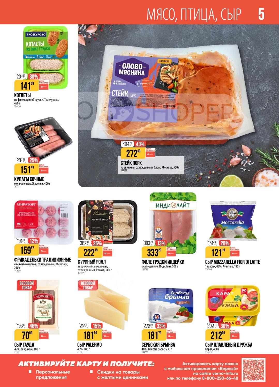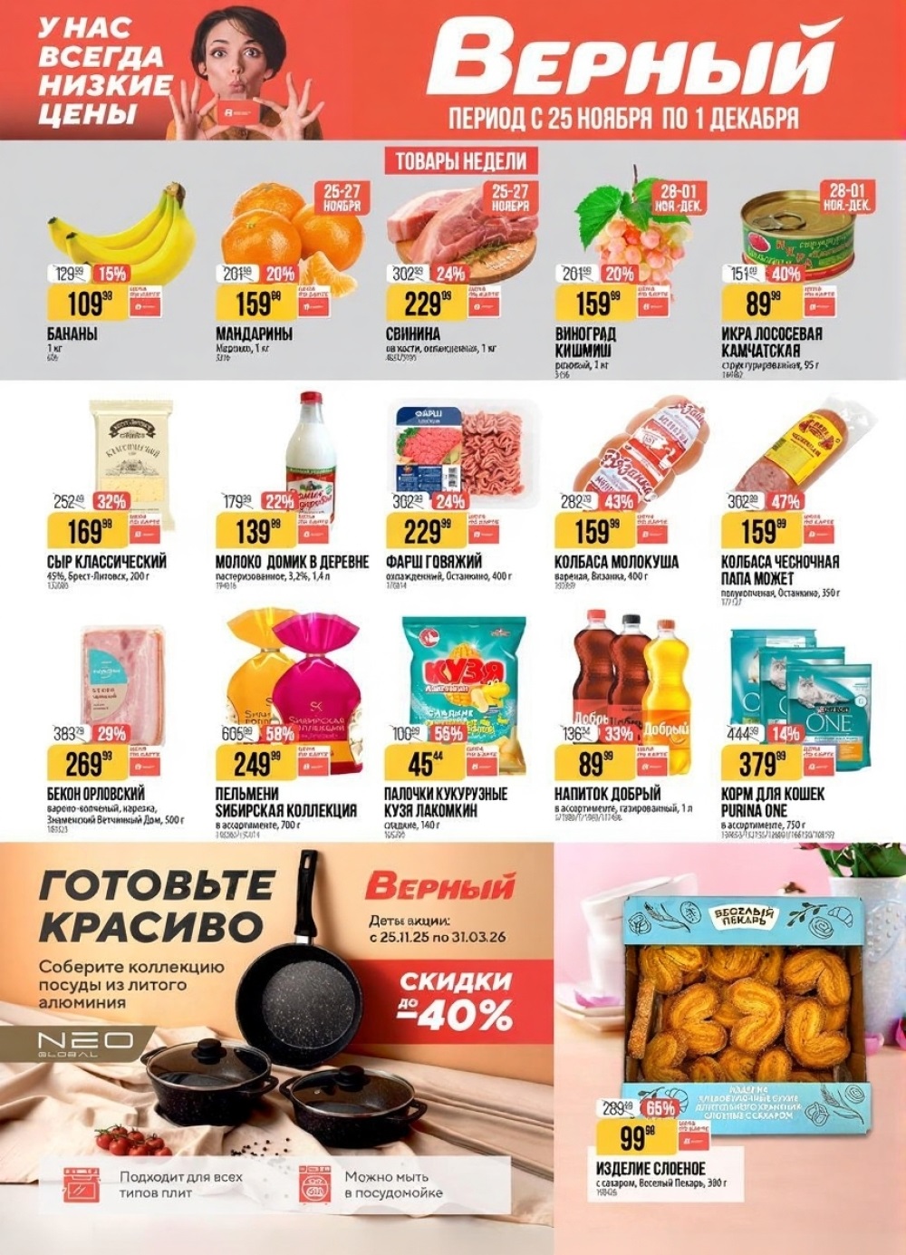 На страницах каталога Верный вы найдете все свои любимые товары, которые сейчас предлагаются в супермаркете. Еженедельное снижение цен на определенные виды, как продовольственных, так и хозтоваров. Цены по акции Верный действуют в городах: Москва, Балашиха, Химки, Подольск, Королев, Мытищи, Люберцы, Электросталь, Коломна, Одинцово, Железнодорожный, Серпухов, Орехово-Зуево, Красногорск, Щелково, Сергиев Посад, Пушкино, Жуковский, Ногинск, Раменское, Клин, Воскресенск, Домодедово и многих других населенных пунктах Московского региона.