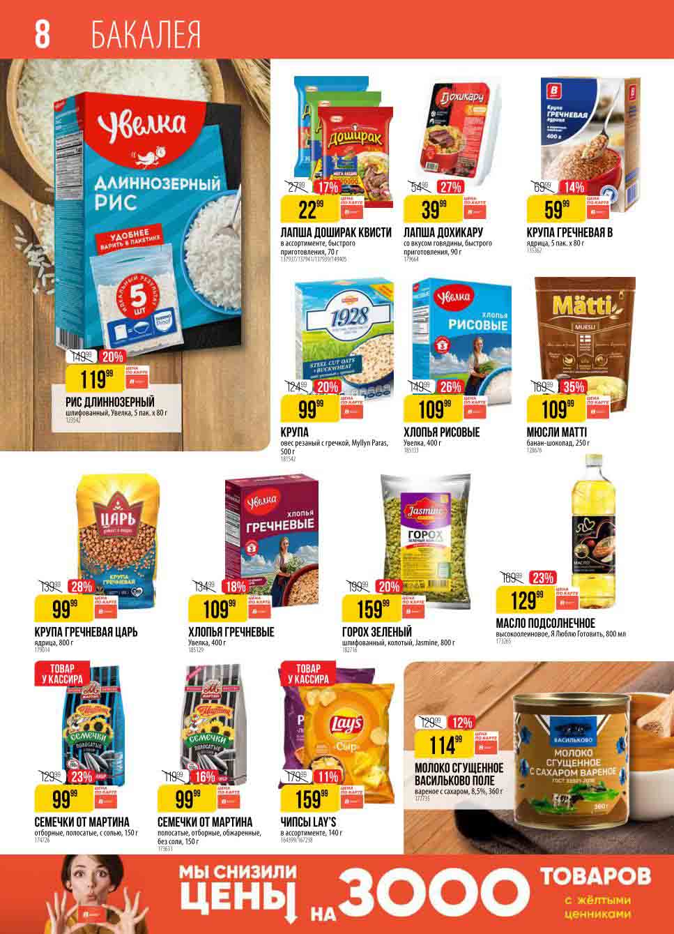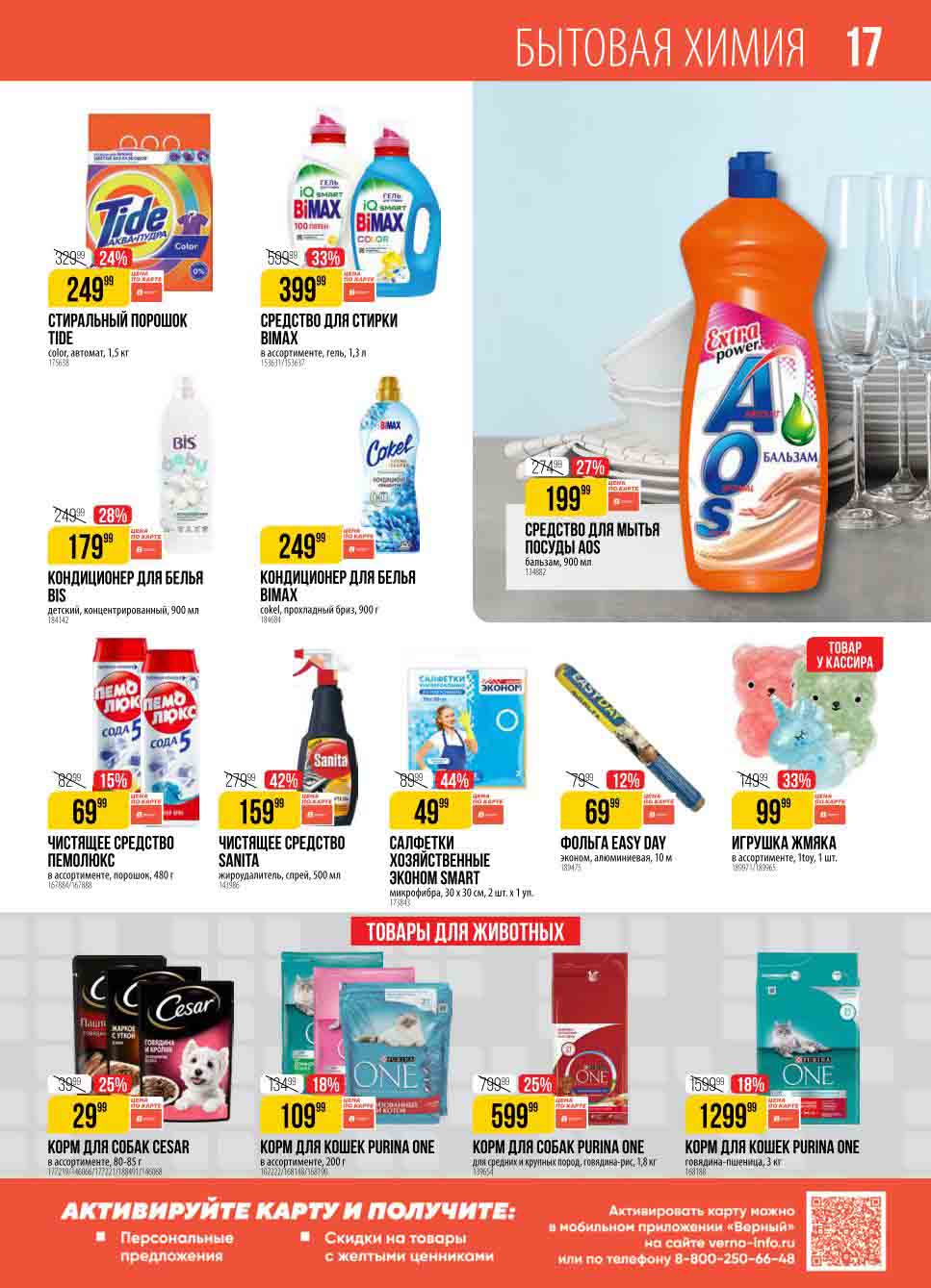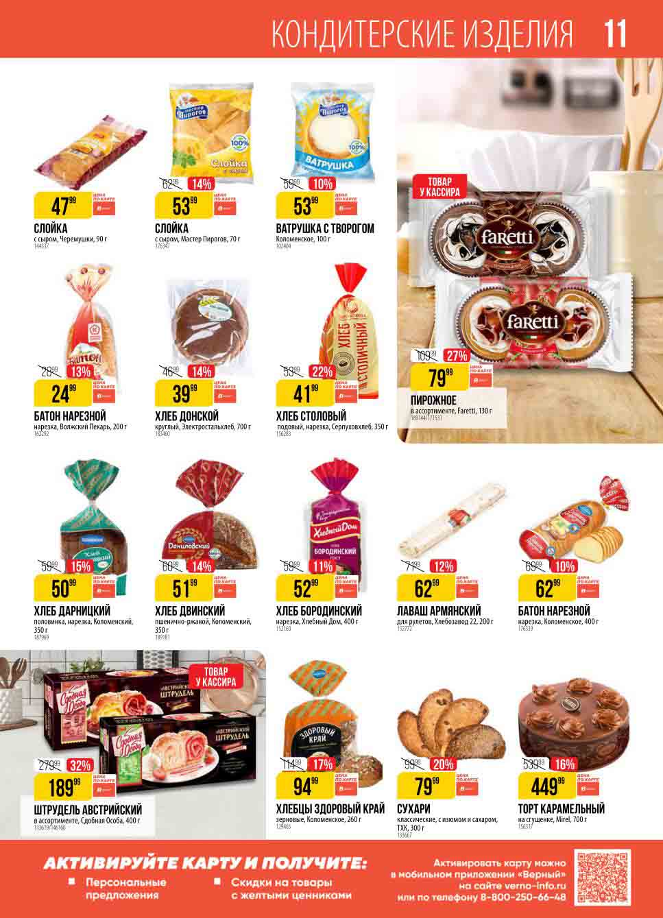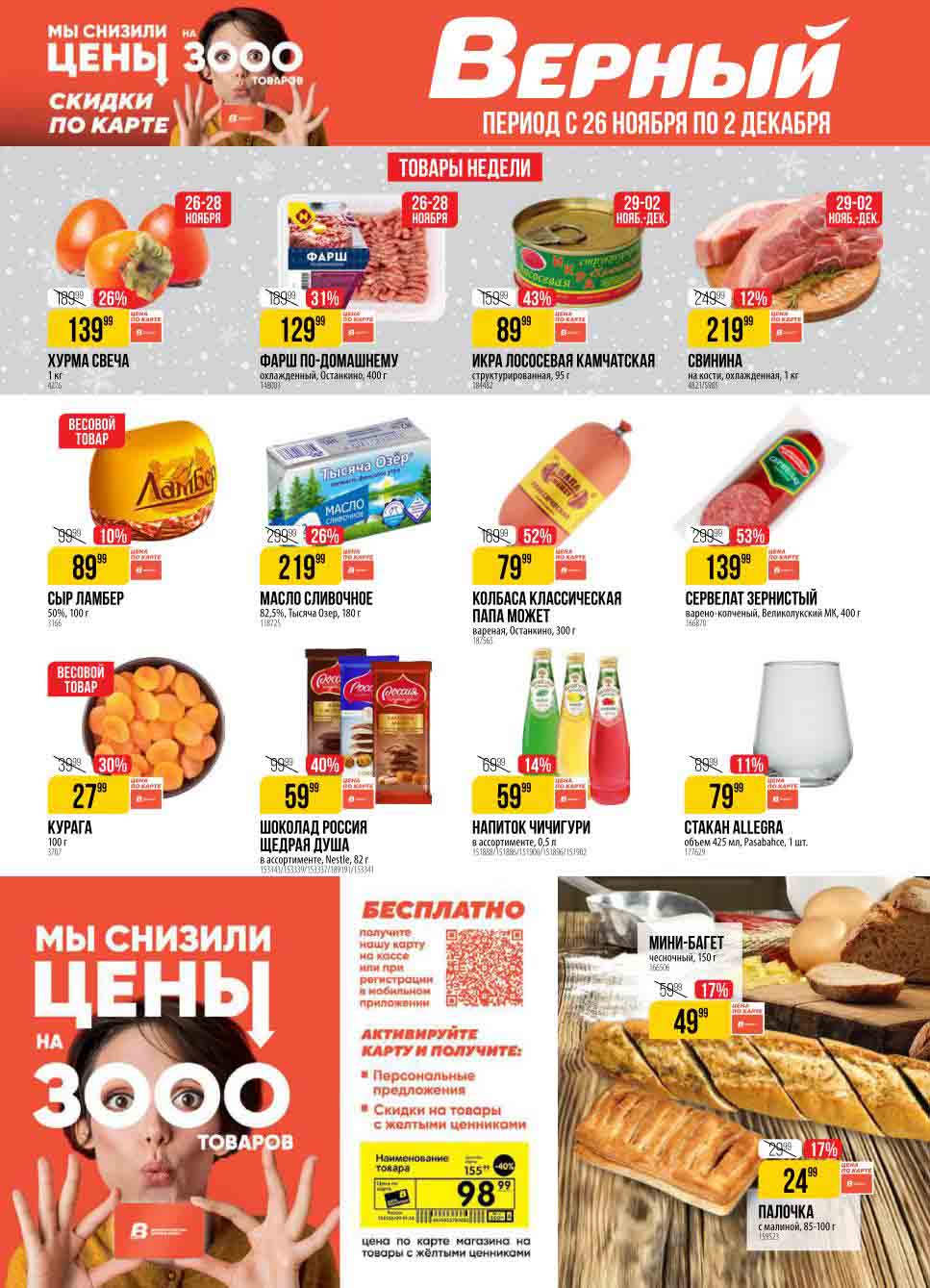 На страницах каталога Верный вы найдете все свои любимые товары, которые сейчас предлагаются в супермаркете. Еженедельное снижение цен на определенные виды, как продовольственных, так и хозтоваров. Цены по акции Верный действуют в городах: Москва, Балашиха, Химки, Подольск, Королев, Мытищи, Люберцы, Электросталь, Коломна, Одинцово, Железнодорожный, Серпухов, Орехово-Зуево, Красногорск, Щелково, Сергиев Посад, Пушкино, Жуковский, Ногинск, Раменское, Клин, Воскресенск, Домодедово и многих других населенных пунктах Московского региона.