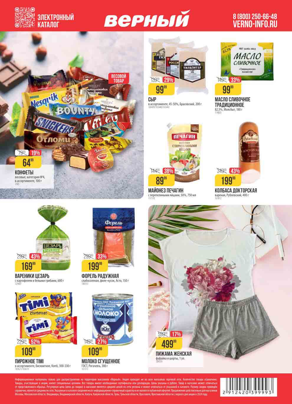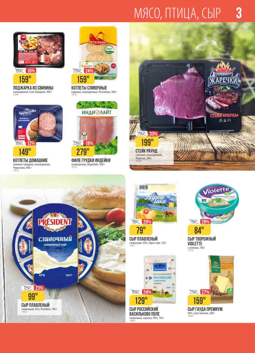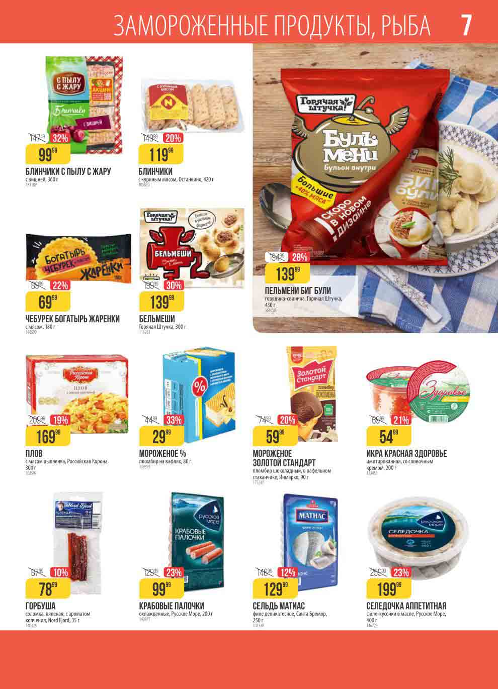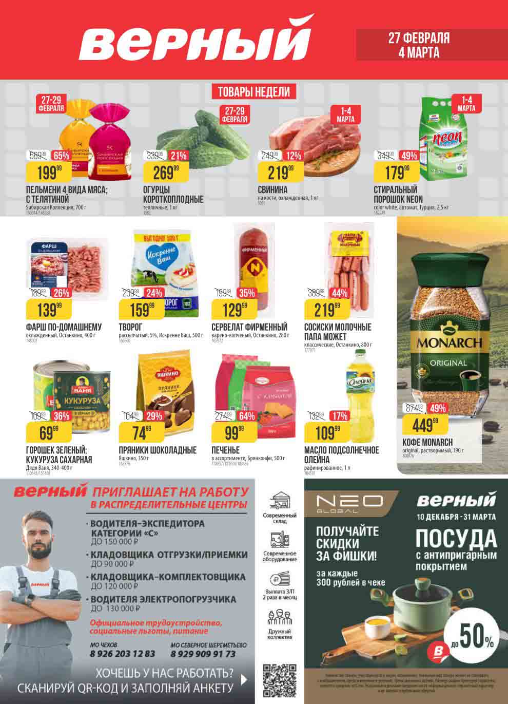 В акционном буклете предложены выгодные цены на различные товары, такие как свинина за 219.99 ₽, пельмени со скидкой 65%, овощи, минус 49 % на кофе monarch, сосиски за 219.99 ₽, стиральный порошок и многое другое.