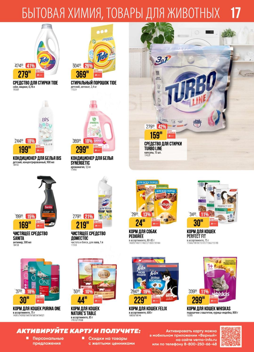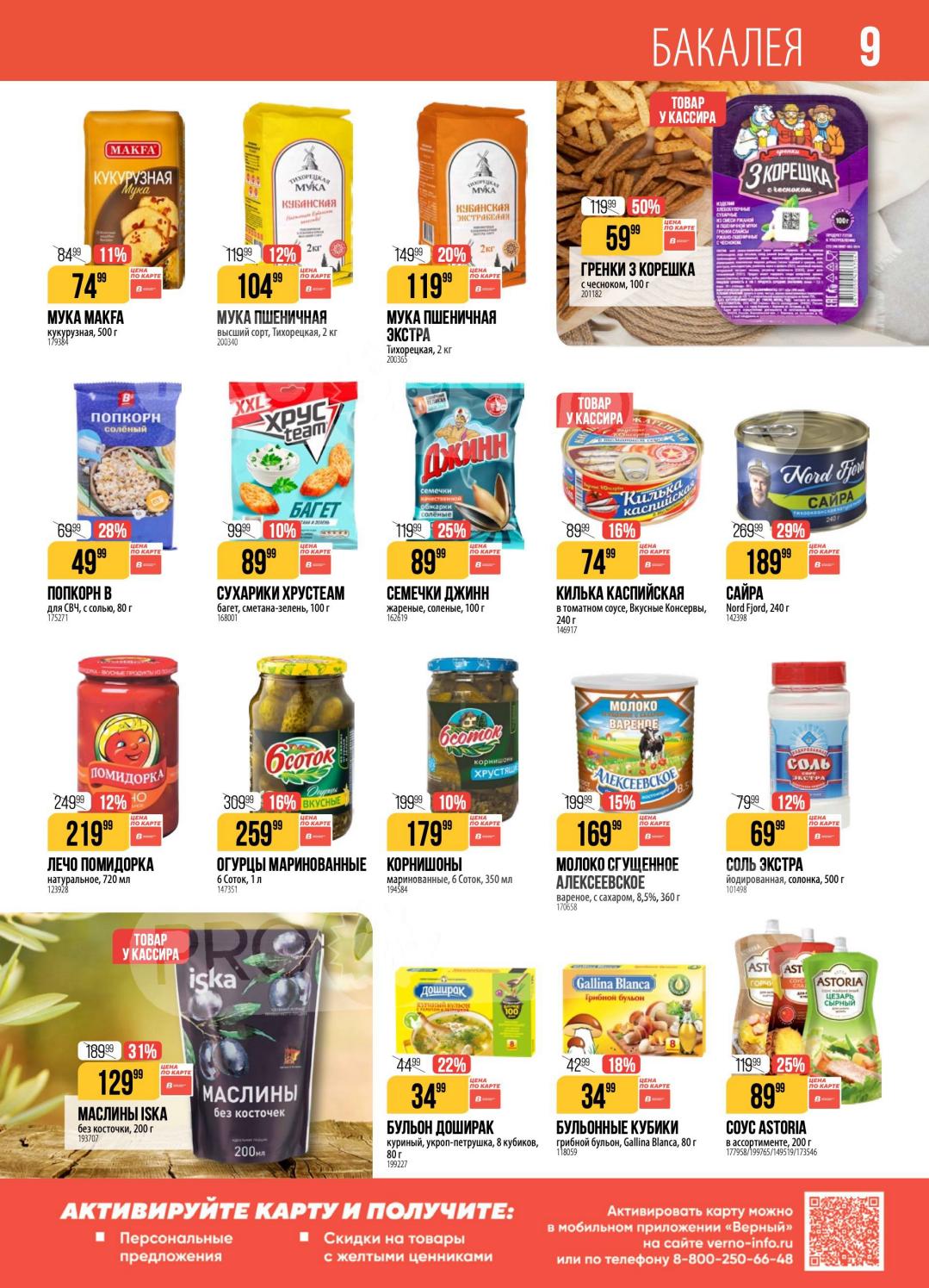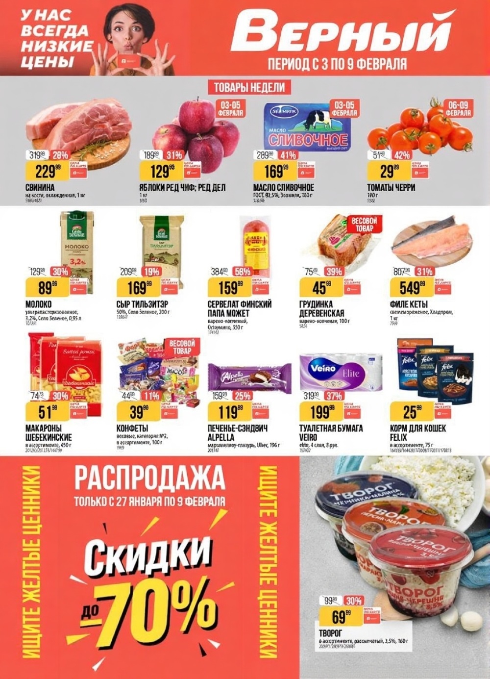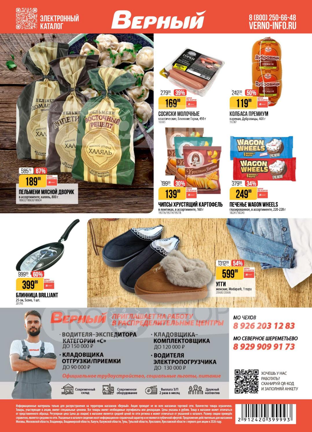На страницах каталога Верный вы найдете все свои любимые товары, которые сейчас предлагаются в супермаркете. Еженедельное снижение цен на определенные виды, как продовольственных, так и хозтоваров. Цены по акции Верный действуют в городах: Москва, Балашиха, Химки, Подольск, Королев, Мытищи, Люберцы, Электросталь, Коломна, Одинцово, Железнодорожный, Серпухов, Орехово-Зуево, Красногорск, Щелково, Сергиев Посад, Пушкино, Жуковский, Ногинск, Раменское, Клин, Воскресенск, Домодедово и многих других населенных пунктах Московского региона.