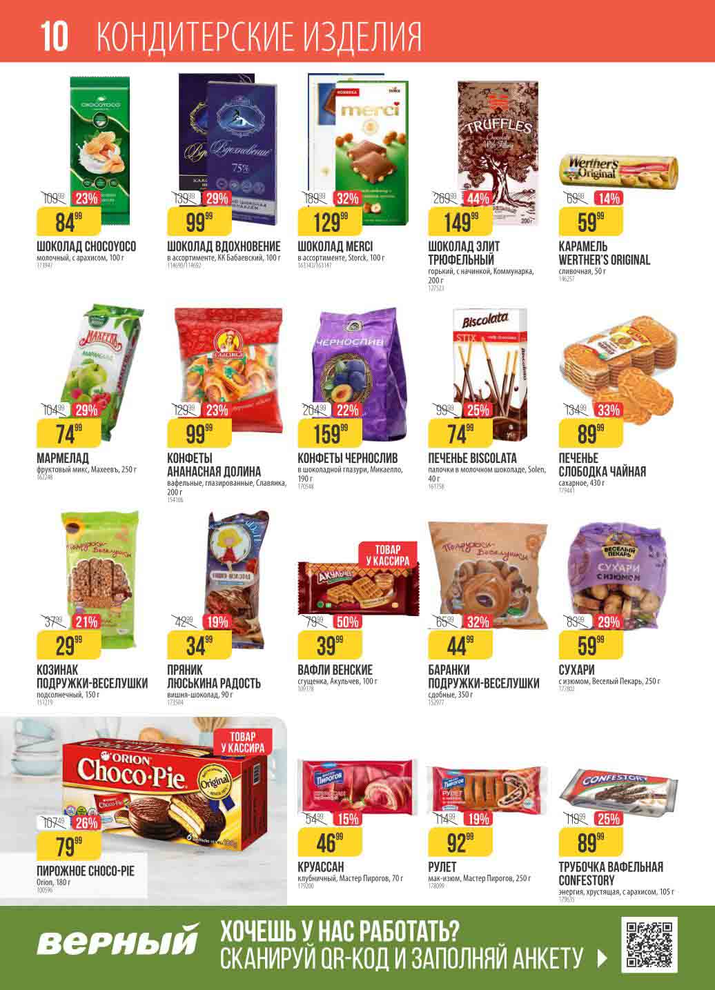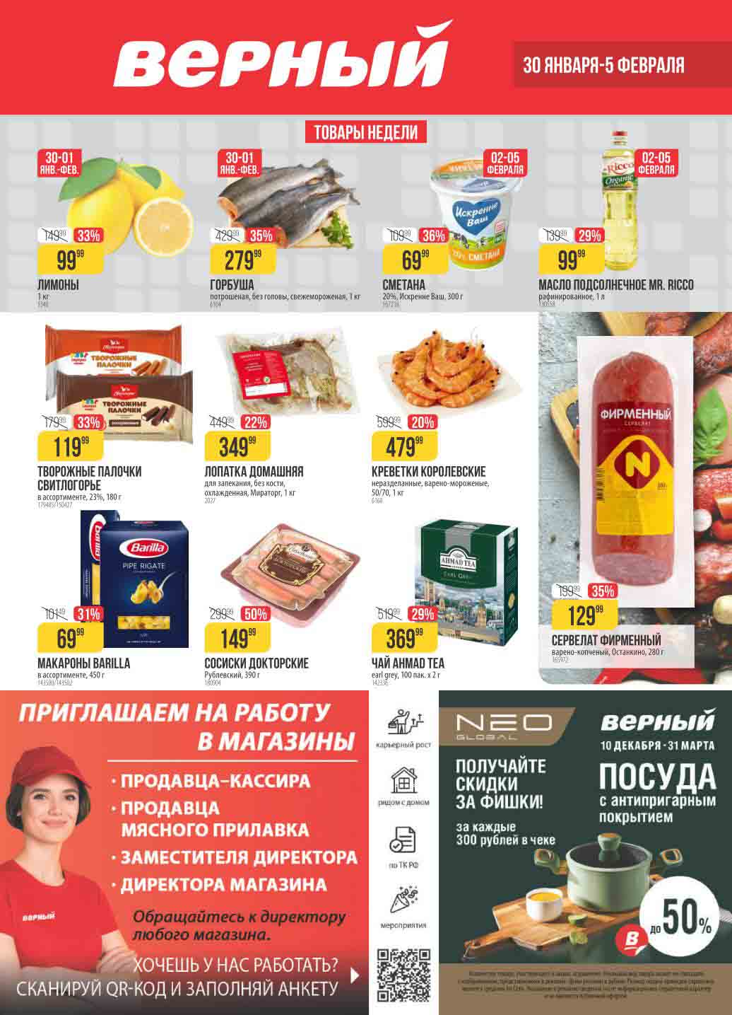 Новые цены на «товары недели» включая лимоны, горбушу, сметану, подсолнечное масло, творог, макароны, колбасы, чай, креветки и многое другое. Скидки в буклете варьируются от 10% до 50% от первоначальных цен.