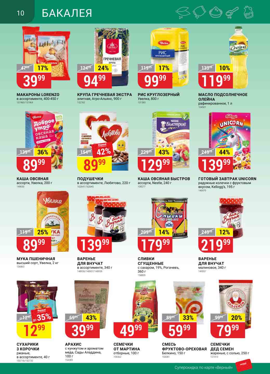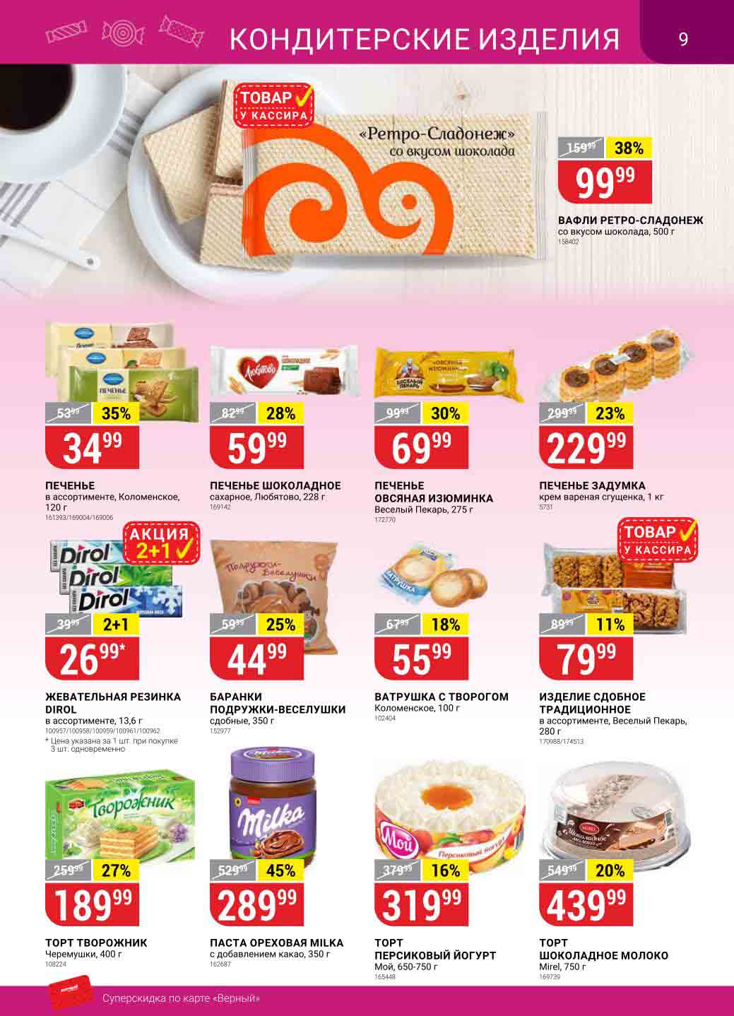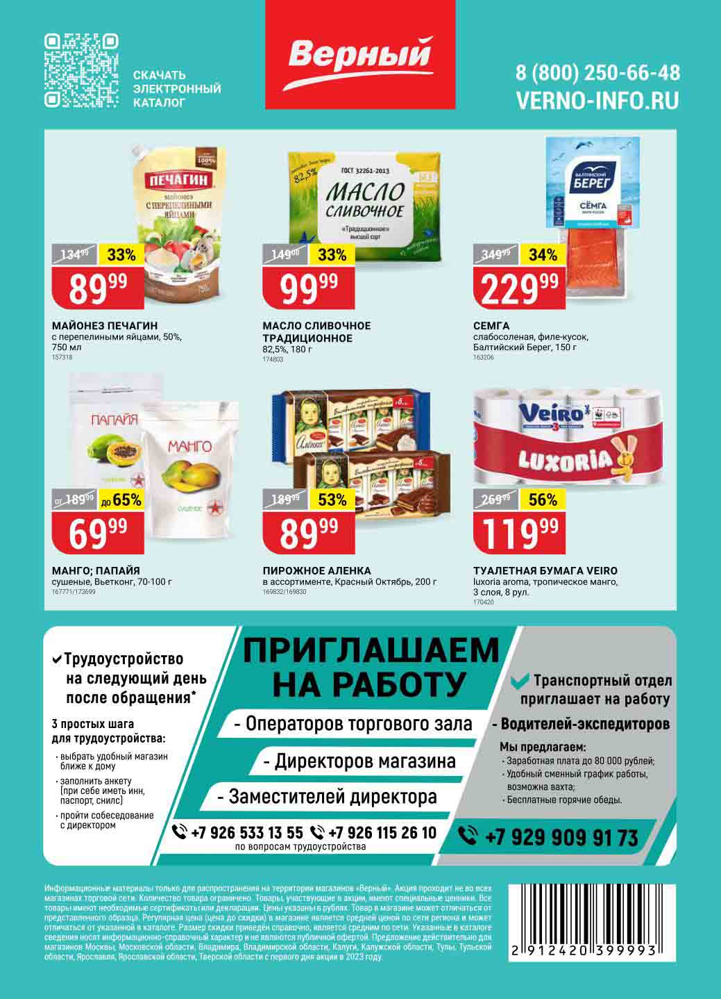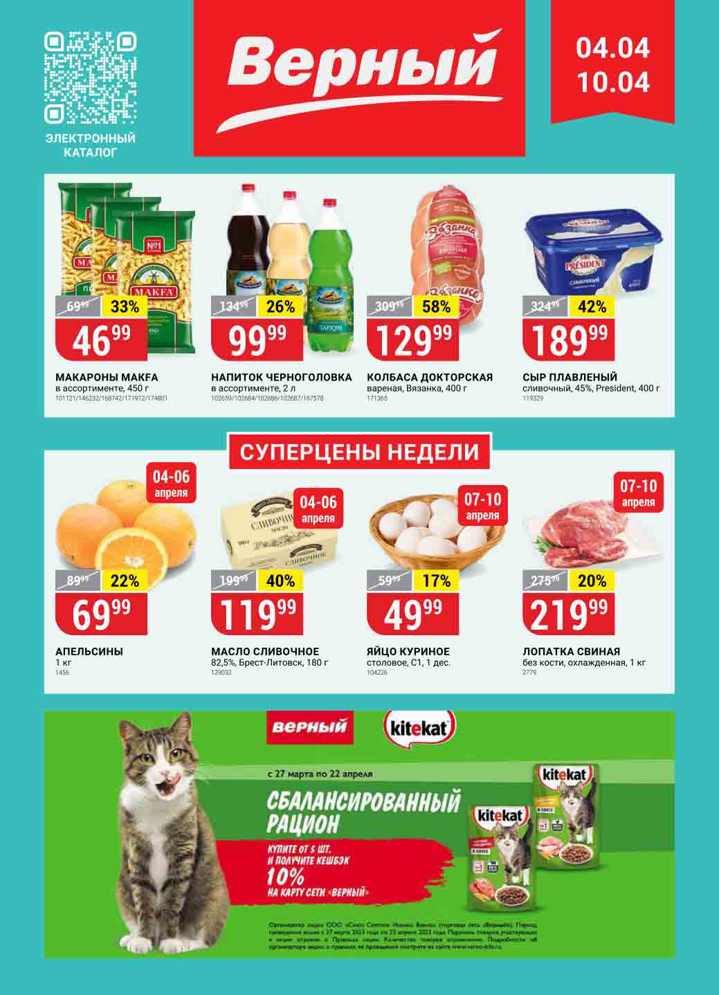 На страницах каталога Верный вы найдете все свои любимые товары, которые сейчас предлагаются в супермаркете. Еженедельное снижение цен на определенные виды, как продовольственных, так и хозтоваров. Цены по акции Верный действуют в городах: Москва, Балашиха, Химки, Подольск, Королев, Мытищи, Люберцы, Электросталь, Коломна, Одинцово, Железнодорожный, Серпухов, Орехово-Зуево, Красногорск, Щелково, Сергиев Посад, Пушкино, Жуковский, Ногинск, Раменское, Клин, Воскресенск, Домодедово и многих других населенных пунктах Московского региона.