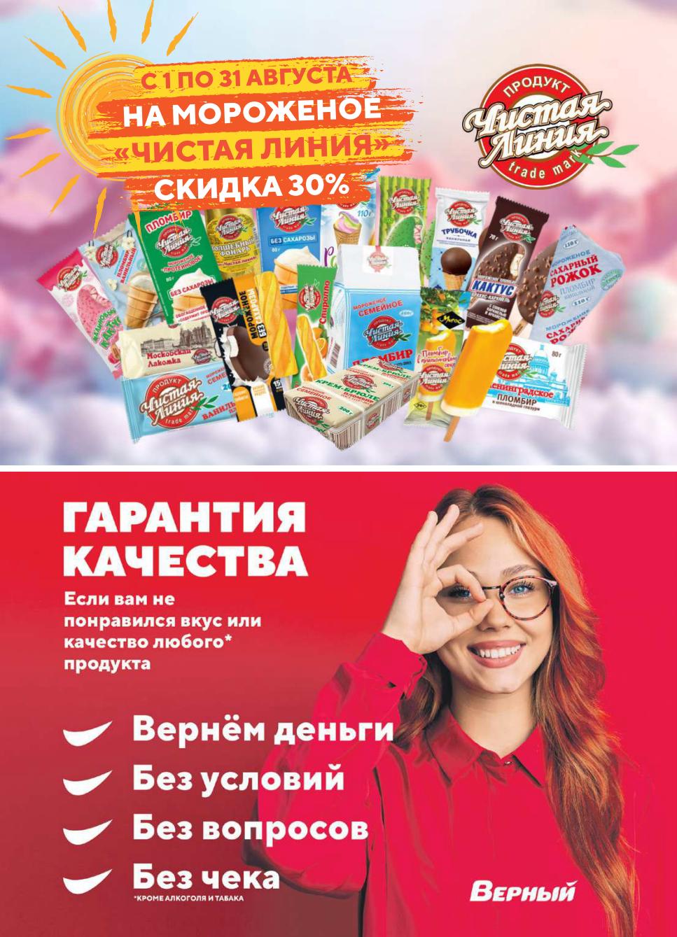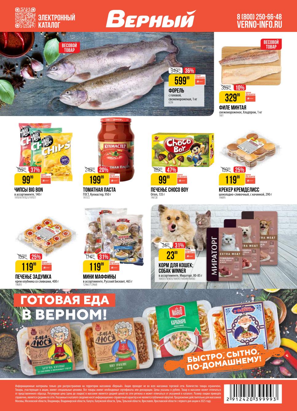 На страницах каталога Верный вы найдете все свои любимые товары, которые сейчас предлагаются в супермаркете. Еженедельное снижение цен на определенные виды, как продовольственных, так и хозтоваров. Цены по акции Верный действуют в городах: Москва, Балашиха, Химки, Подольск, Королев, Мытищи, Люберцы, Электросталь, Коломна, Одинцово, Железнодорожный, Серпухов, Орехово-Зуево, Красногорск, Щелково, Сергиев Посад, Пушкино, Жуковский, Ногинск, Раменское, Клин, Воскресенск, Домодедово и многих других населенных пунктах Московского региона.