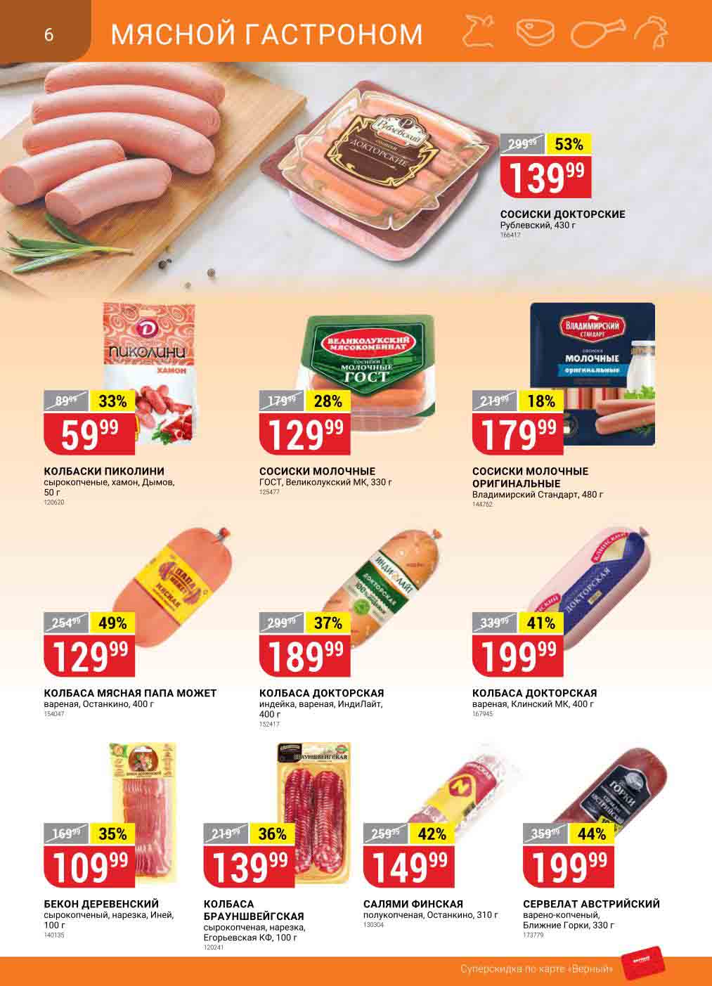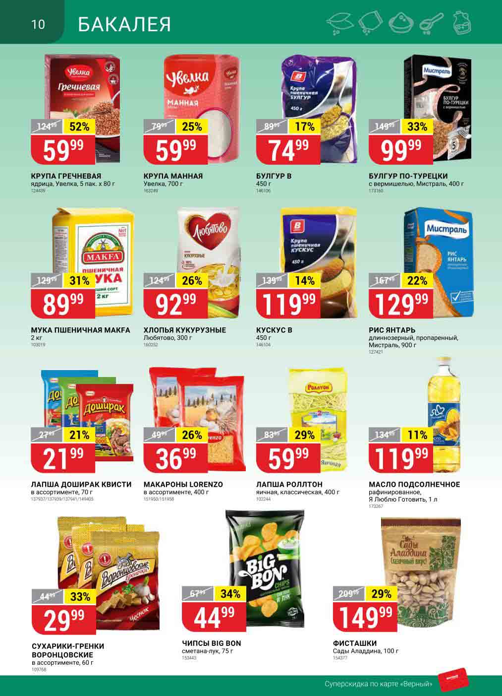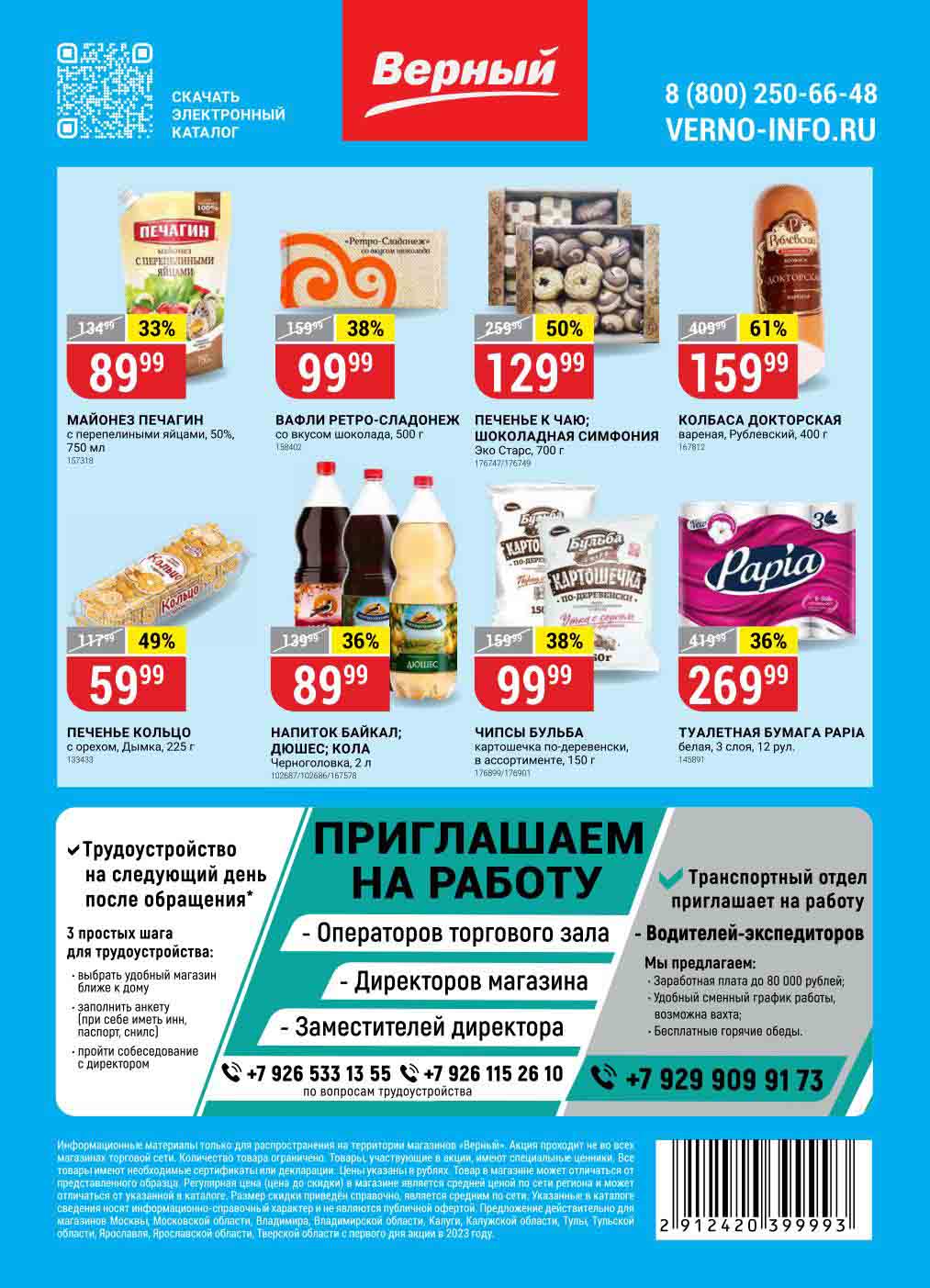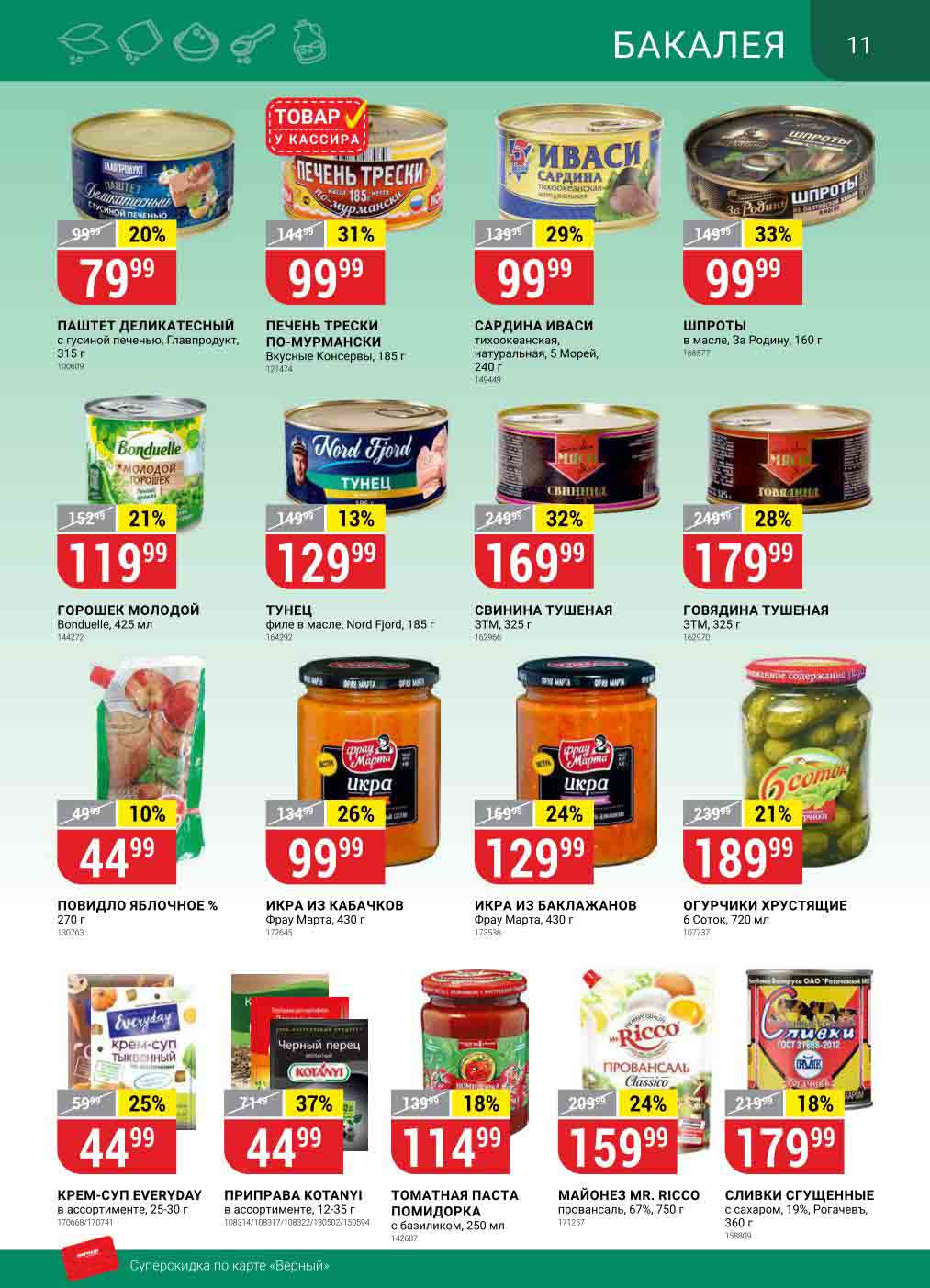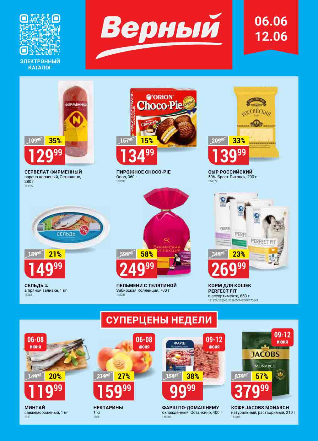 На страницах каталога Верный вы найдете все свои любимые товары, которые сейчас предлагаются в супермаркете. Еженедельное снижение цен на определенные виды, как продовольственных, так и хозтоваров. Цены по акции Верный действуют в городах: Москва, Балашиха, Химки, Подольск, Королев, Мытищи, Люберцы, Электросталь, Коломна, Одинцово, Железнодорожный, Серпухов, Орехово-Зуево, Красногорск, Щелково, Сергиев Посад, Пушкино, Жуковский, Ногинск, Раменское, Клин, Воскресенск, Домодедово и многих других населенных пунктах Московского региона.