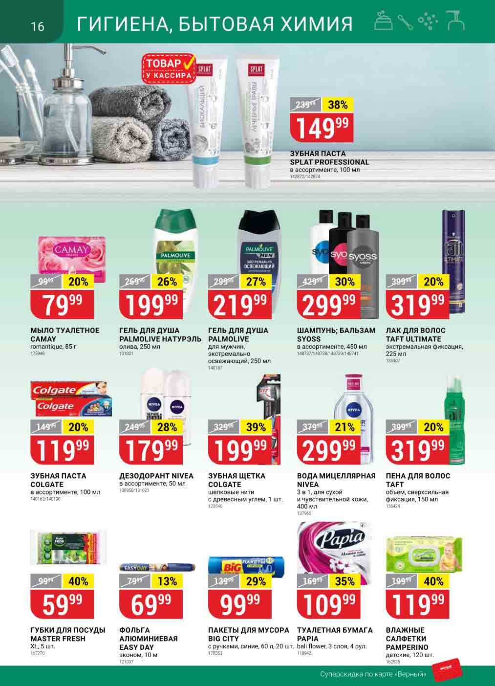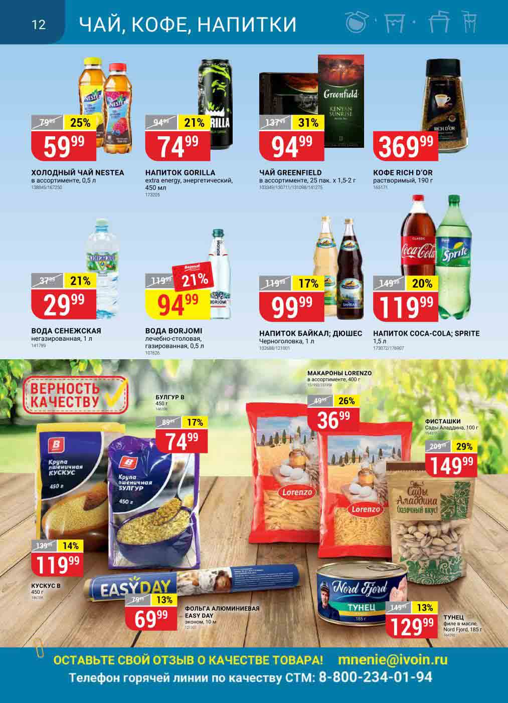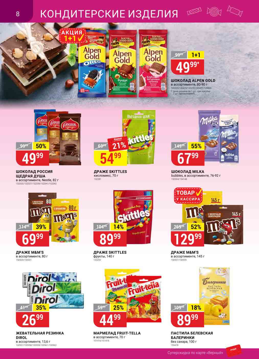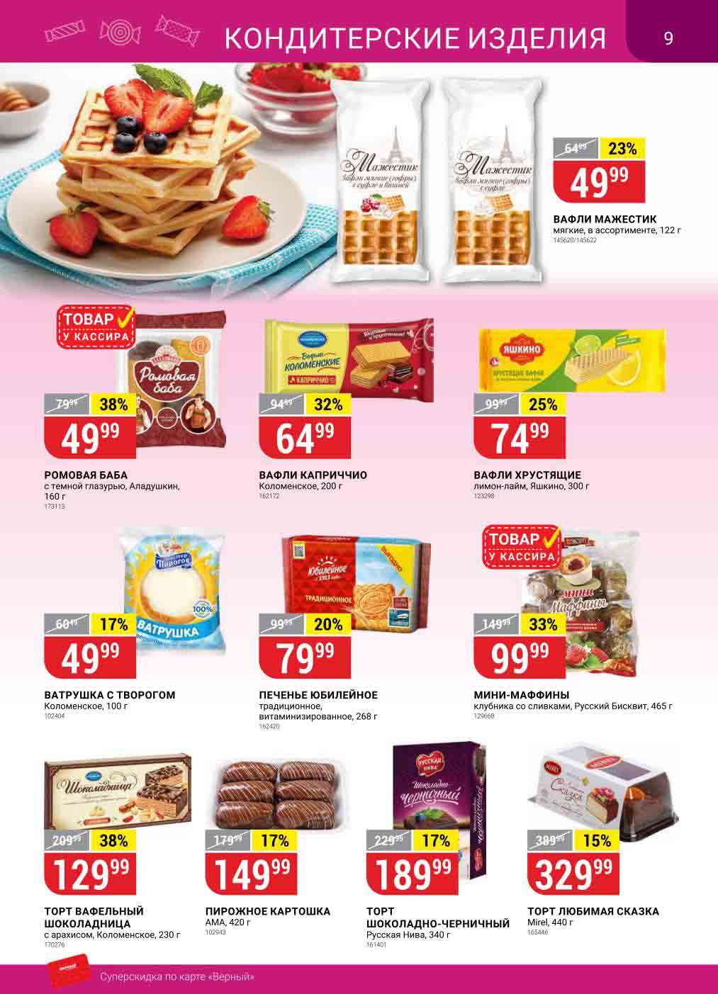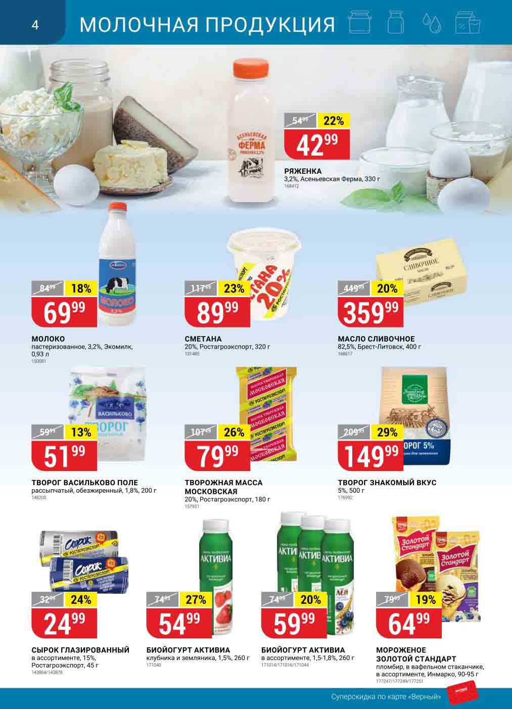 На страницах каталога Верный вы найдете все свои любимые товары, которые сейчас предлагаются в супермаркете. Еженедельное снижение цен на определенные виды, как продовольственных, так и хозтоваров. Цены по акции Верный действуют в городах: Москва, Балашиха, Химки, Подольск, Королев, Мытищи, Люберцы, Электросталь, Коломна, Одинцово, Железнодорожный, Серпухов, Орехово-Зуево, Красногорск, Щелково, Сергиев Посад, Пушкино, Жуковский, Ногинск, Раменское, Клин, Воскресенск, Домодедово и многих других населенных пунктах Московского региона.