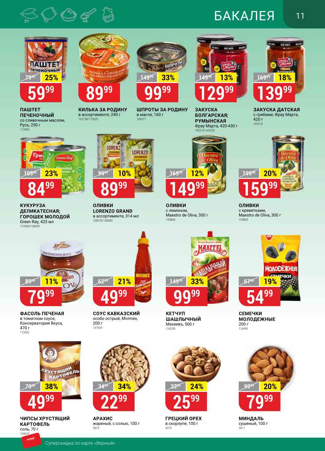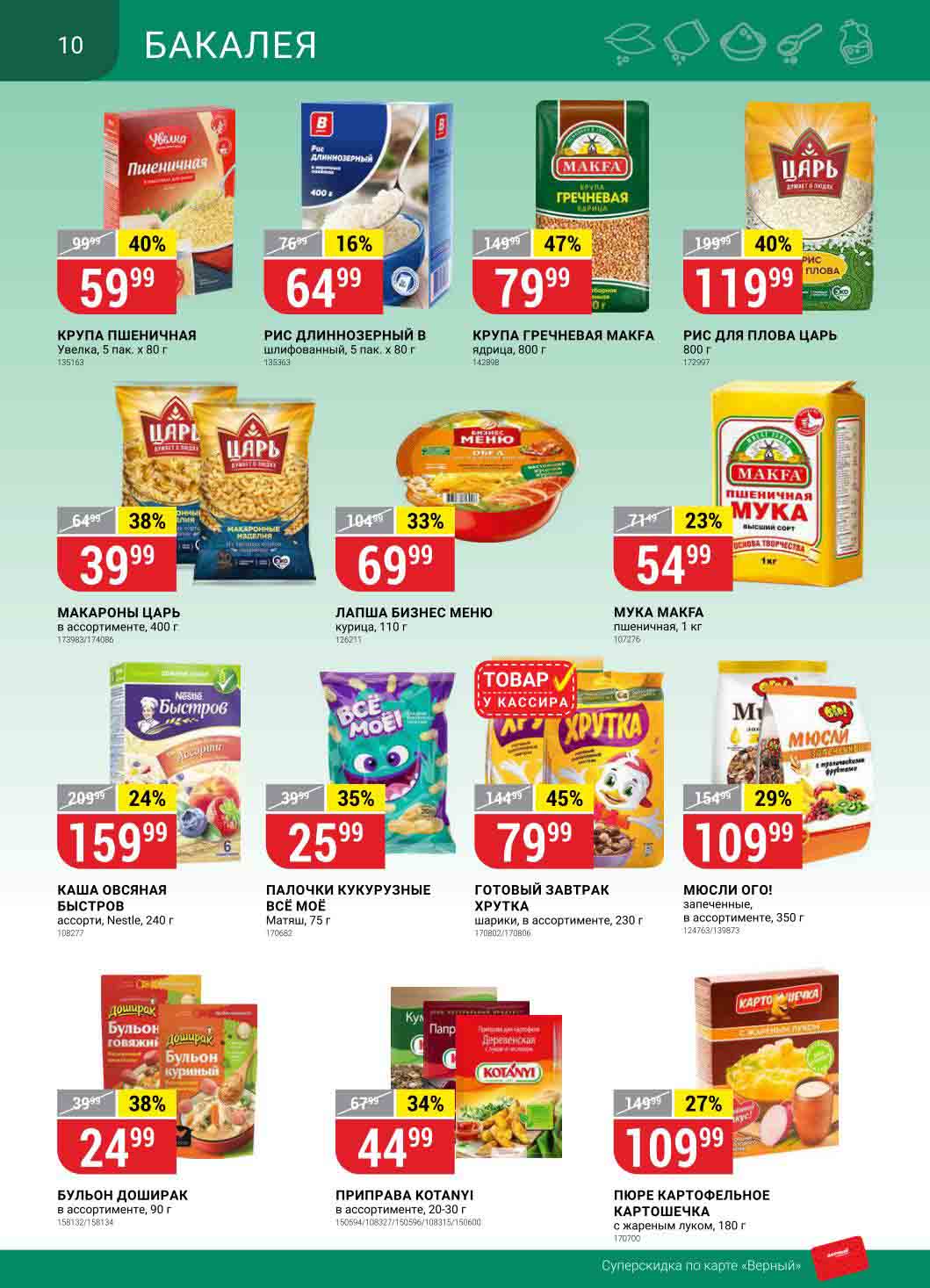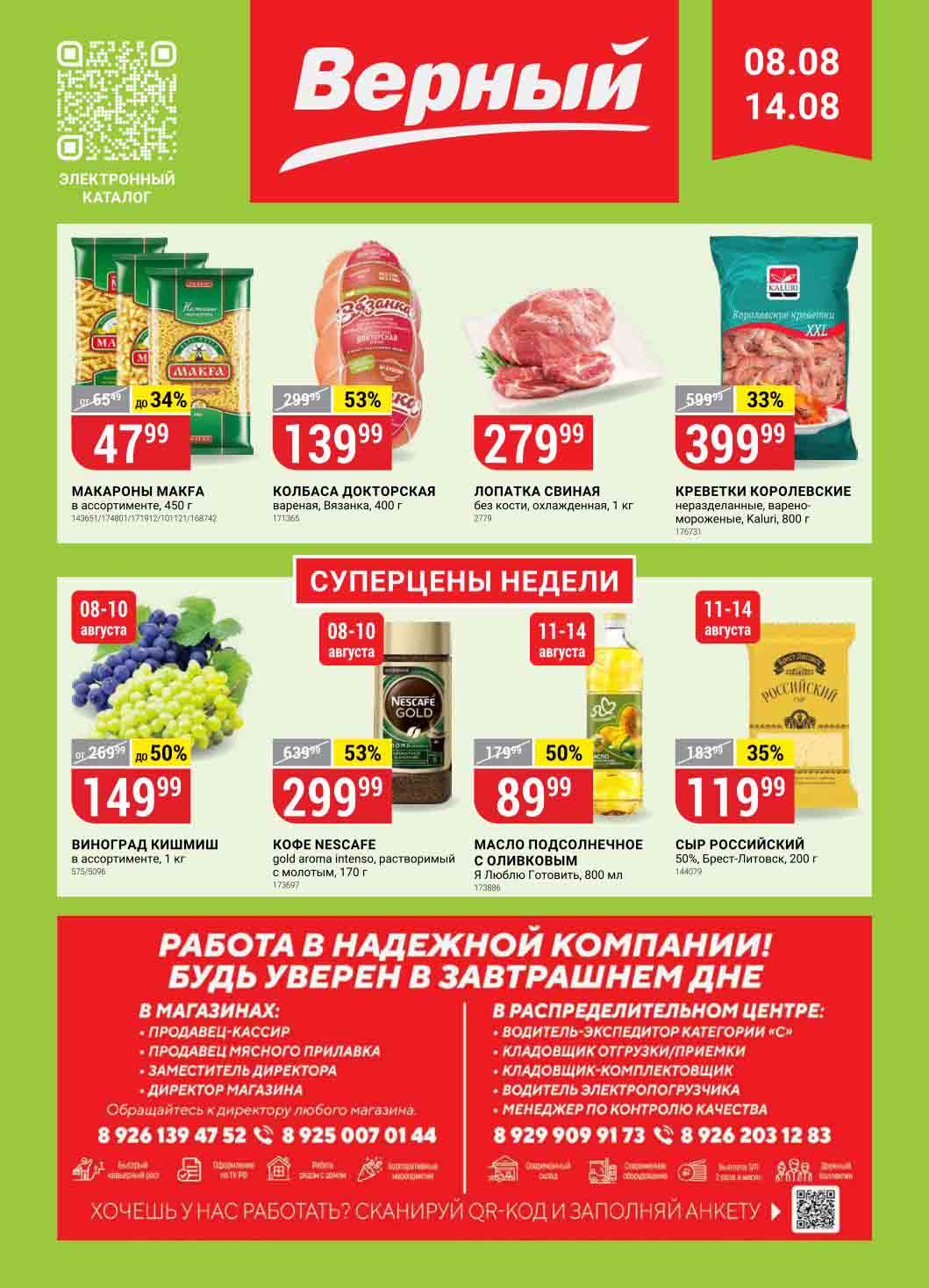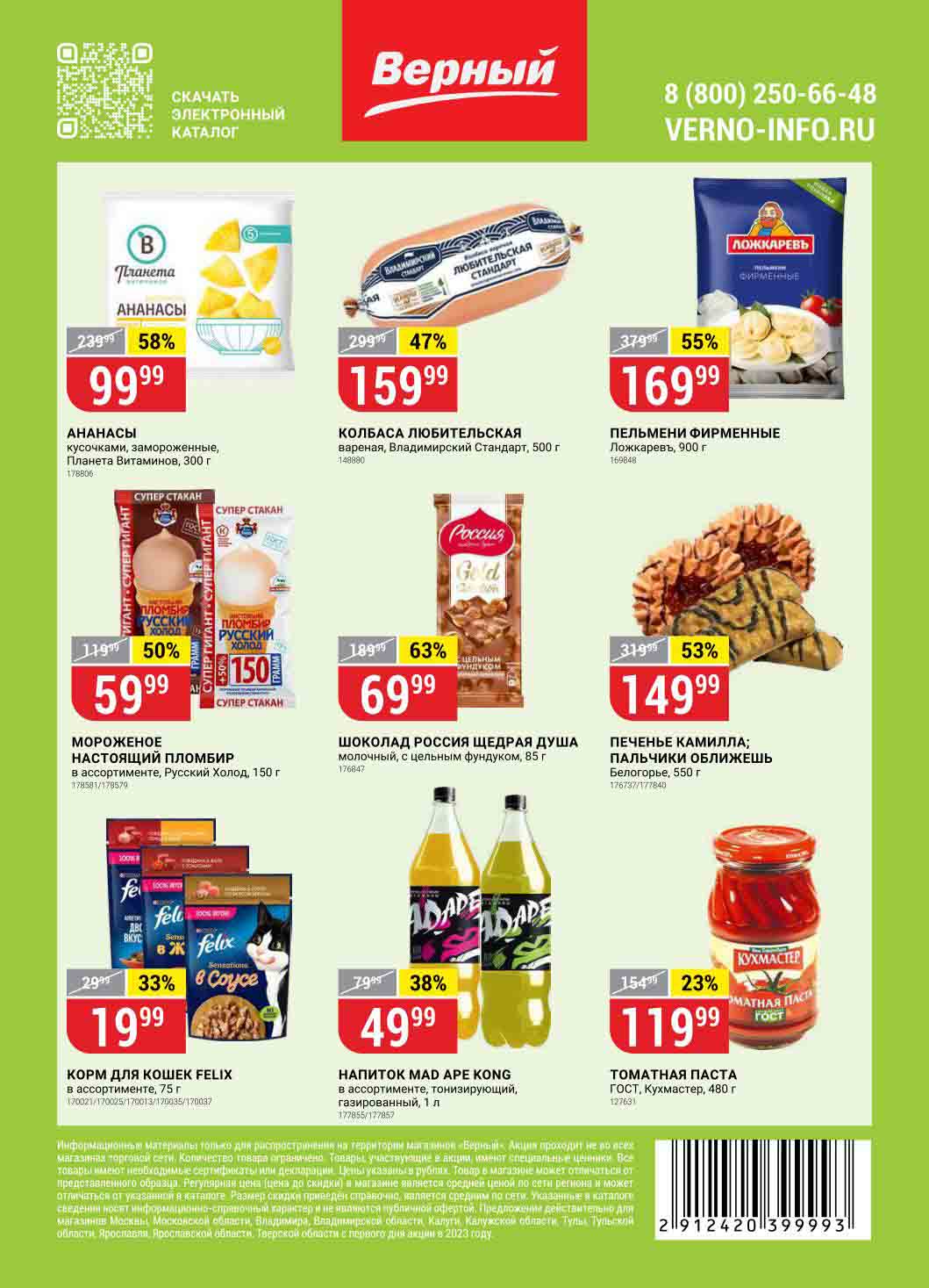 На страницах каталога Верный вы найдете все свои любимые товары, которые сейчас предлагаются в супермаркете. Еженедельное снижение цен на определенные виды, как продовольственных, так и хозтоваров. Цены по акции Верный действуют в городах: Москва, Балашиха, Химки, Подольск, Королев, Мытищи, Люберцы, Электросталь, Коломна, Одинцово, Железнодорожный, Серпухов, Орехово-Зуево, Красногорск, Щелково, Сергиев Посад, Пушкино, Жуковский, Ногинск, Раменское, Клин, Воскресенск, Домодедово и многих других населенных пунктах Московского региона.