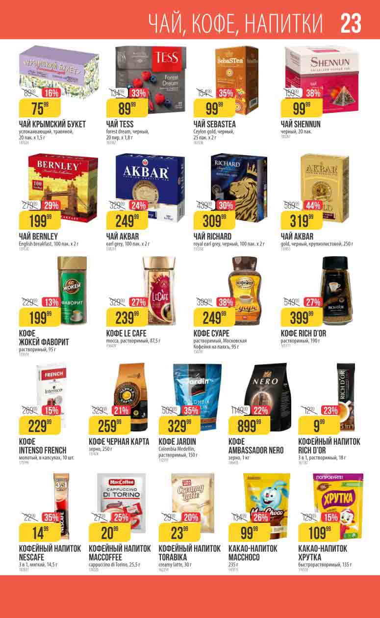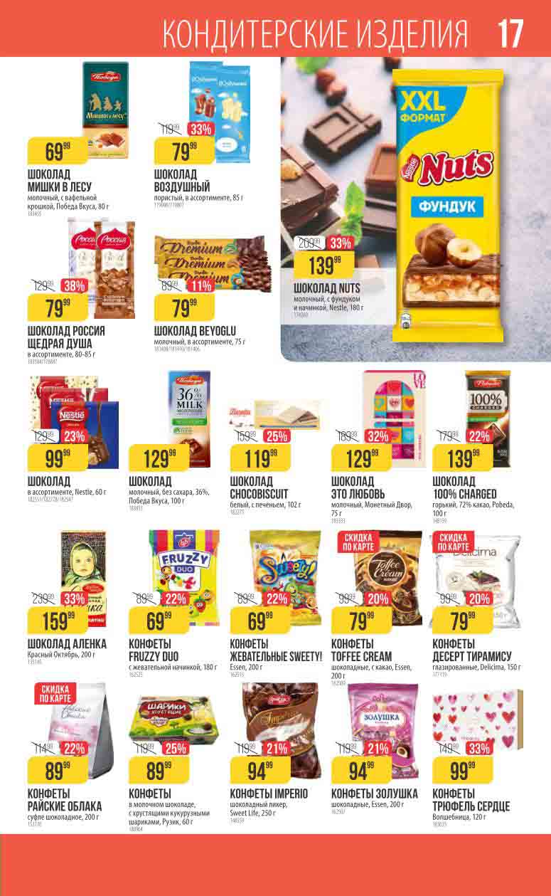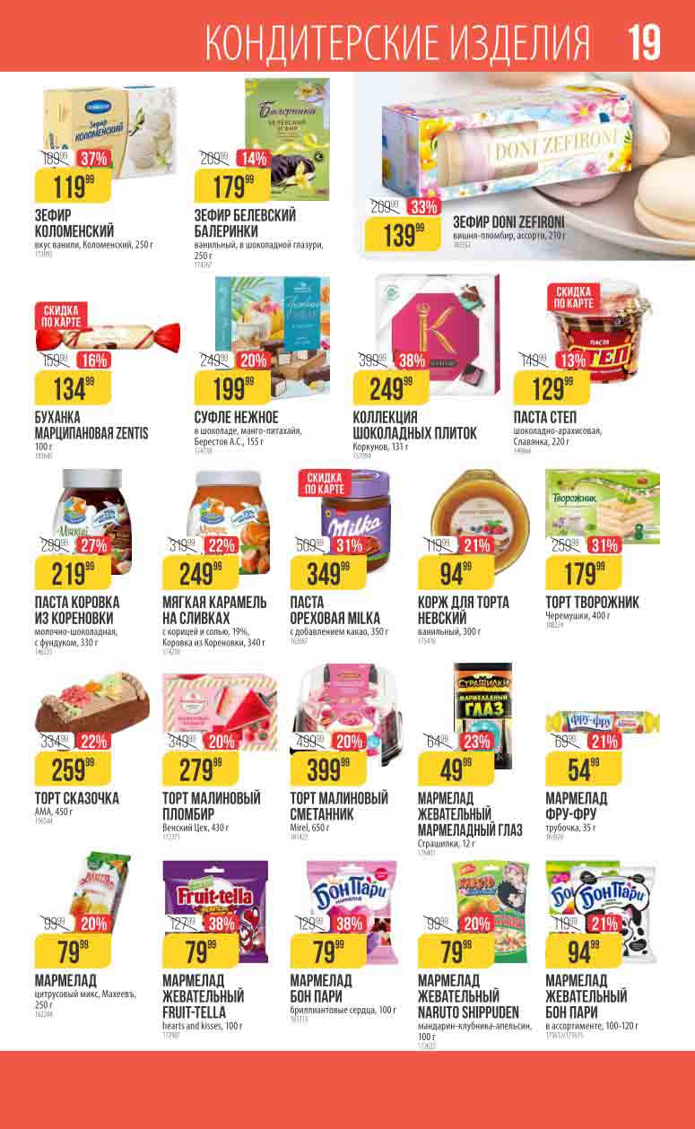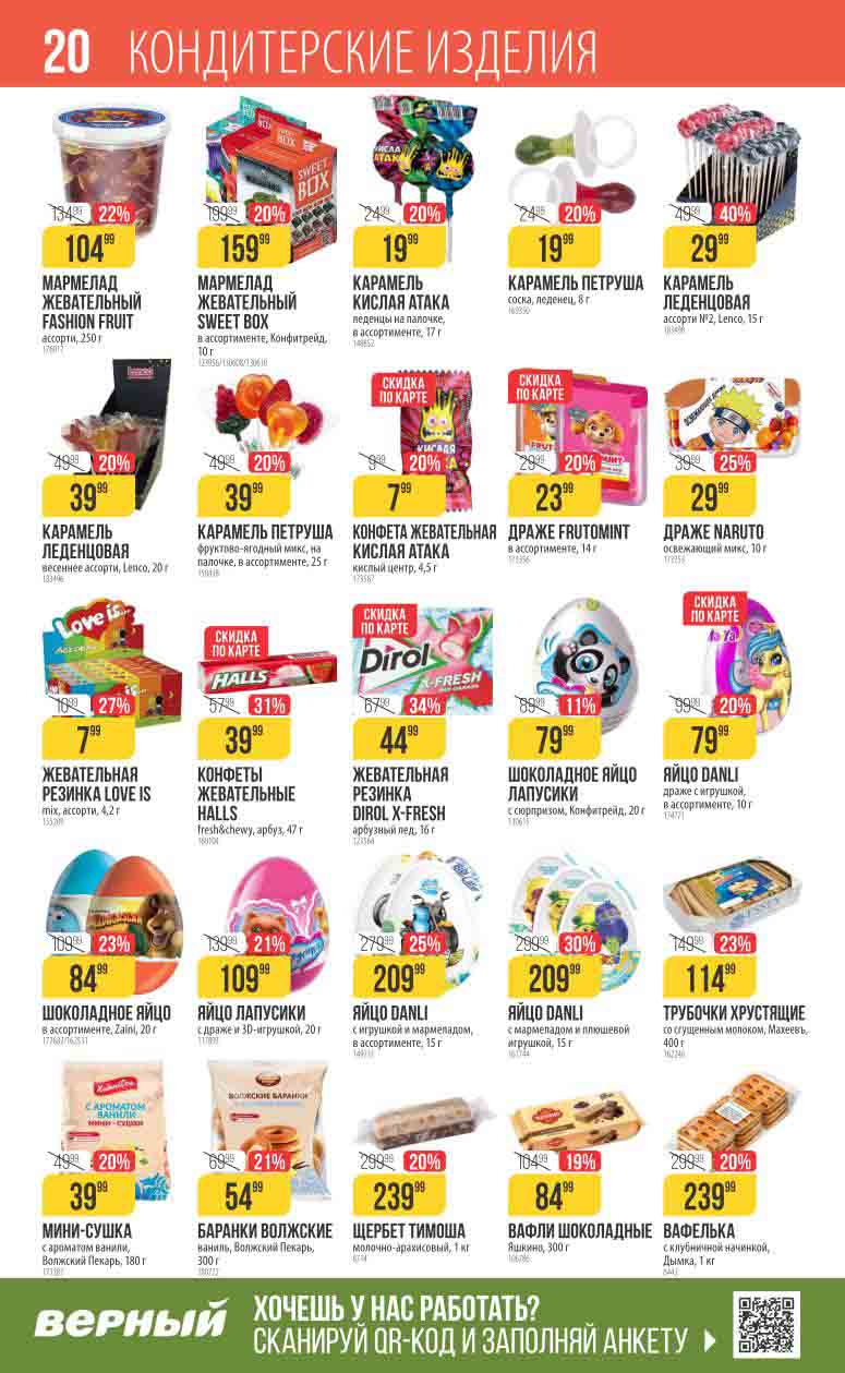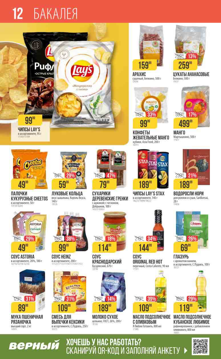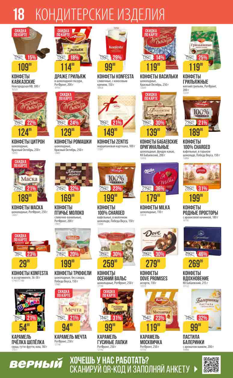 На страницах каталога Верный вы найдете все свои любимые товары, которые сейчас предлагаются в супермаркете. Еженедельное снижение цен на определенные виды, как продовольственных, так и хозтоваров. Цены по акции Верный действуют в городах: Москва, Балашиха, Химки, Подольск, Королев, Мытищи, Люберцы, Электросталь, Коломна, Одинцово, Железнодорожный, Серпухов, Орехово-Зуево, Красногорск, Щелково, Сергиев Посад, Пушкино, Жуковский, Ногинск, Раменское, Клин, Воскресенск, Домодедово и многих других населенных пунктах Московского региона.