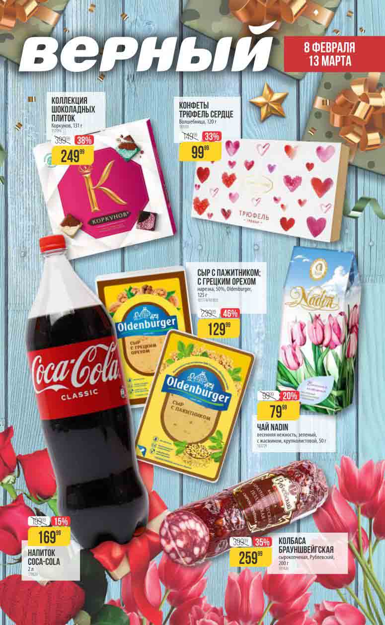 каталог «верный» 08.02.2024-13.03.2024подарки к 8 марта 2024специальные цены на сырымолочная продукциятовары для детейсосиски и колбасызамороженные продуктырыба и морепродукты