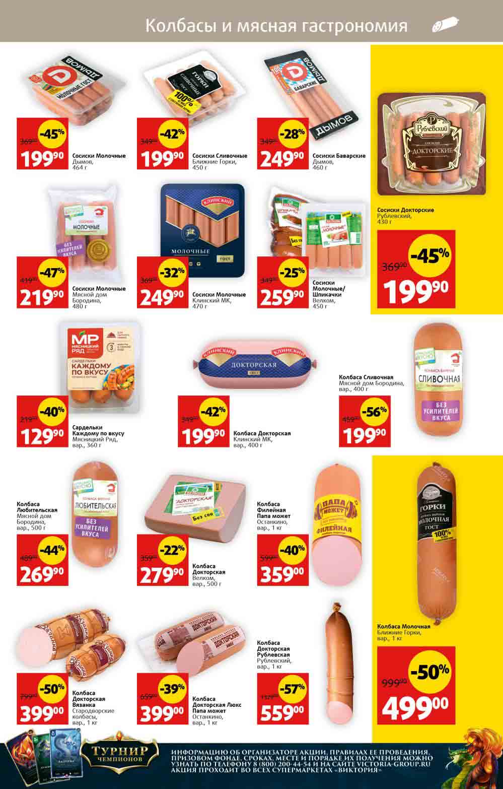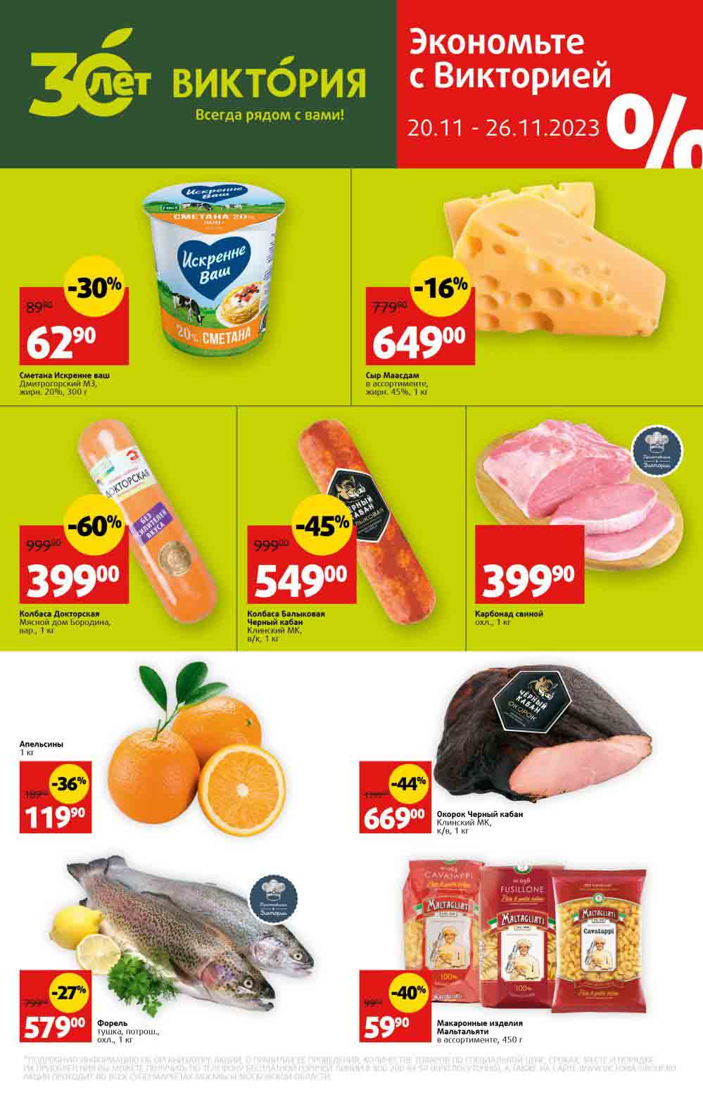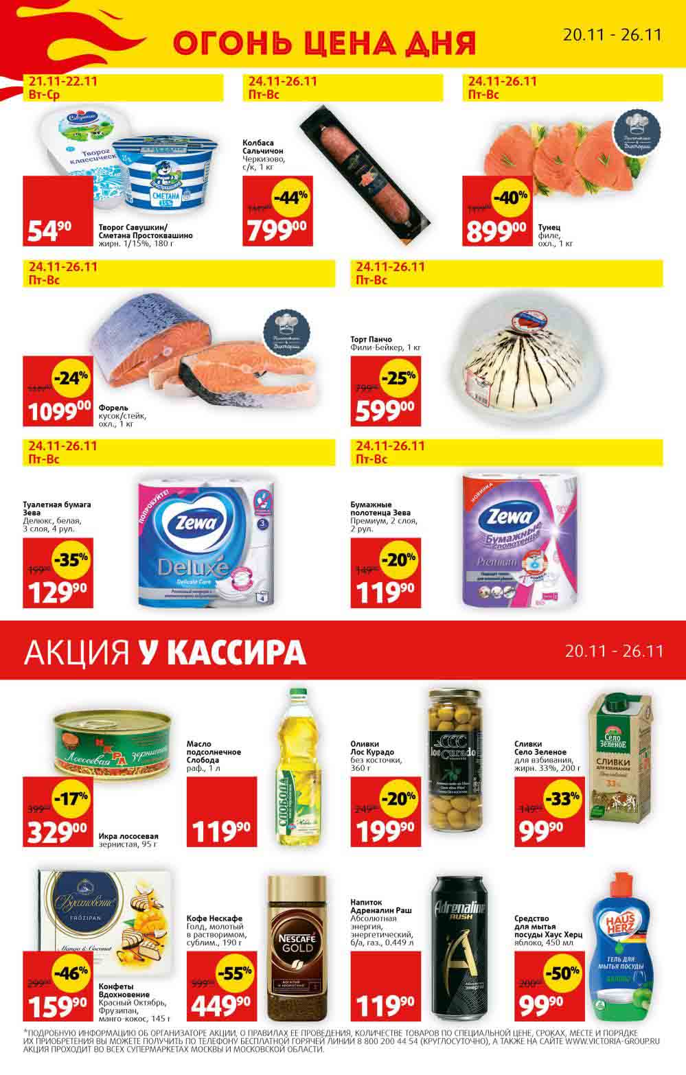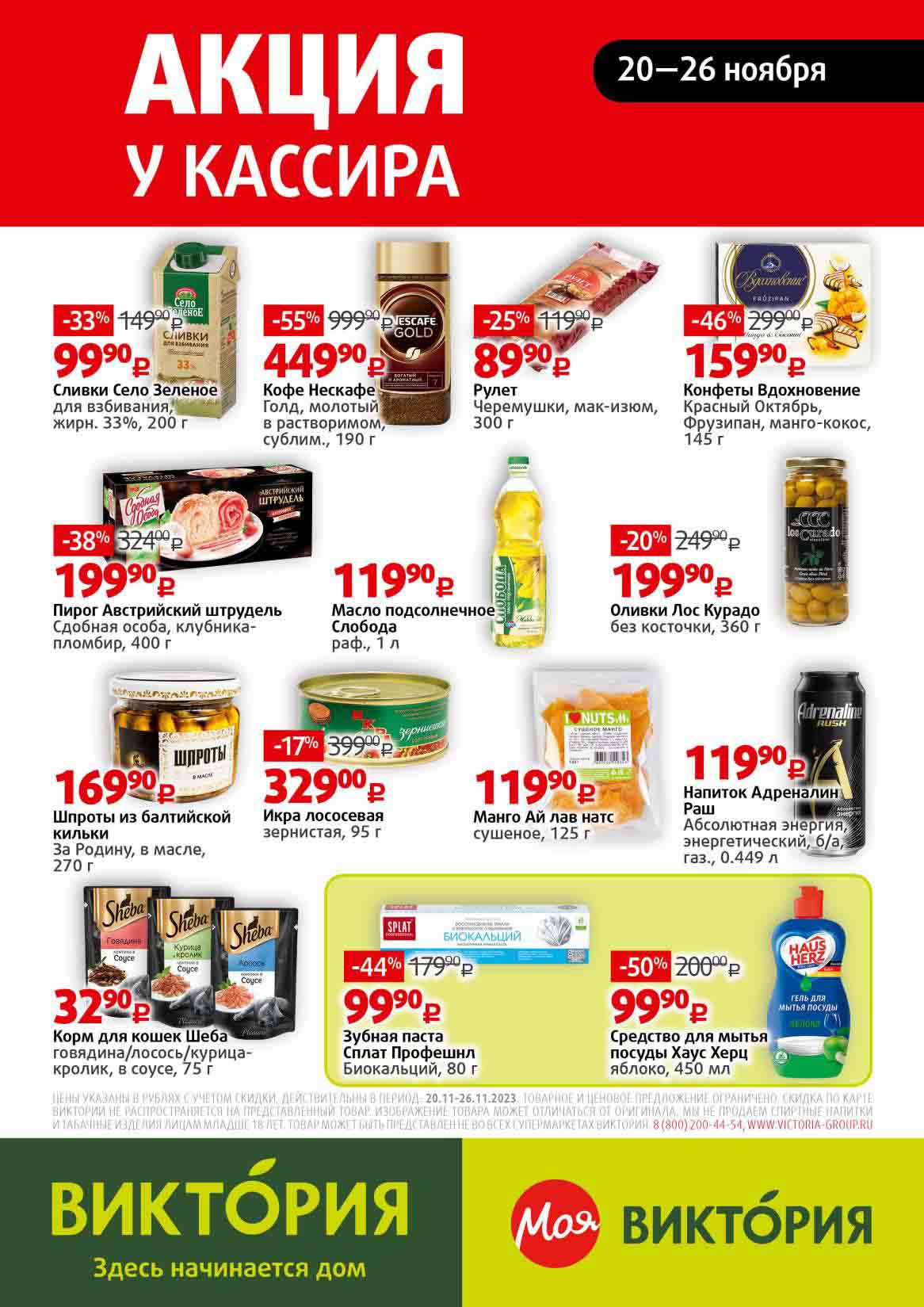 На сегодня 11.11.2025 магазины Виктория в городах: Москва, Химки, Люберцы, Железнодорожный, Красногорск, Долгопрудный, Лыткарино, Реутов и многих других населенных пунктах Московского региона ЗАКРЫТЫ. Действующих каталогов акций "Виктория" в этих городах нет. Компания X5 Group выкупила сеть и весной 2024 года закрылась последняя «Виктория» в Москве.